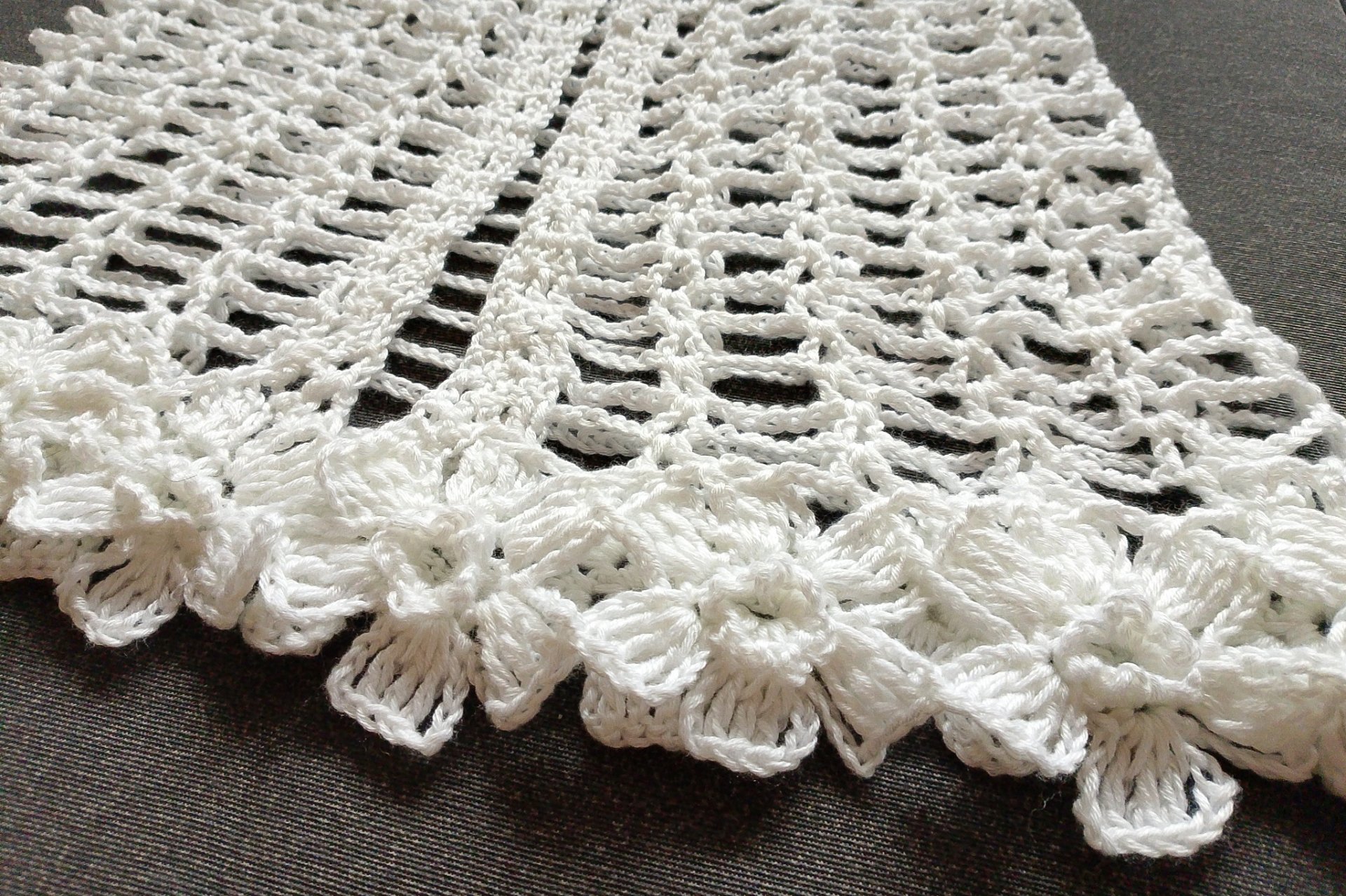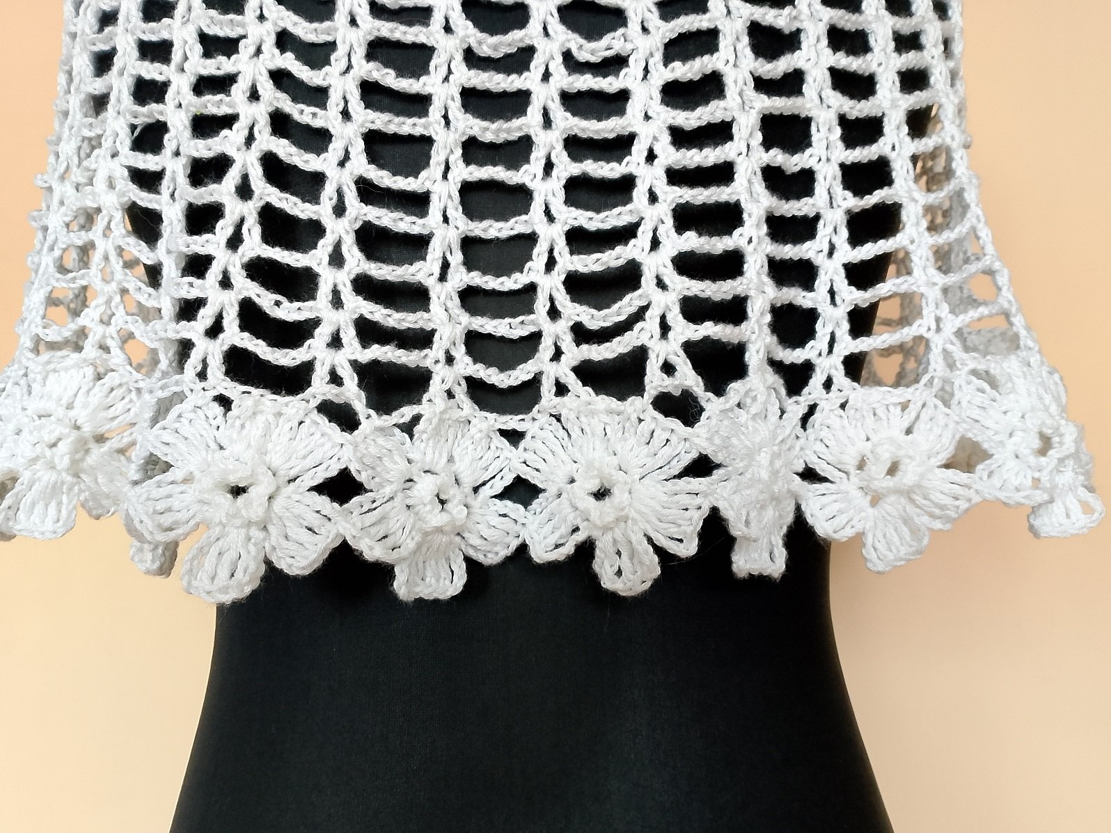 Śliczna komunijna pelerynka wykonana w całości ręcznie z wyjątkowej jakości włóczki, delikatnej w dotyku, o perłowym połysku, przelewającej się przez palce i jedwabiście gładkiej. Zakończona pięknymi szydełkowymi kwiatami.