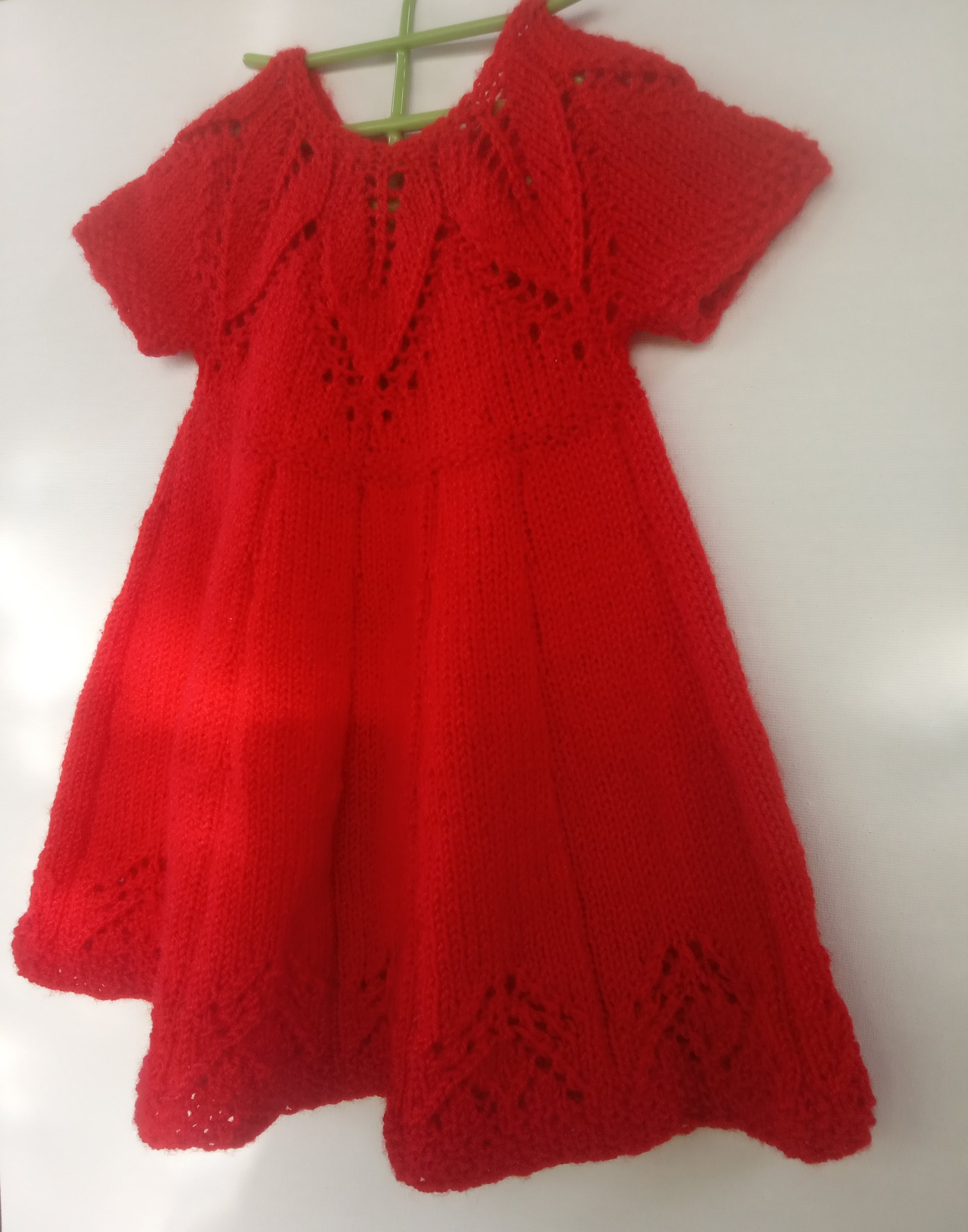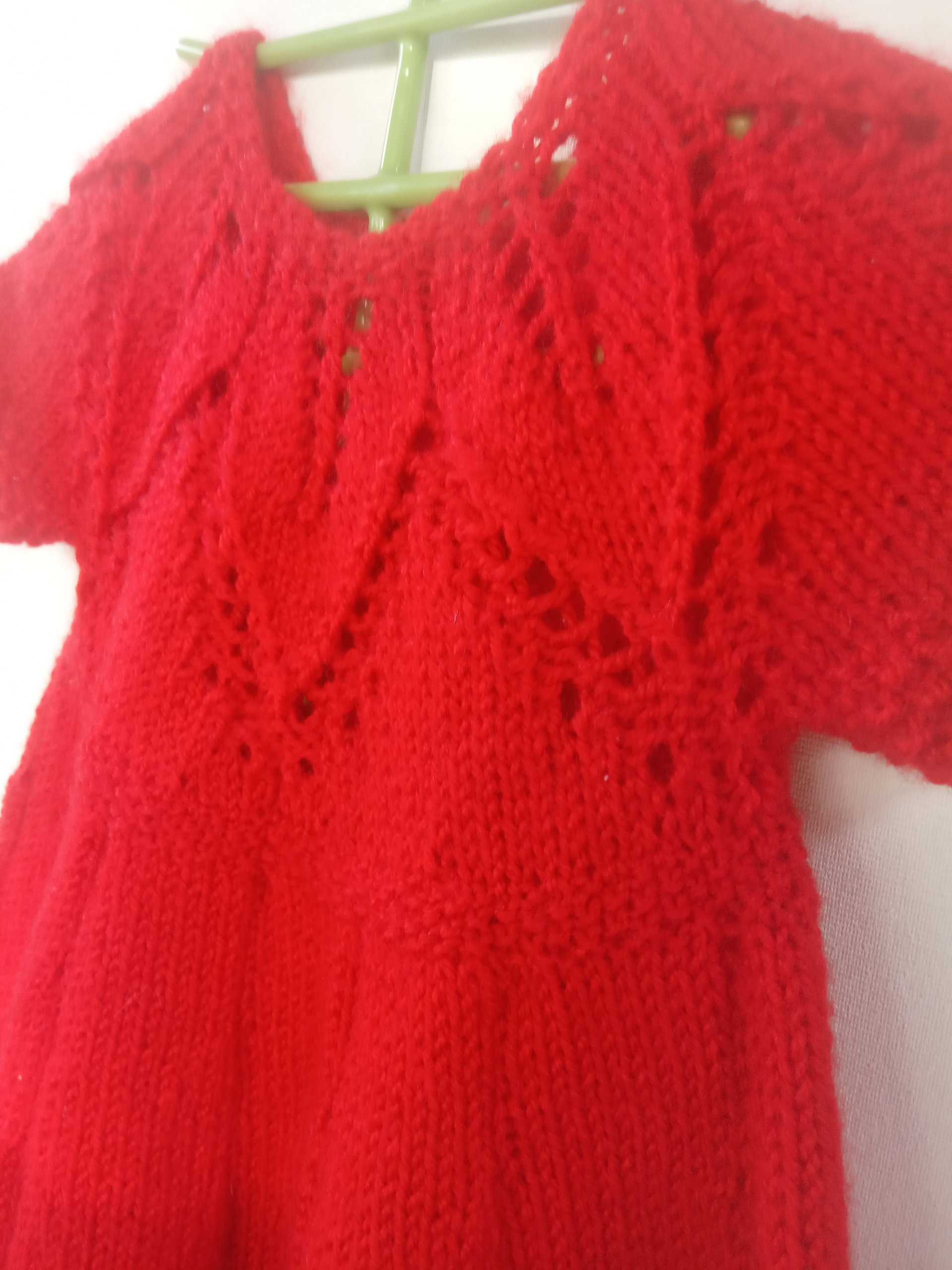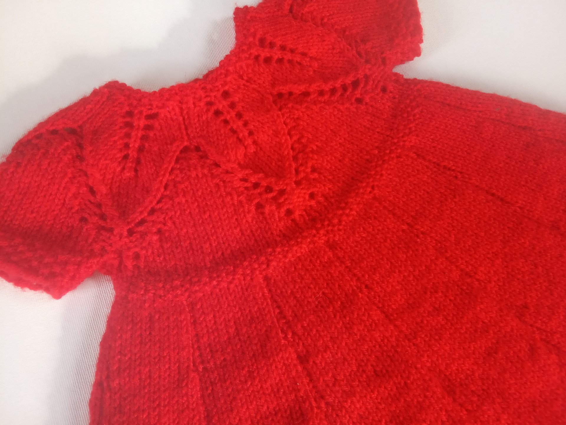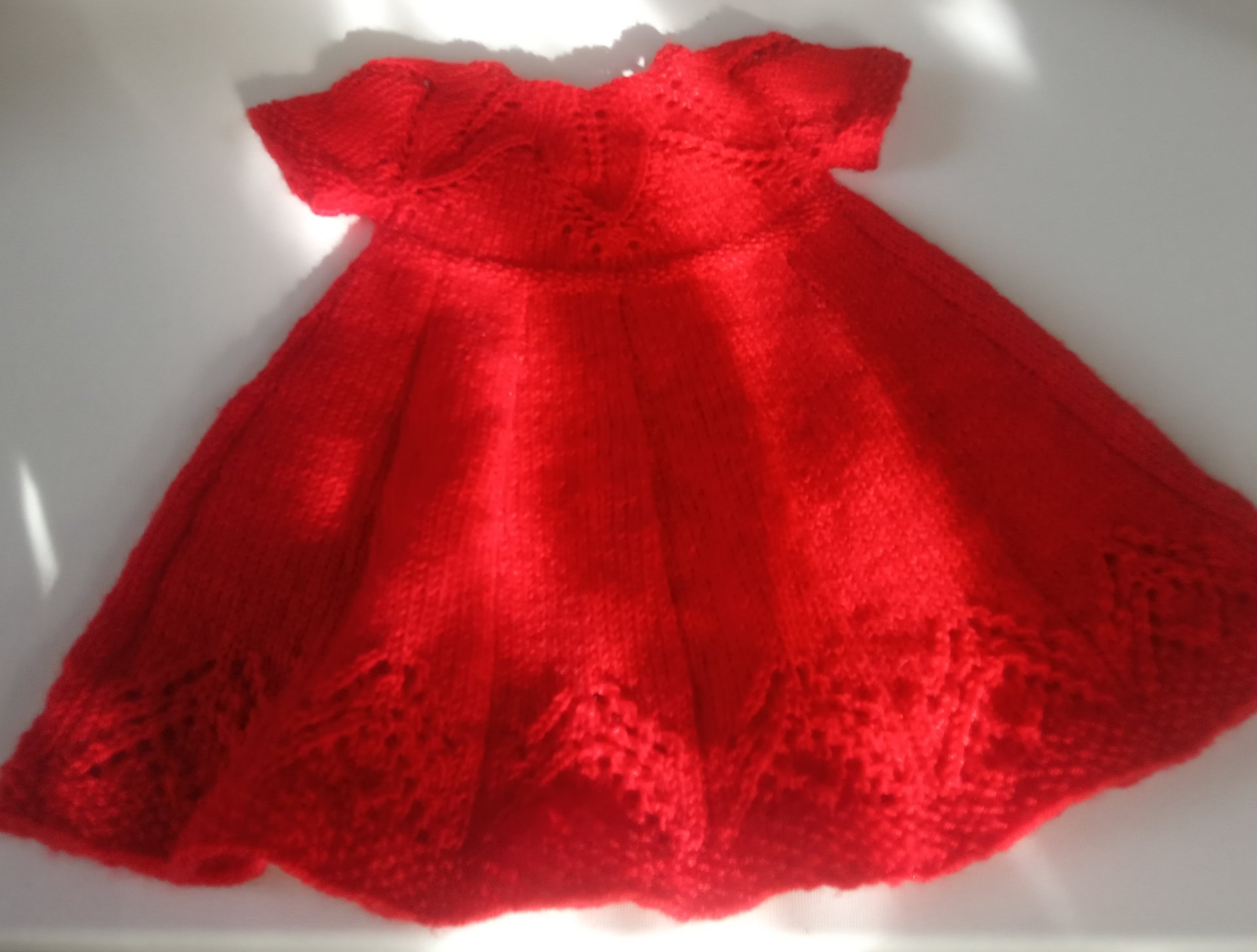 Sukienka wykonana w całości ręcznie na drutach, z wysokiej jakości, delikatnej włóczki akrylowo - merynosowej. Jest niezwykle efektowna, piękny czerwony kolor dodatkowo podkreśla jej urok. Rozkloszowany dół sukienki układa się w miękkie fałdy. Wykonana jest na okrągło - sposobem bezszwowym, w związku z czym jest bardzo wygodna i rozciągliwa. Z tyłu zapinana na ozdobny guziczek.