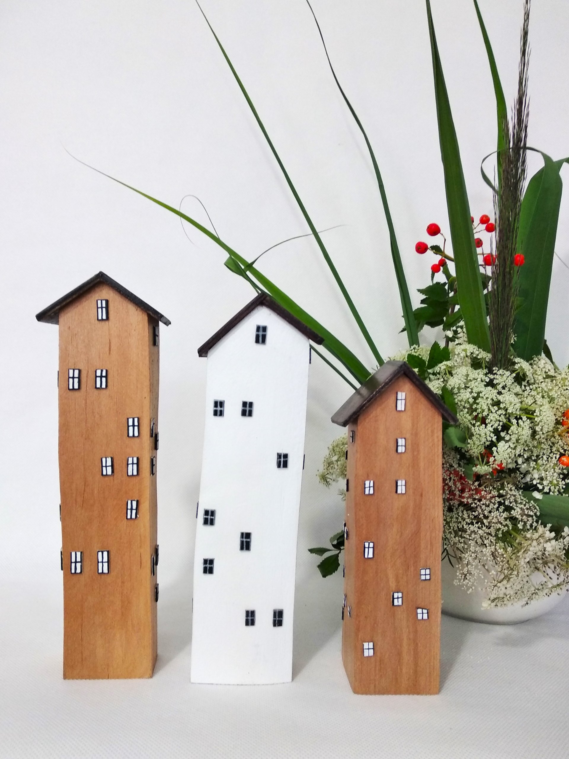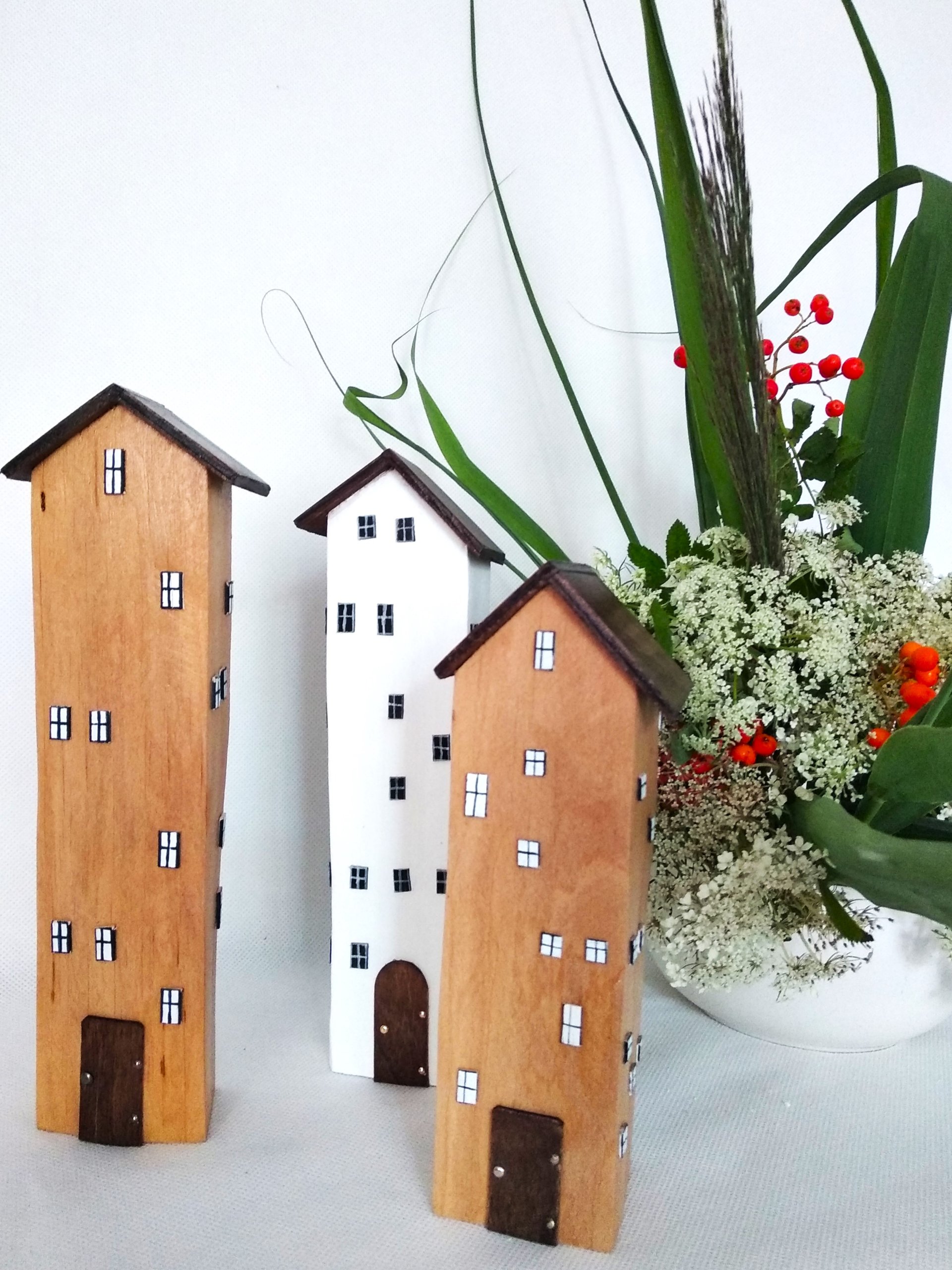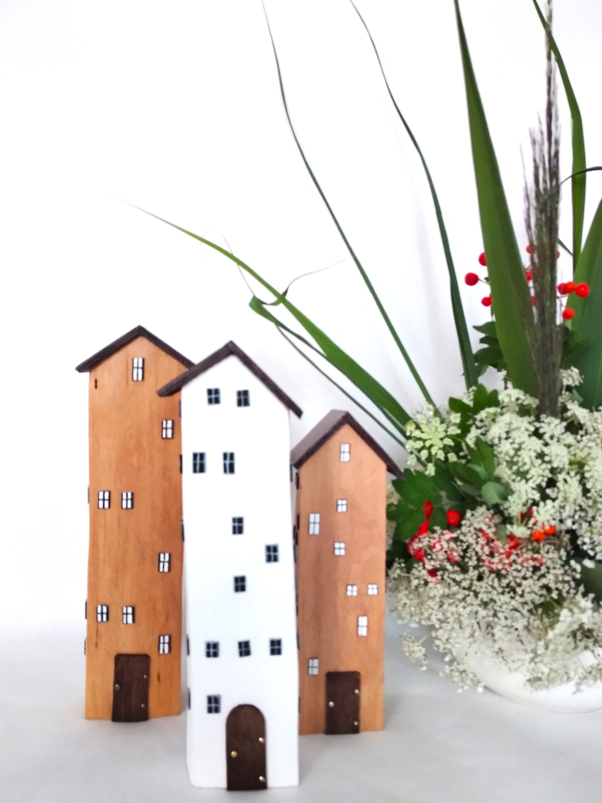 Zestaw trzech ręcznie wykonanych, drewnianych domków to pochwała prostoty i rzemiosła. Dwa z nich zachowują naturalny kolor drewna, trzeci – biały – wprowadza kontrast i równowagę. Surowe linie, brak zbędnych ozdobników i geometryczna forma nadają im nowoczesny, a jednocześnie ciepły charakter.
