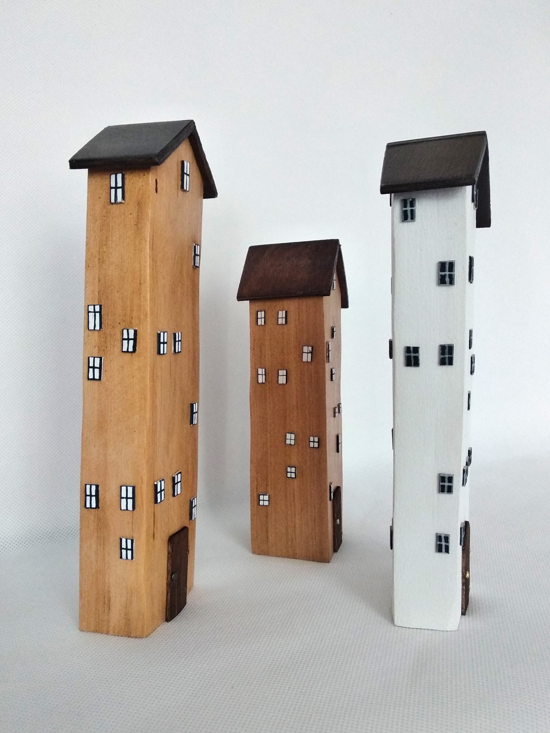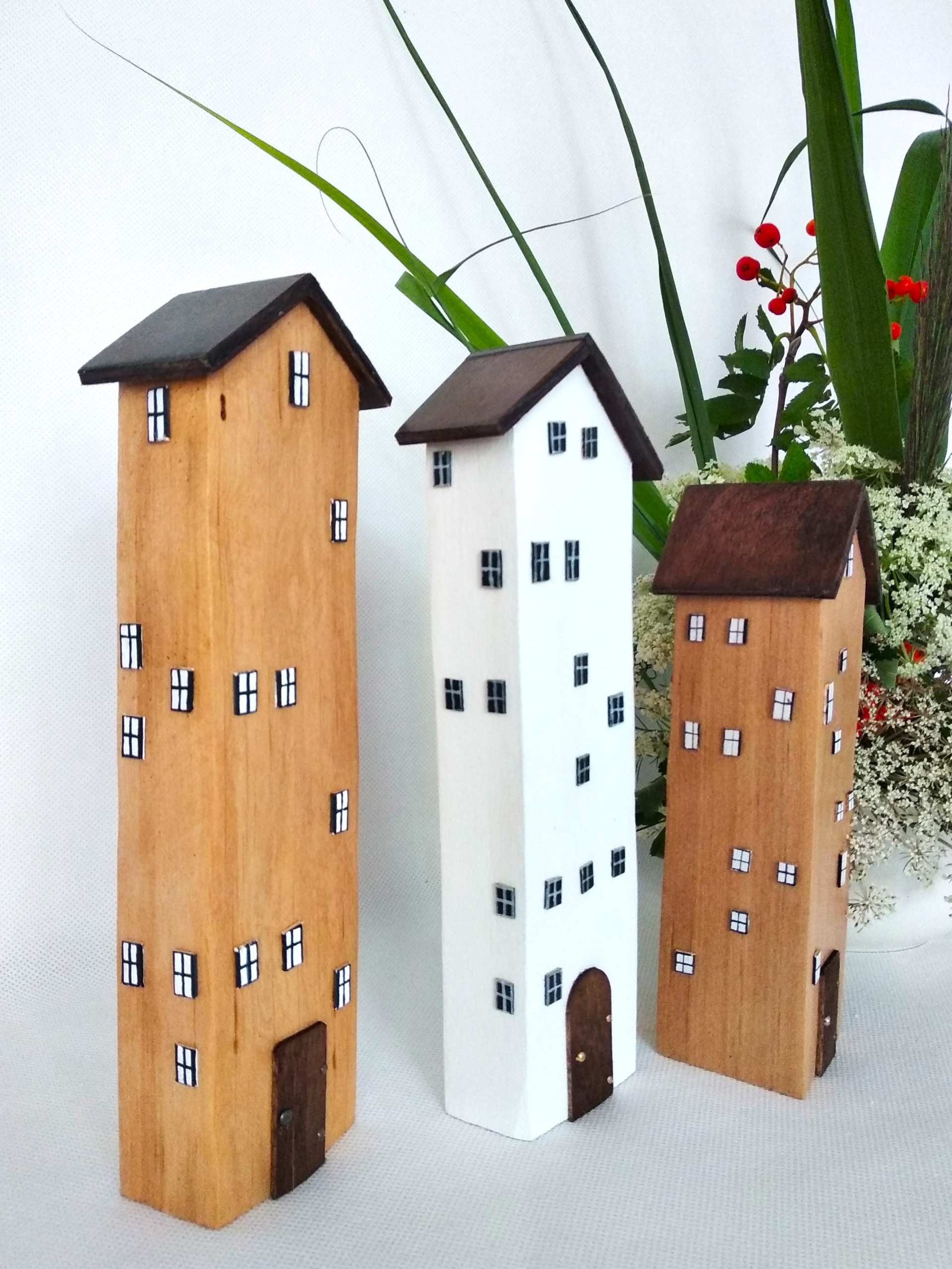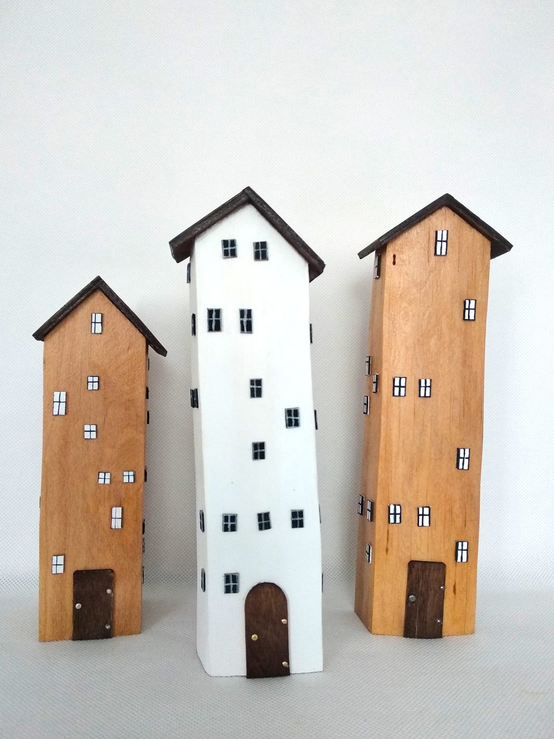 Zestaw trzech ręcznie wykonanych, drewnianych domków to pochwała prostoty i rzemiosła. Dwa z nich zachowują naturalny kolor drewna, trzeci – biały – wprowadza kontrast i równowagę. Surowe linie, brak zbędnych ozdobników i geometryczna forma nadają im nowoczesny, a jednocześnie ciepły charakter.