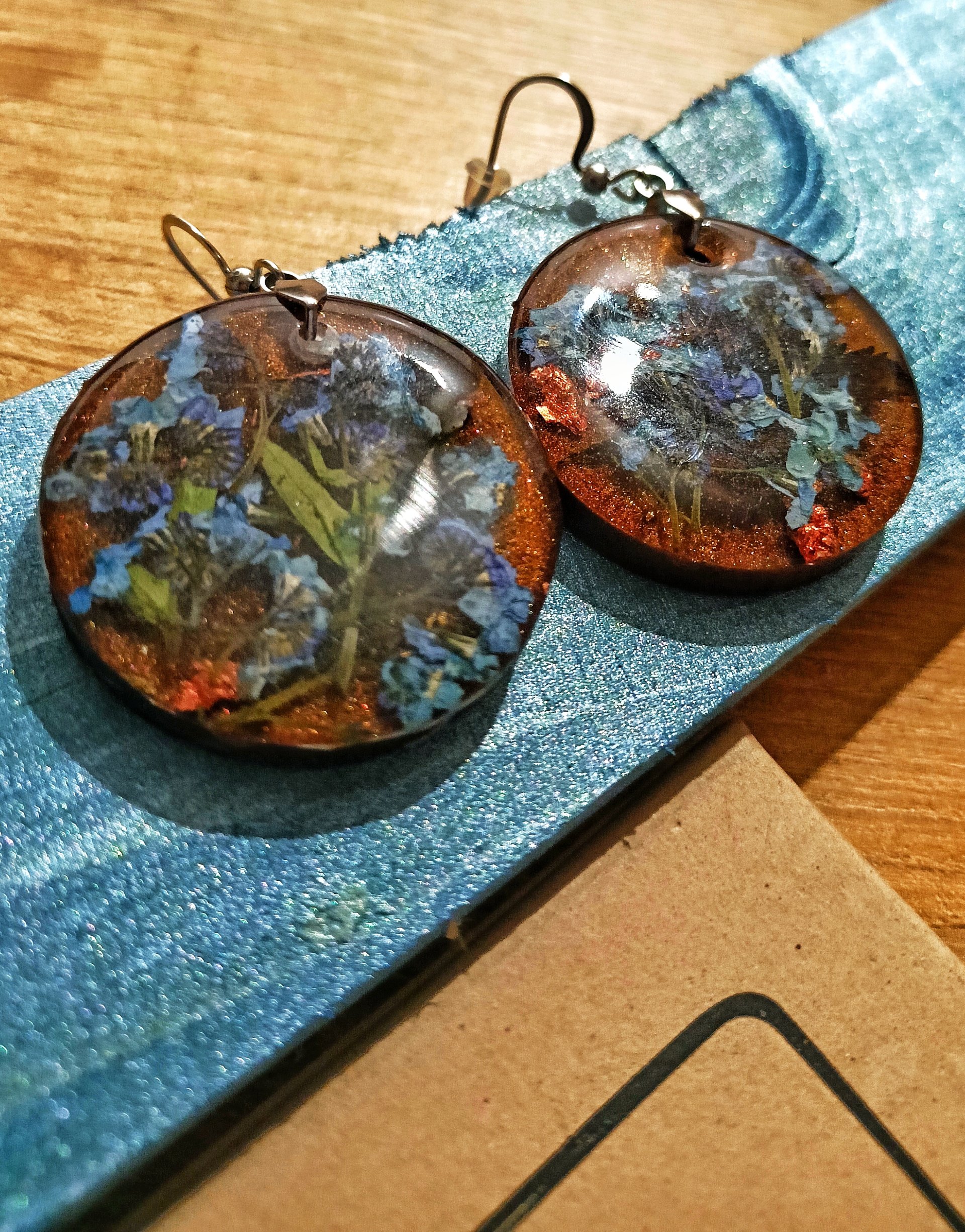 duże kolczyki z żywicy, kolczyki z niezapominajkami, biżuteria z kwiatami, kolczyki handmade, kolczyki stal nierdzewna, duże kolczyki boho, prezent dla kobiety, kolczyki z suszonymi kwiatami, biżuteria naturalna, kolczyki statement, ręcznie robiona biżuteria