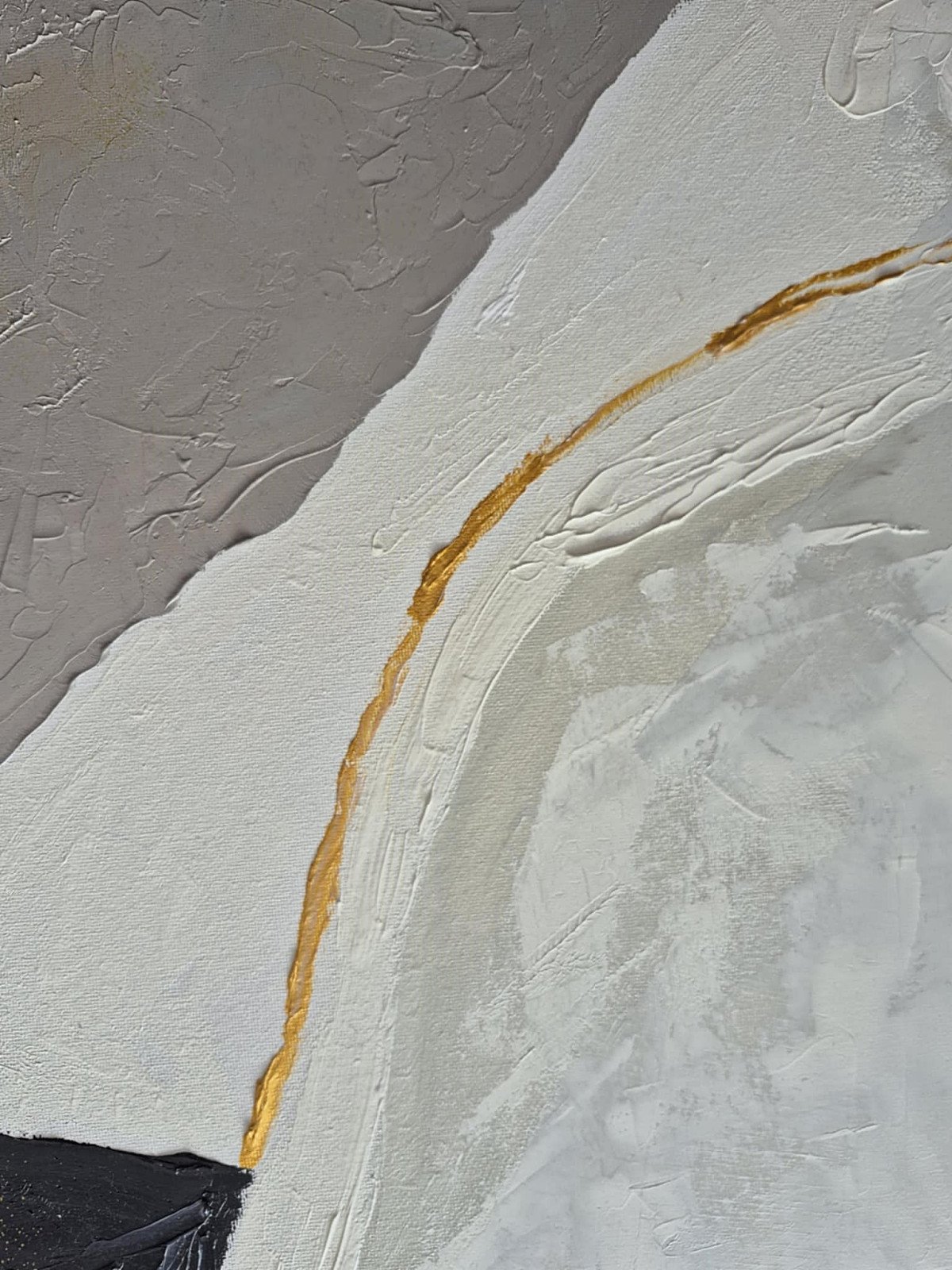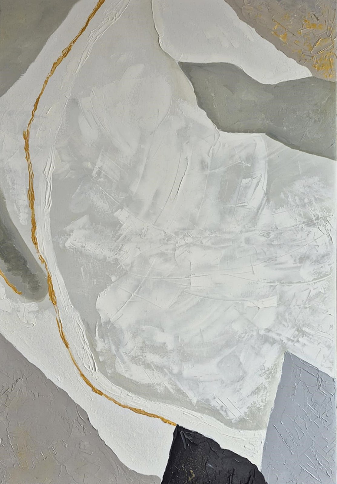 Abstrakcyjny obraz na płótnie – dużo bieli i jasnych szarości, z wyraźną fakturą grubych warstw farby. Przez kompozycję biegnie cienka złota linia, trochę jak pęknięcie w kamieniu albo żyła w marmurze
