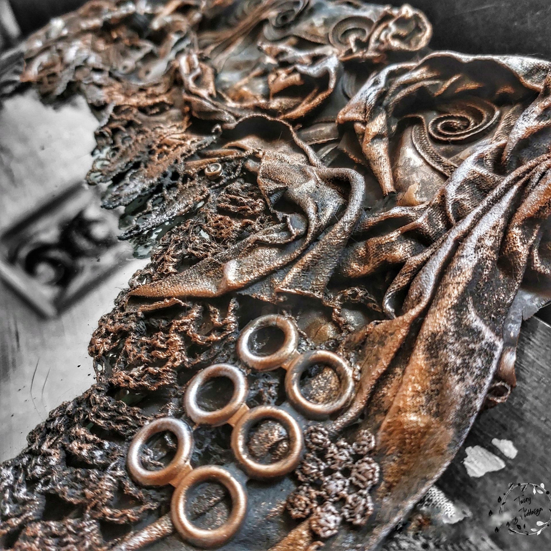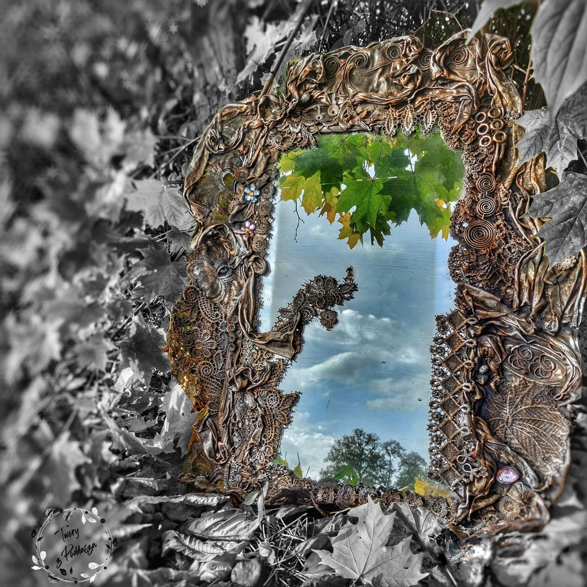 "W magicznym miejscu - w zacisznym lesie tańczące Elfy wznoszą się w górę tworząc z kwiatów cudowny ażurek" (Helena Szymko) ręcznie zdobione w technice utwardzania tkanin zwierciadło, pełne elfiej magii 70x55 cm