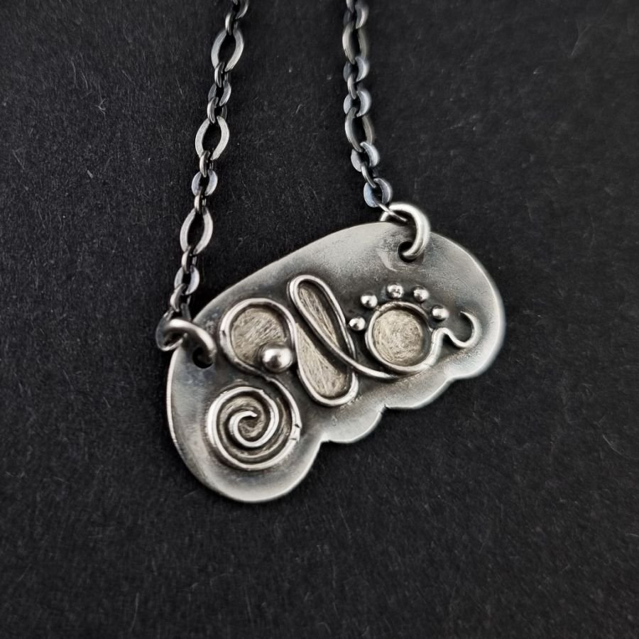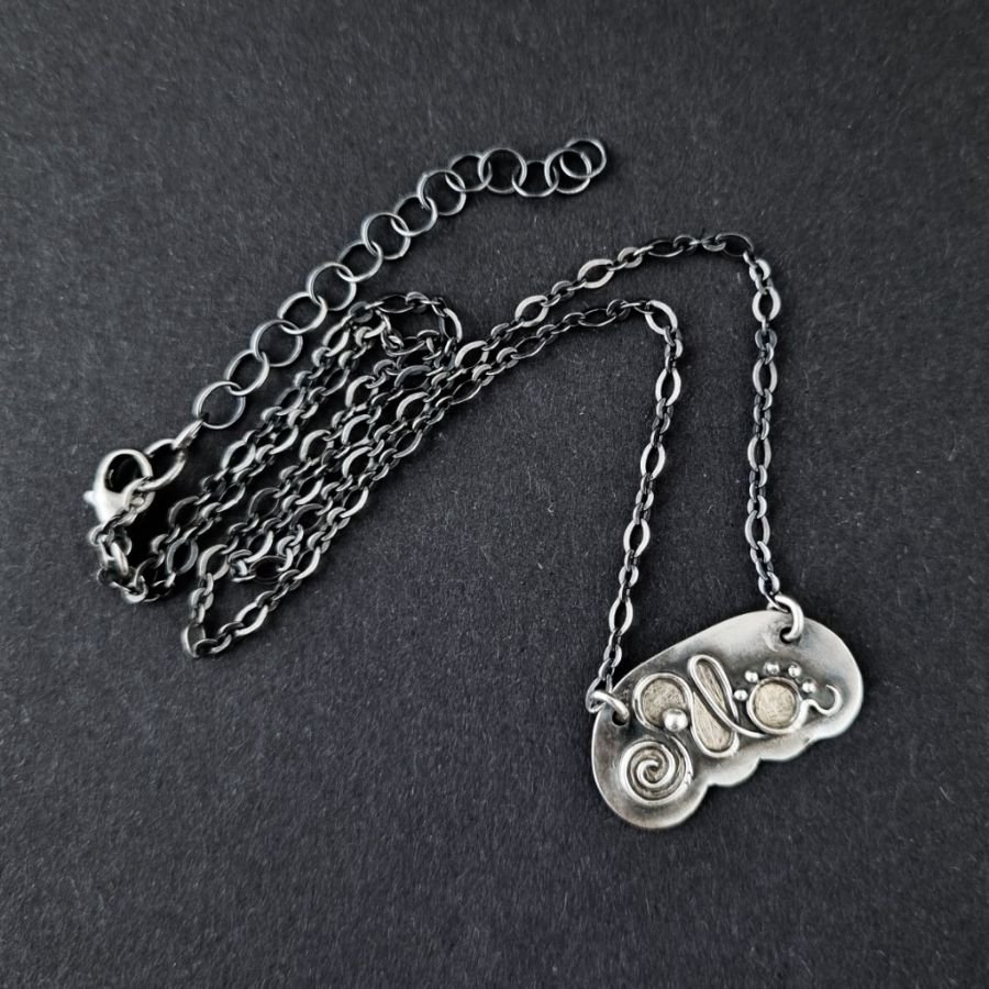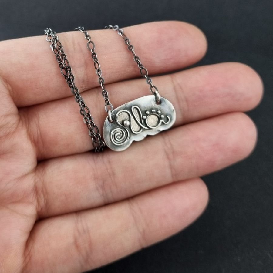 Idealny prezent na Chrzest, Komunię, urodziny, imieniny. Personalizowany naszyjnik dla dziewczynki o imieniu Ala. Srebro 999 i 925. Blacha ręcznie wycinana, szlifowana, lutowana, oksydowana [przyciemniana], przecierana i drapana / satynowana. Napis "Ala" wypolerowany [wysoki połysk]. Obwód łańcuszka został dostosowany do dziecięcej szyi - 36 cm, wliczając krawędź blaszki znajdującą się między ogniwami [+ łańcuszek o większych oczkach, który stanowi przedłużenie do 41 cm w sumie]. Blaszka ma wymiary: 2,3 x 1,3 cm. Istnieje możliwość zamówienia naszyjnika z dowolnym imieniem, innym obwodem, z kolorowymi dodatkami [kryształy, kamienie]. Biżuteria zostanie zapakowana w elegancie pudełeczko.