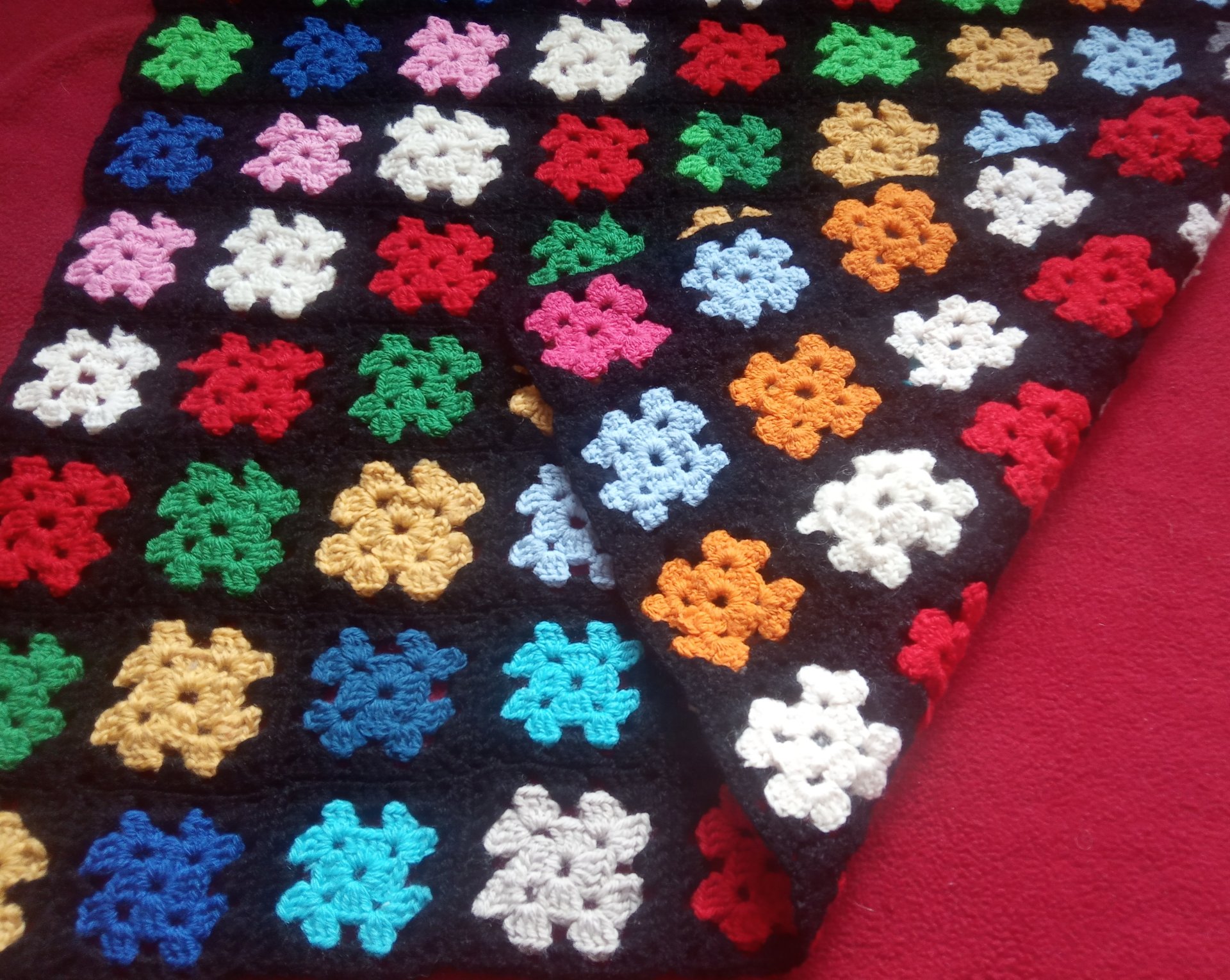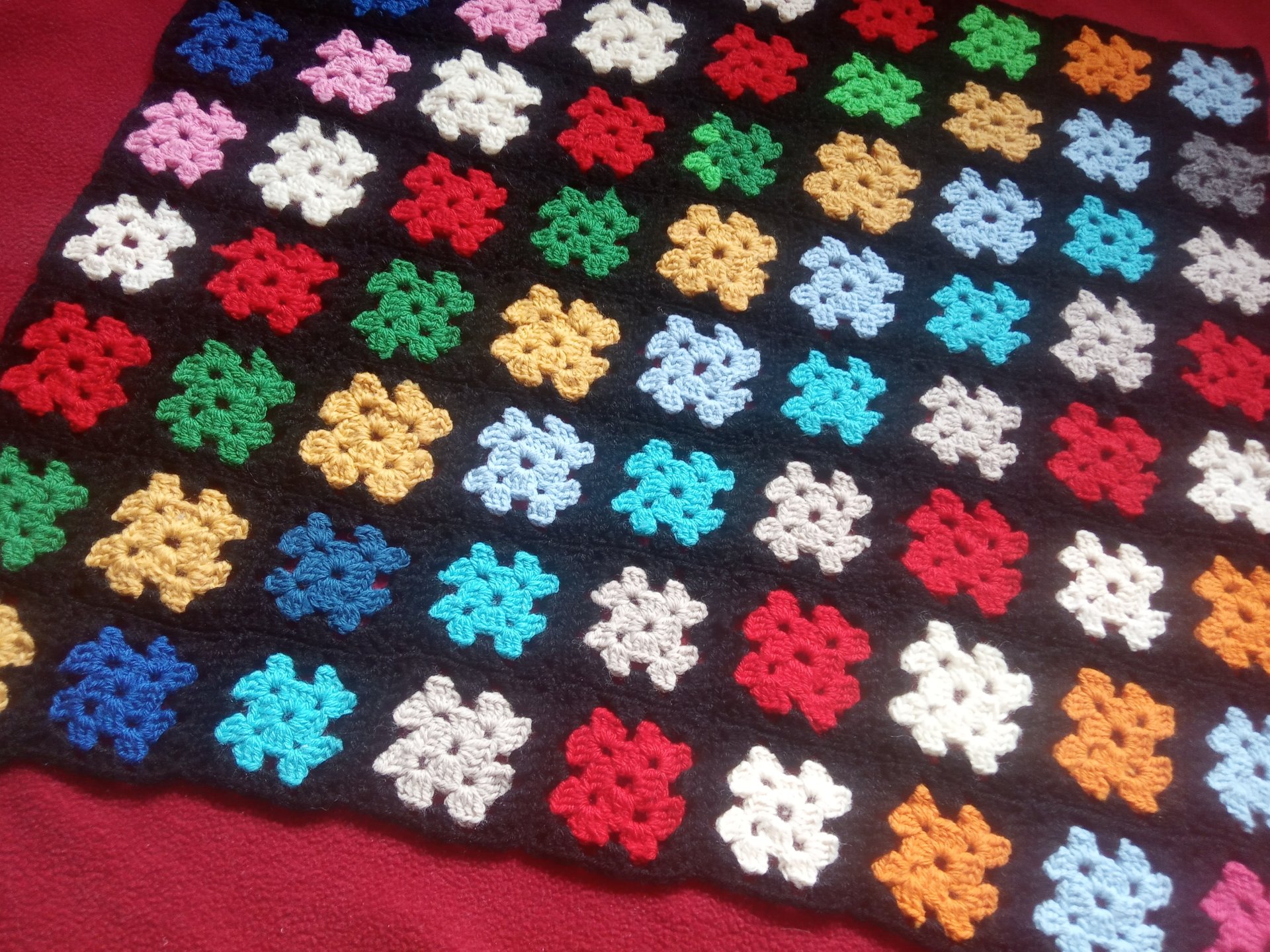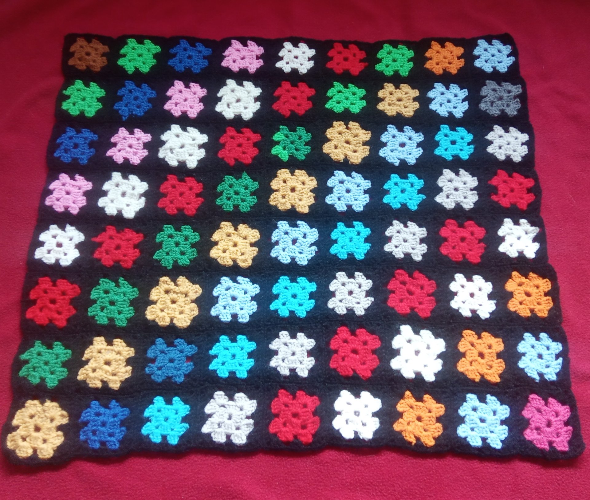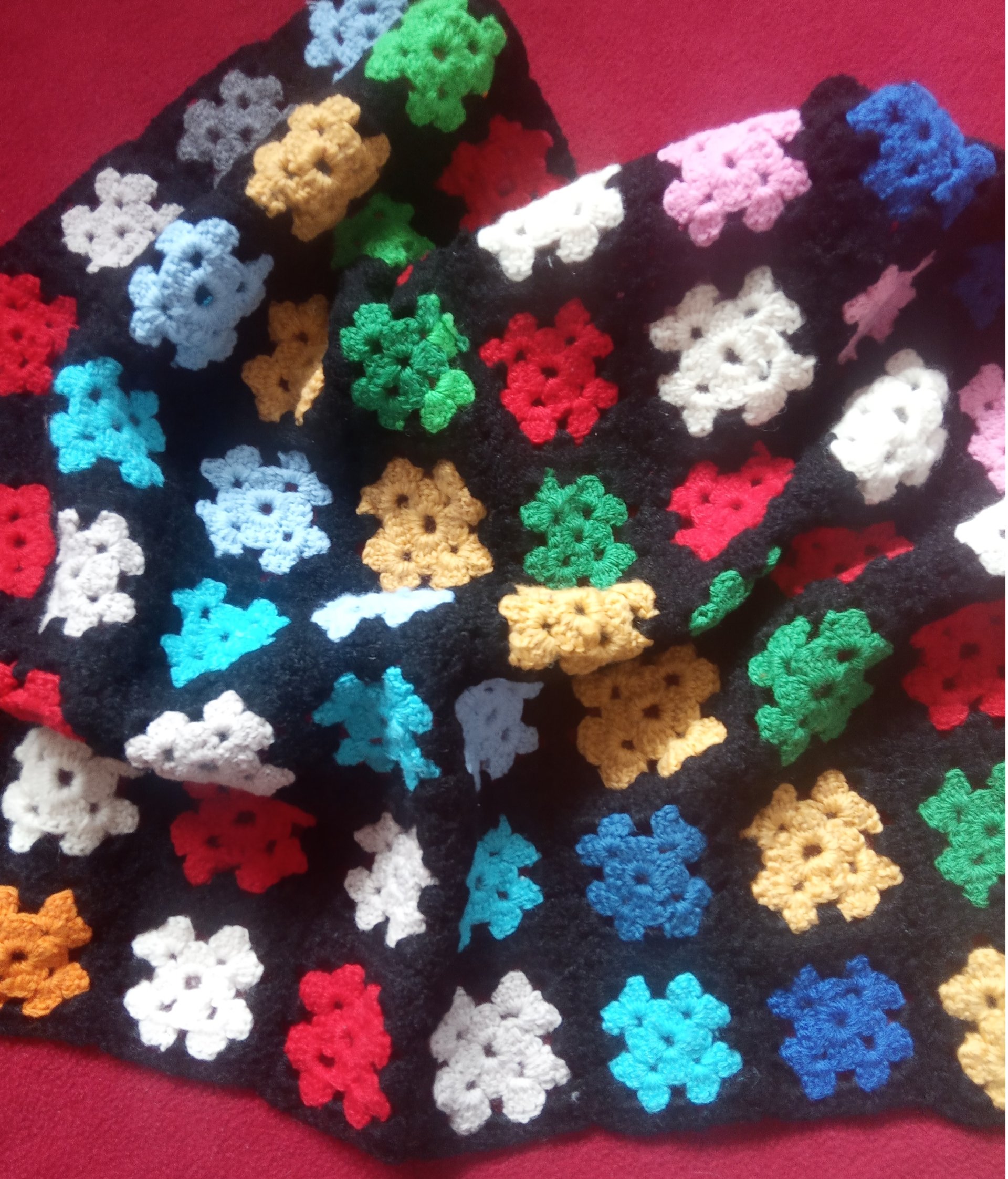Kocyk w całości wykonany ręcznie z małych kwadratów, "metodą babuni". Wymiary 64 cm x 56 cm. Wykonanie wymagało wielu godzin pracy i cierpliwości, w efekcie czego powstała niepowtarzalna, wyjątkowa kompozycja, sprawiająca wrażenie kolorowej mozaiki. Kocyk jest unikatowy, powstał wyłącznie w jednym egzemplarzu.