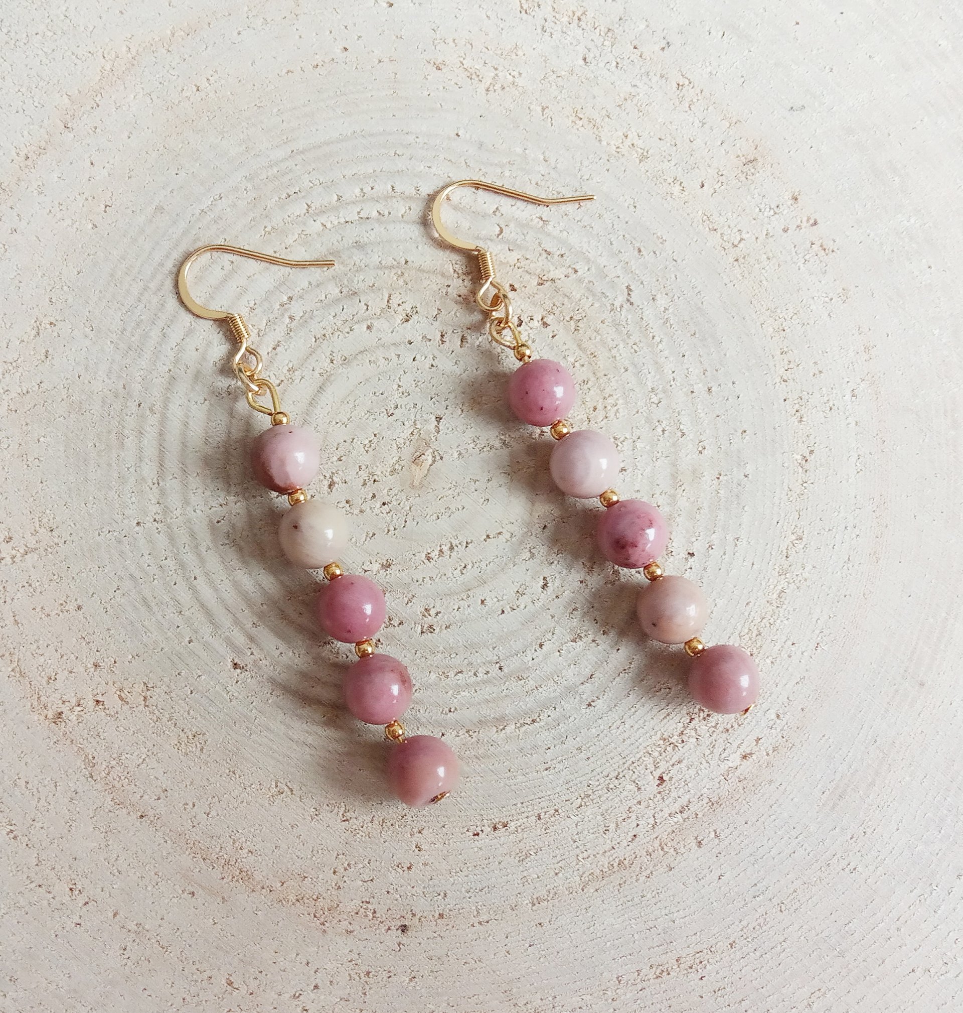 Przedmiotem aukcji jest para kolczyków z kamienia naturalnego - Rodochrozyt.Kolczyki długie na biglach pwartych ze stali szlachetnej (nierdzewnej).Koraliki z Rodochrozytu wielkości 6mm.koraliki ze stali szlachetnej wielkości 2mm.Kolorystyka : odcienie różowego i złota.Kolczyki ręcznie składane,ładnie się "poruszają".Produkt elegancki,pasujący także do codziennych stylizacji.