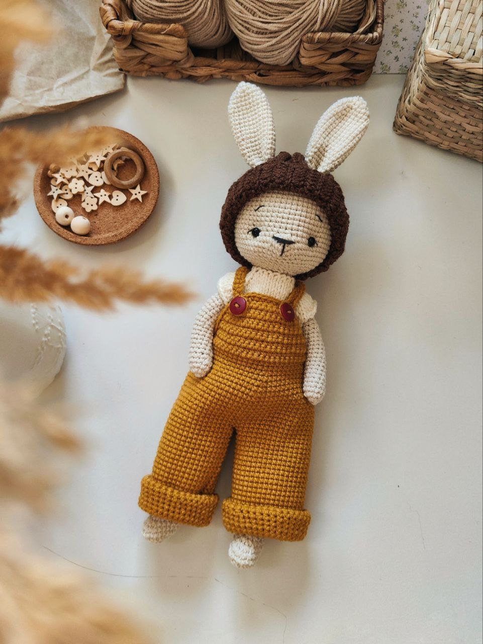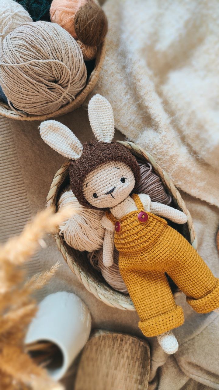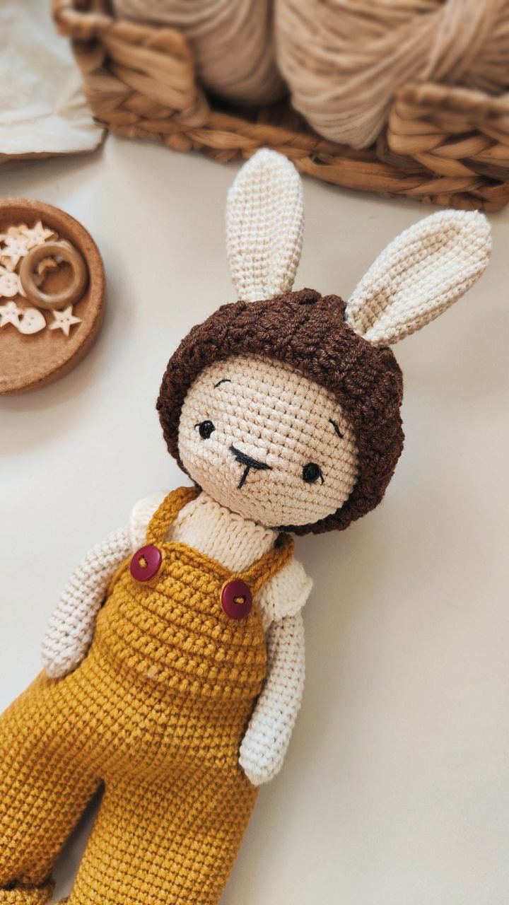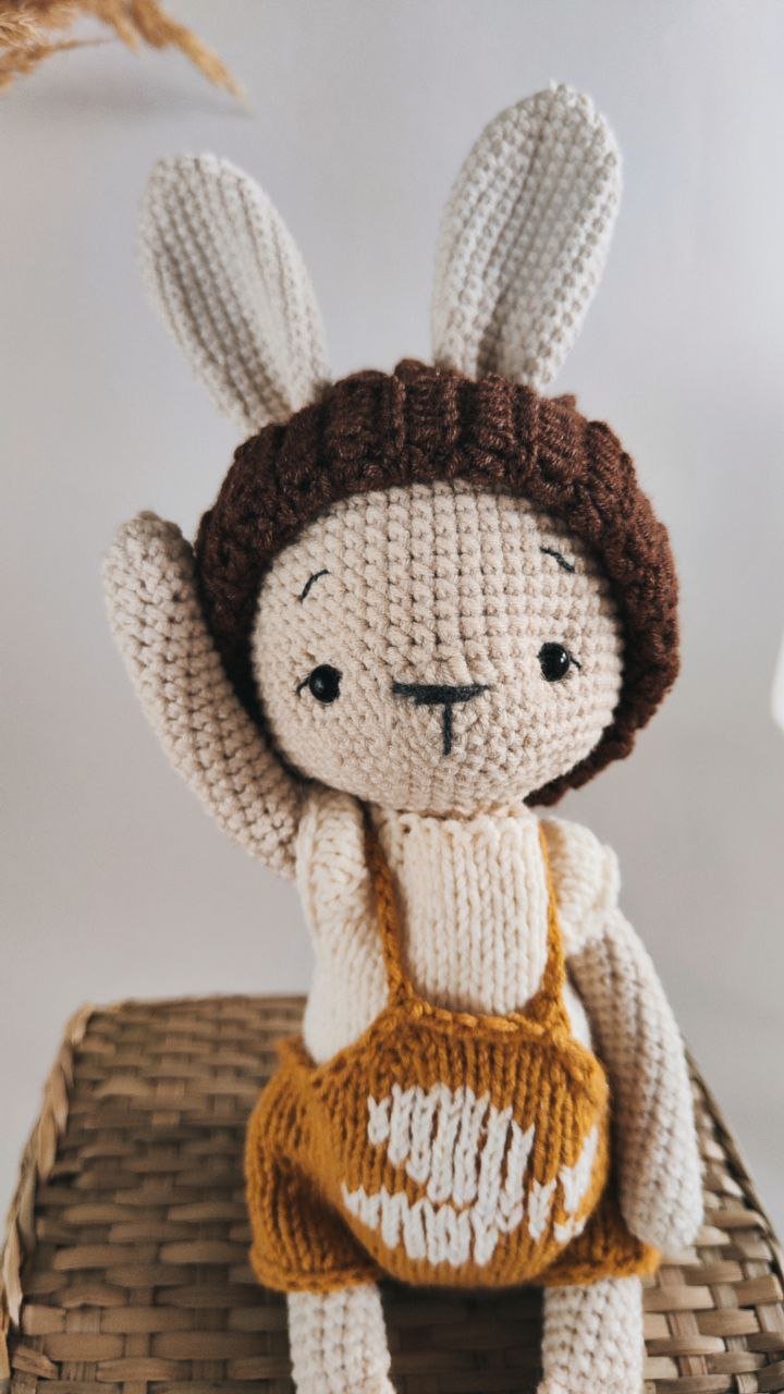 Ten uroczy króliczek w musztardowych ogrodniczkach powstał z dbałością o każdy szczegół, by stać się wyjątkowym prezentem dla maluszka lub piękną ozdobą pokoju dziecięcego.