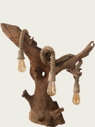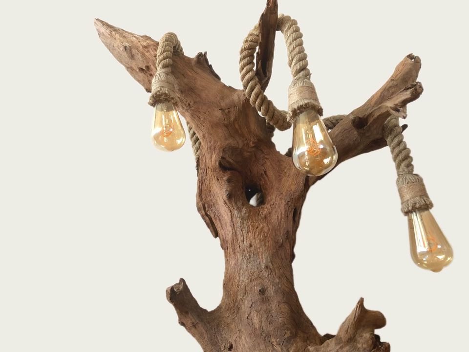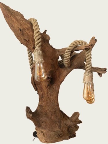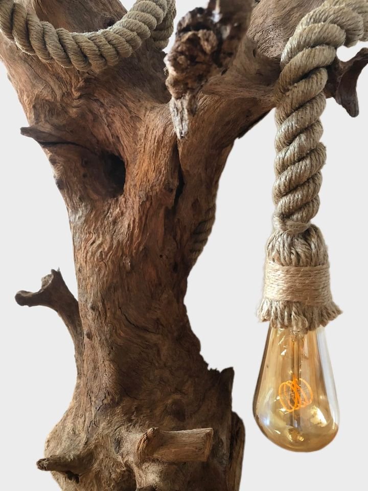Wyjątkowa lampa stworzona ze starej kłody bukowej wyłowionej z jeziora, która dodaje charakteru wnętrzu. Wyposażona w trzy stylowe żarówki ze spiralnym żarnikiem, lampa owinięta jest naturalną liną jutową, co podkreśla jej rustykalny urok. Włącza się go za pomocą praktycznego przycisku włączania/wyłączania. Idealny element dekoracyjny do salonu, sypialni czy przestrzeni komercyjnej. Lampa o wymiarach: 90 cm wysokość, 80cm szerokość
