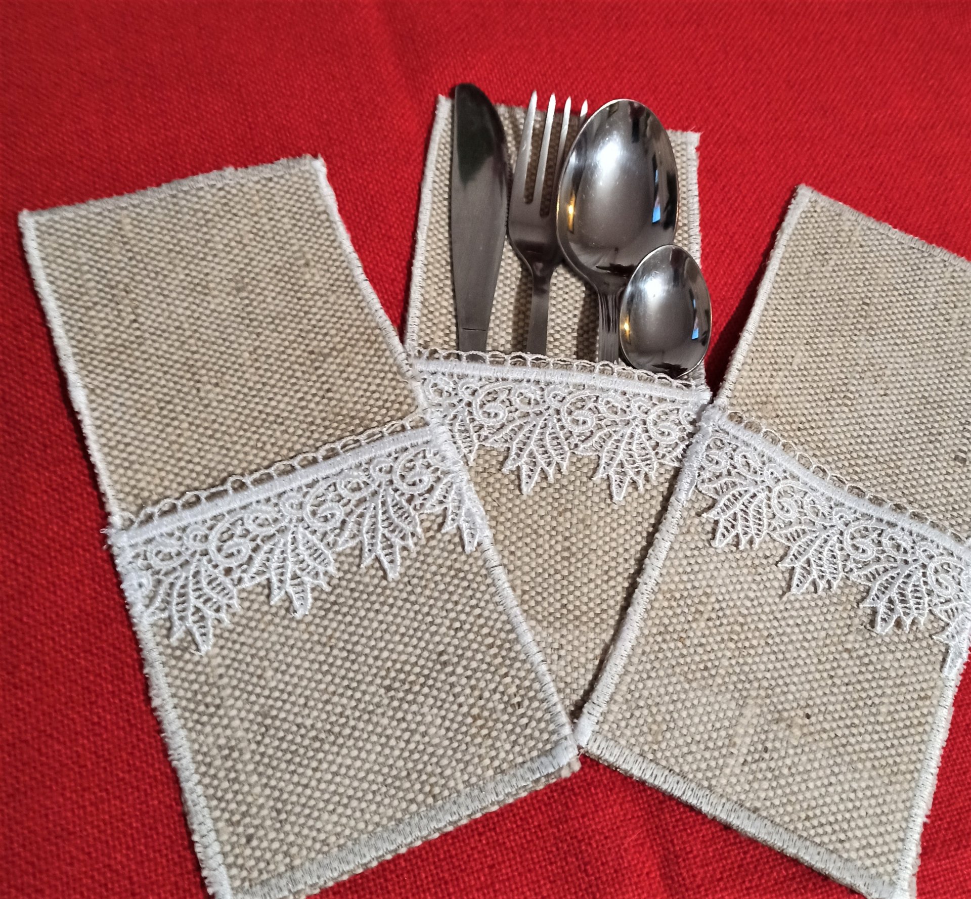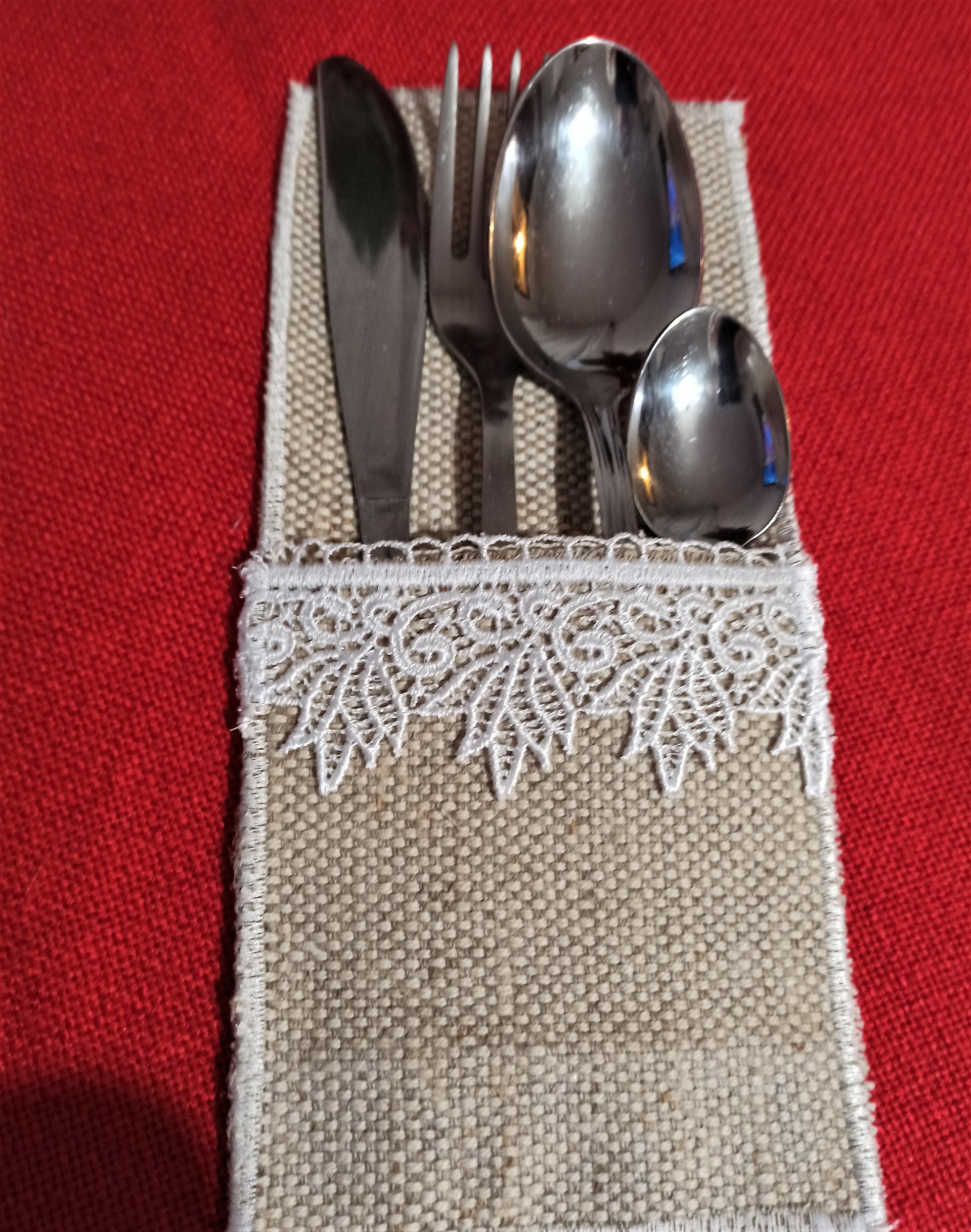 Etui na zestaw sztućców wykonany handmade. Tkanina wykorzystana do wykonania to surowy gruby len i biała gipiura połączone jedwabną nicią. Bardzo ładnie prezentuje się na każdym obrusie. Podnosi wygląd nakrytego stołu, dodaje szyku i elegancji, szczególnie kiedy zapraszamy wyjątkowych gości na, szczególną okazję. Jedyne, niepowtarzalne wg własnego pomysłu. Umieszczanie sztućców w etui, zapobiega bałaganowi na stole i wzajemnemu "podbieraniu" sztućców przez gości. Dobrze się pierze /z każdym razem tkanina będzie jaśniejsza/i prasuje żelazkiem na parę. Nie są to jednorazówki. Komplet zawiera 6 sztuk.