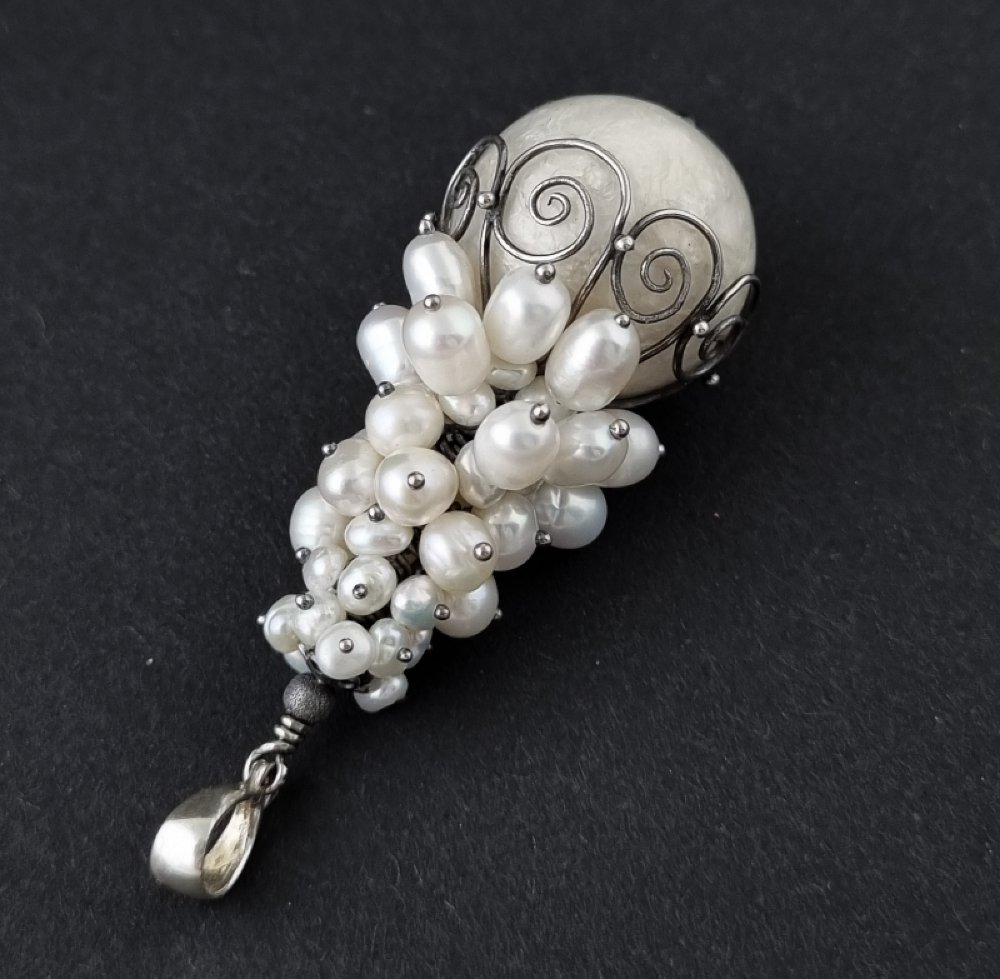 Wyjątkowym elementem tego wisiorka jest ręcznie tworzona ozdoba umieszczona na kuli. Powstała ona z precyzyjnie formowanego drucika, który został zlutowany i wypolerowany, nadając całości elegancki, wyrafinowany wygląd. Powierzchnia srebra została mocno zaoksydowana, dzięki czemu uzyskano różnorodne odcienie szarości, które tworzą piękny kontrast z połyskującą bielą pereł i delikatnym odcieniem muszli.
