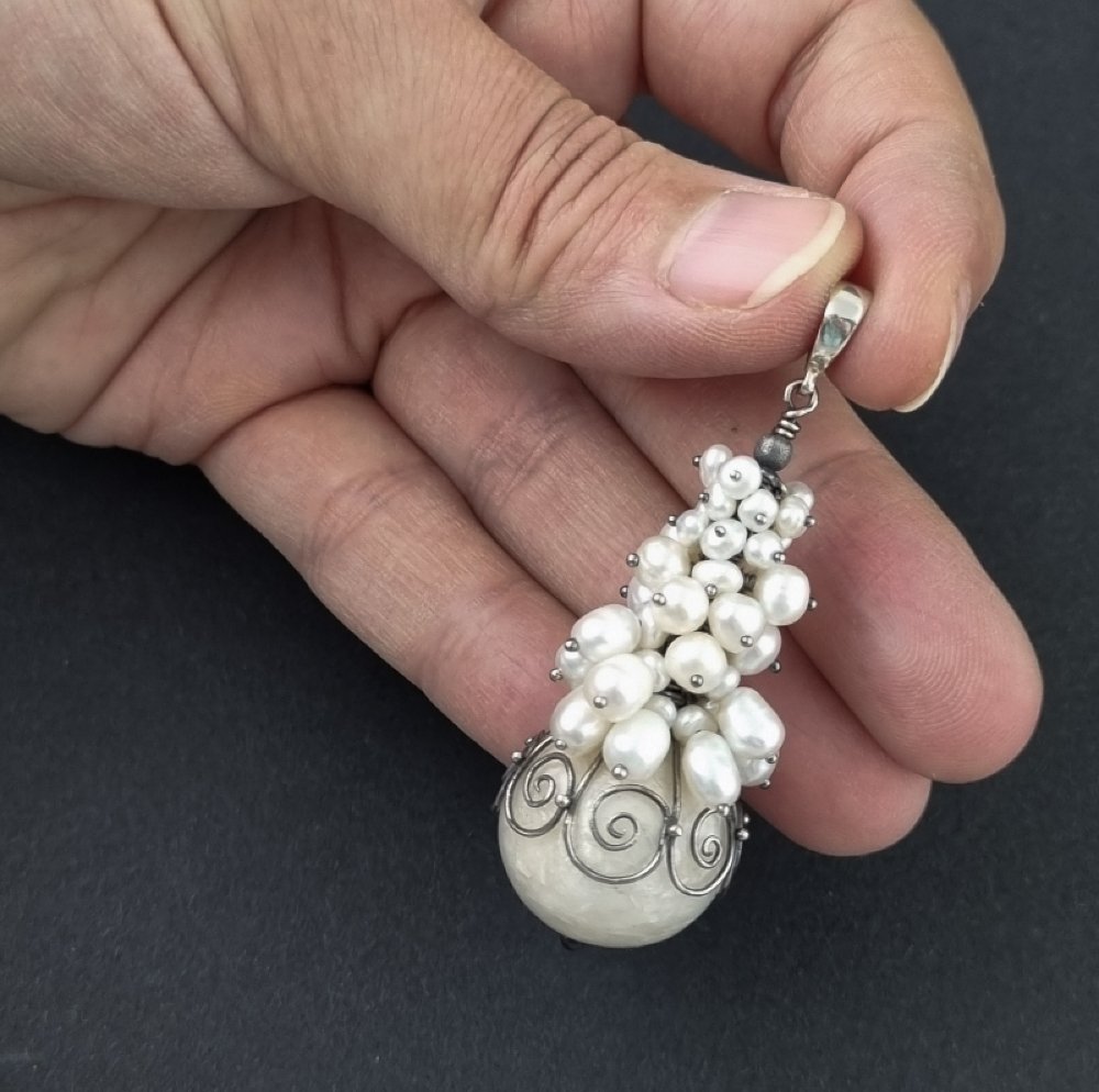 Ten niezwykle bogaty i efektowny wisior został wykonany w całości ze srebra prób 999, 930 i 925, z dbałością o każdy szczegół. Centralnym elementem kompozycji są naturalne, białe perły słodkowodne, które stopniowo zmniejszają się ku górze, przechodząc od wymiarów 6 mm do 2,5 mm. Perły o czystej bieli pięknie kontrastują z główną ozdobą – lekką kulą wykonaną z muszli Paua, o subtelnej barwie delikatnego ecru. Kula o średnicy 2 cm została starannie zabezpieczona warstwą akrylu, co zapewnia jej trwałość i zachowanie naturalnego połysku.