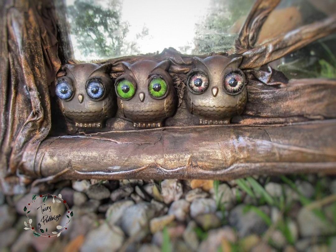 Klimatyczne lustro, na tafli odciśnięte jest piętno czasu, rama ozdobiona w technice utwardzania tkanin, oczy sówek ręcznie malowane na kaboszonach.