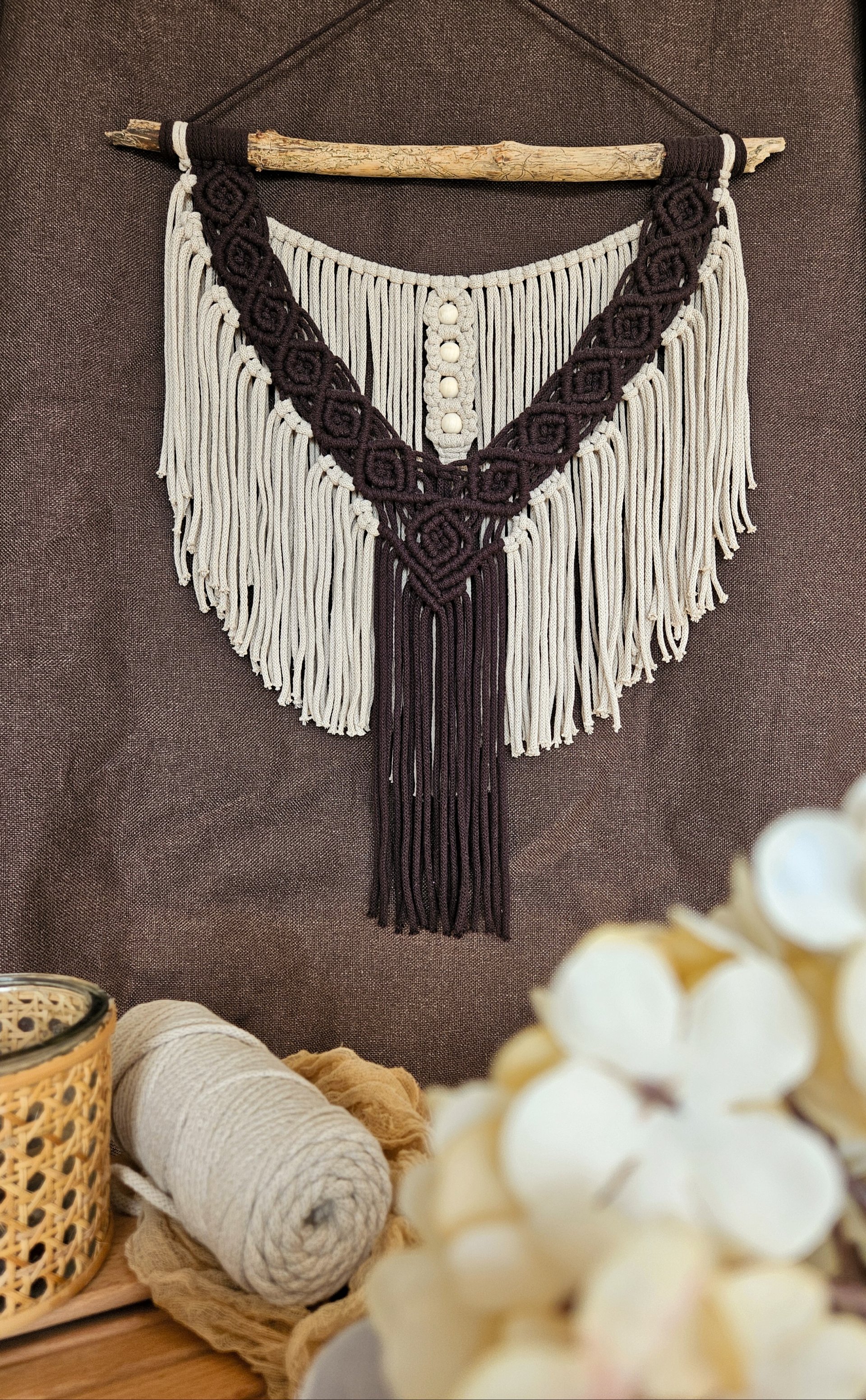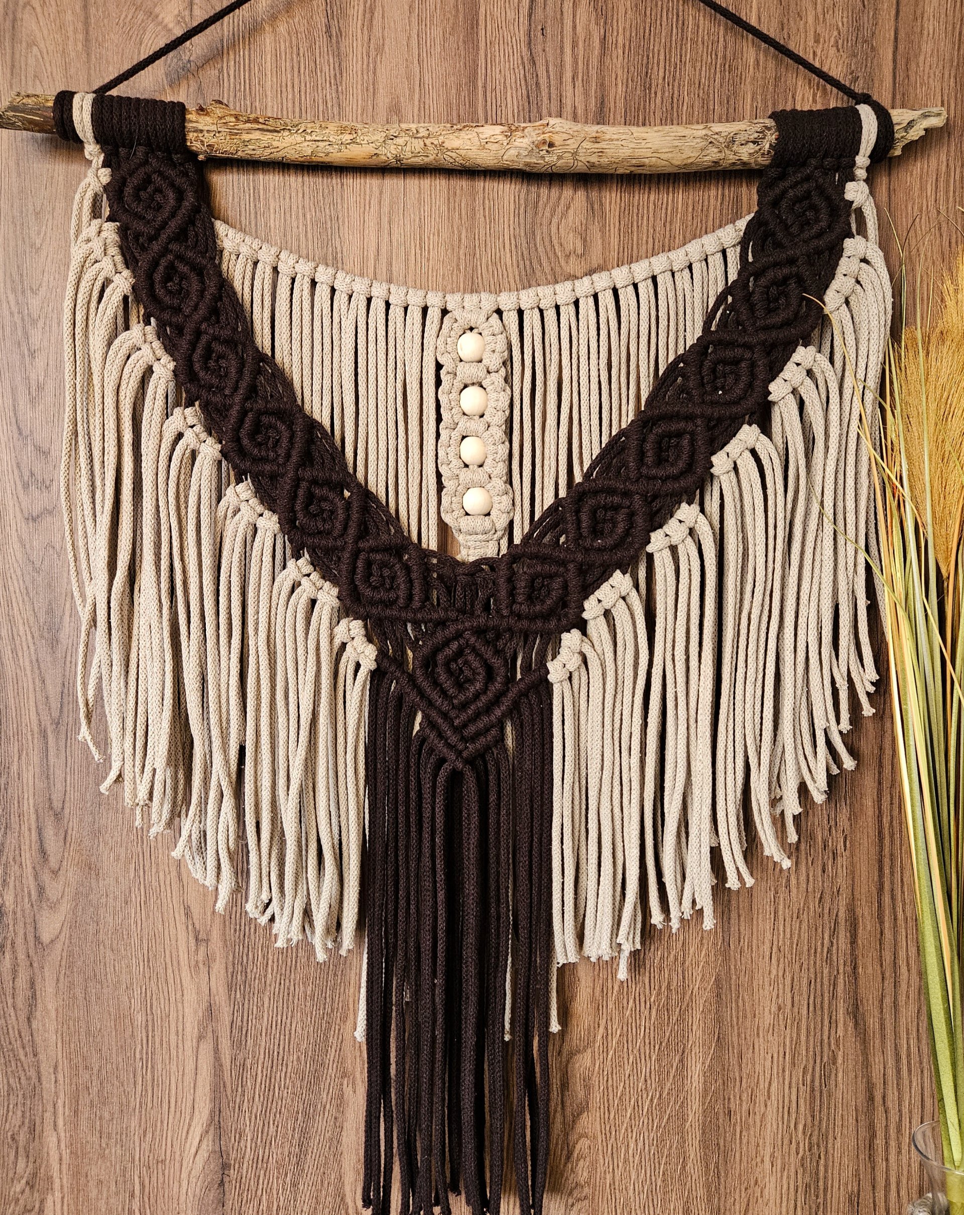 Dekoracja na ścianę wykonana na naturalnej gałązce w stonowanych barwach. Będzie się świetnie komponować z innymi elementami wystroju w Twoim domu.