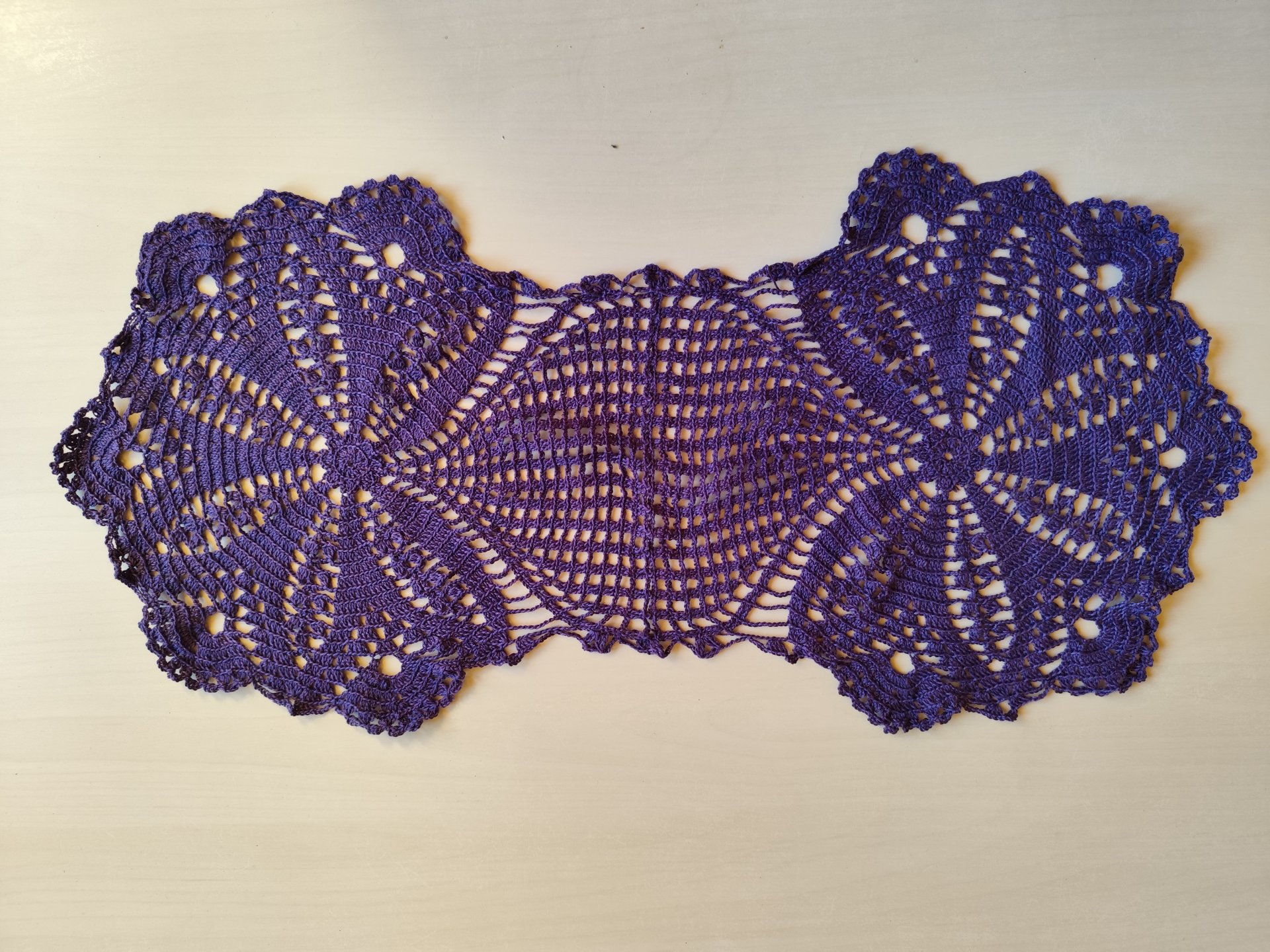 Mały szydełkowany fioletowy bieżni, idelny na stolik kawowy.