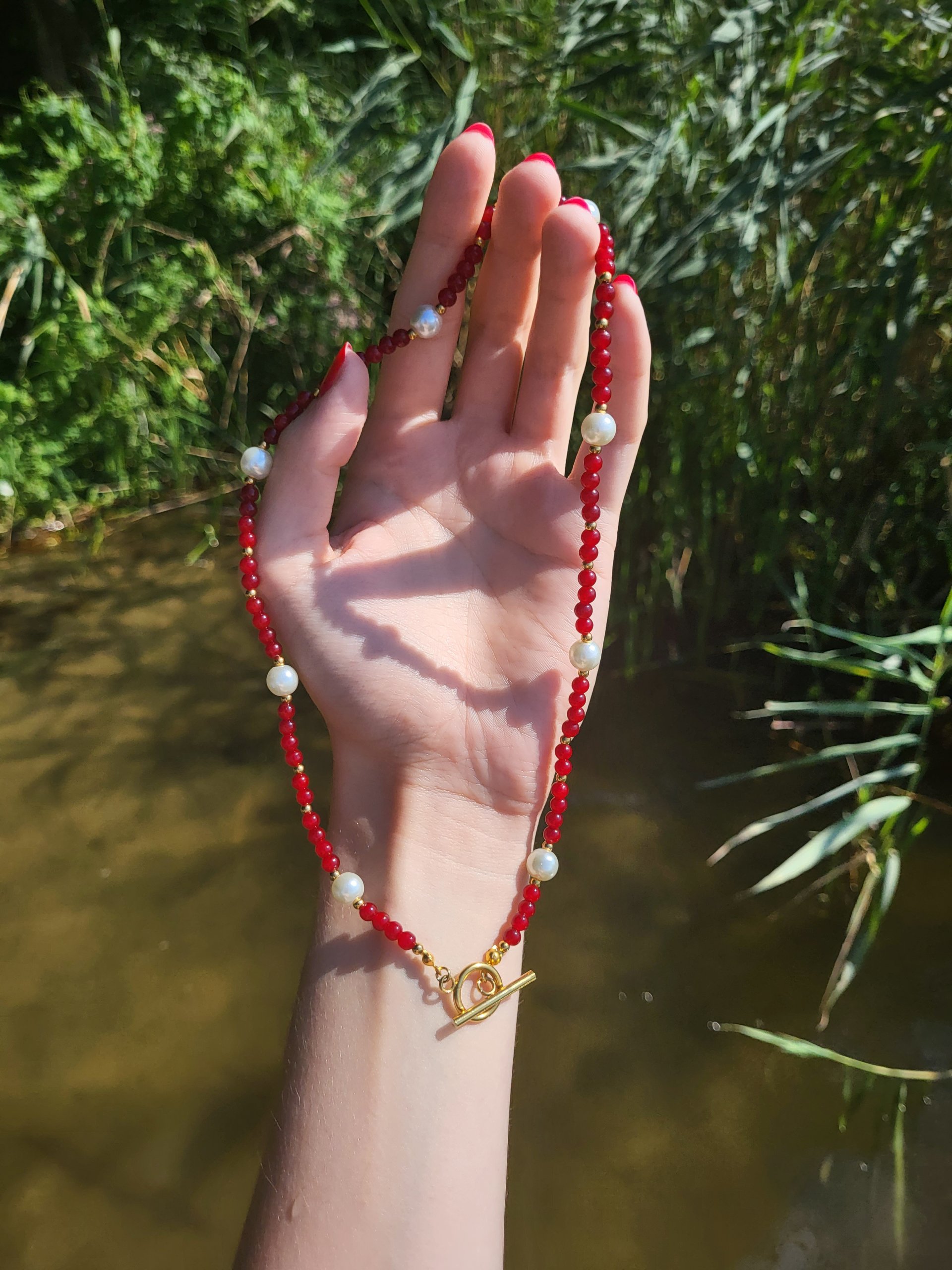 Naszyjnik handmade z koralików szklanych i pereł słodkowodnych, zawieszonych na żyłce jubilerskiej. Całość zapinana jest elementami łączeniowymi ze stali chirurgicznej.