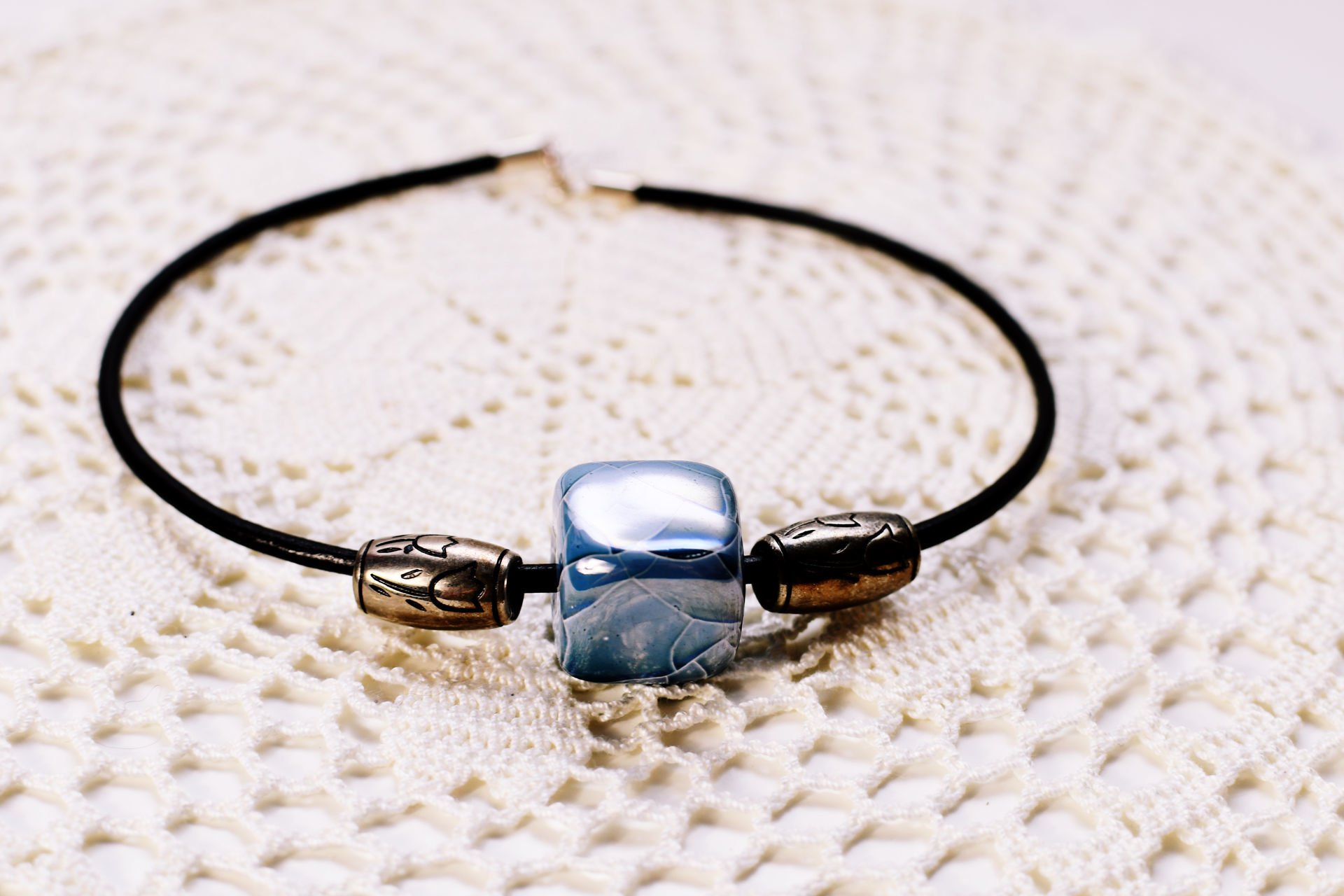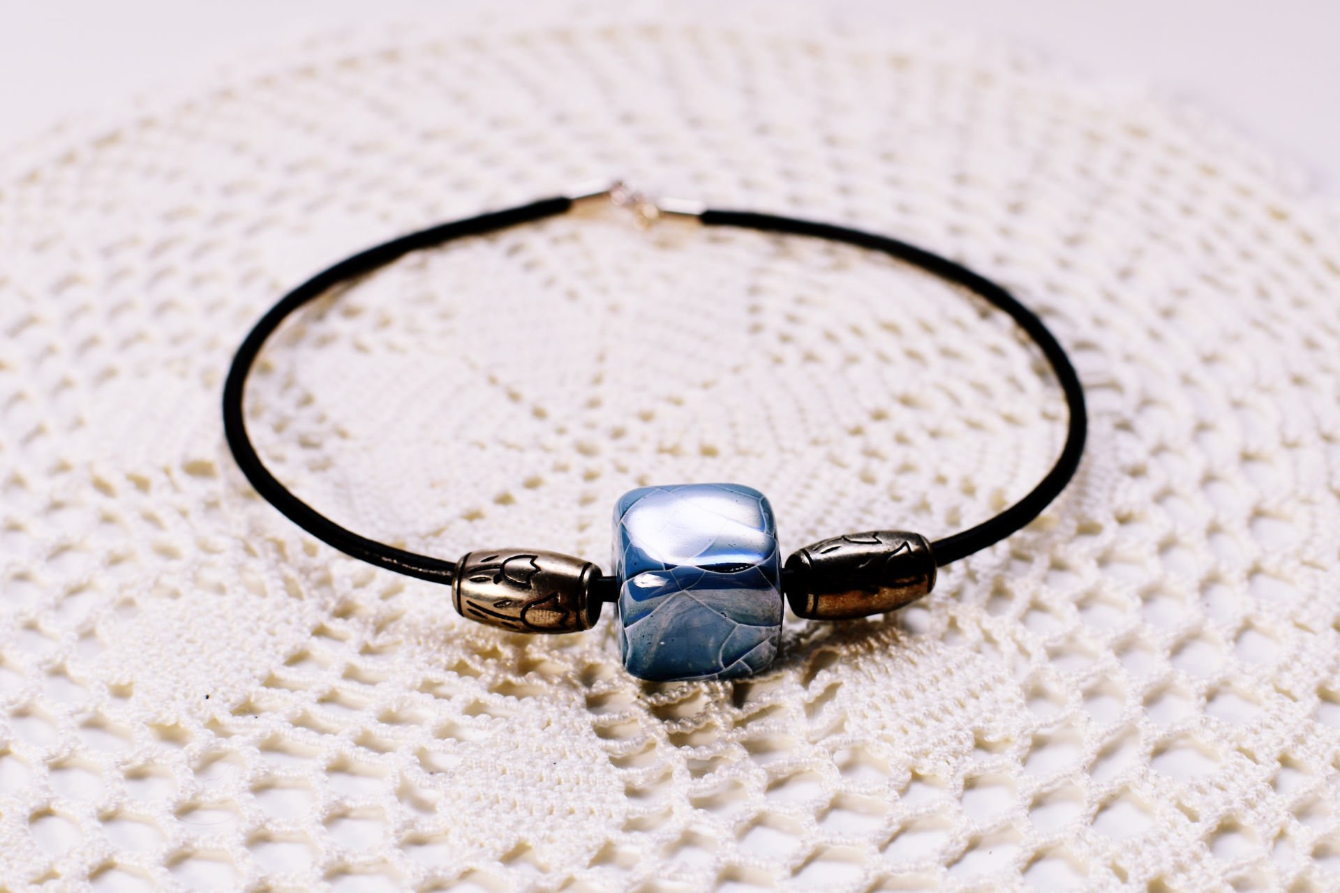 Krótki naszyjnik wykonany z grubego rzemienia jubilerskiego w kolorze czarnym z okrągłym zapięciem ze stali chirurgicznej