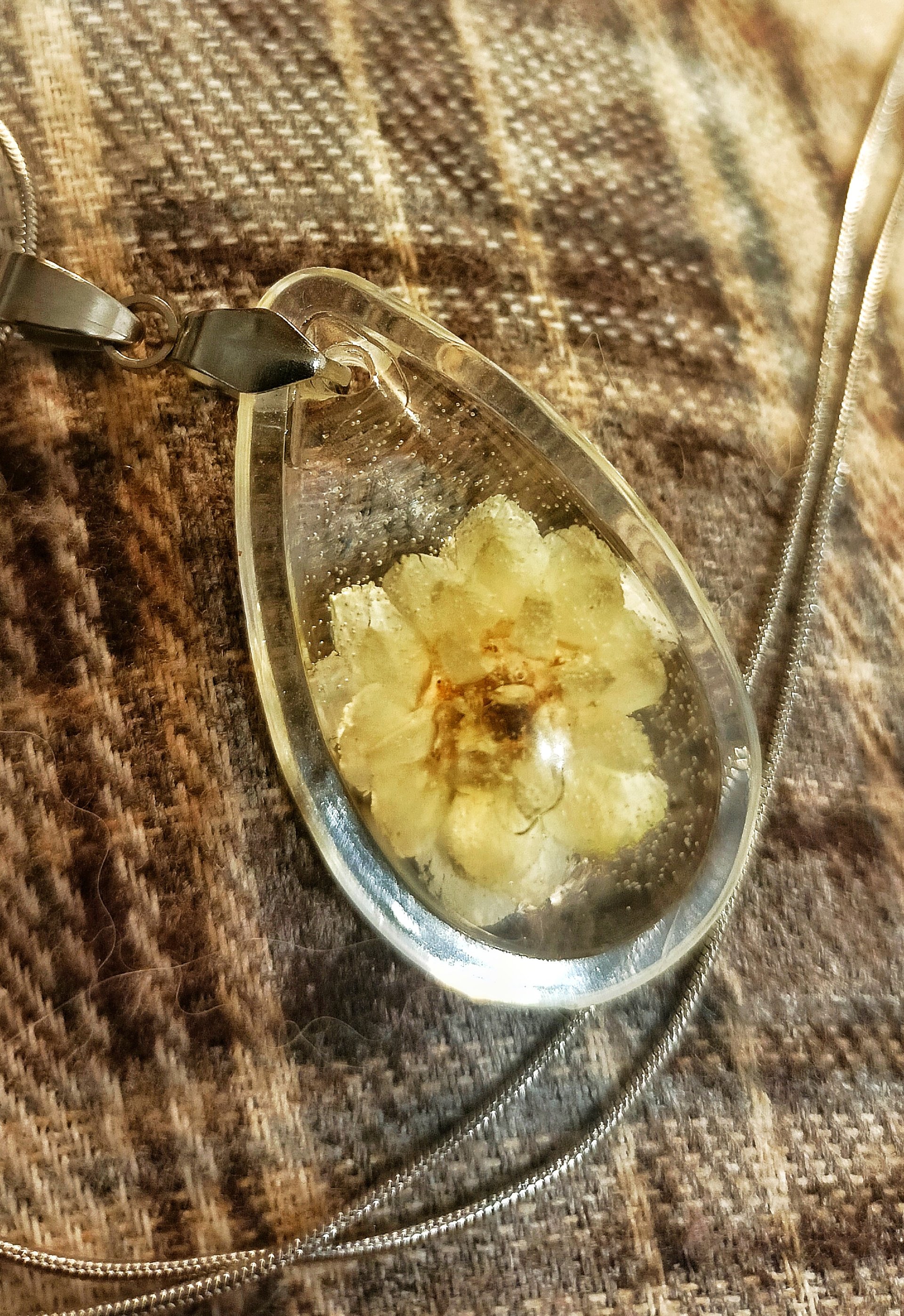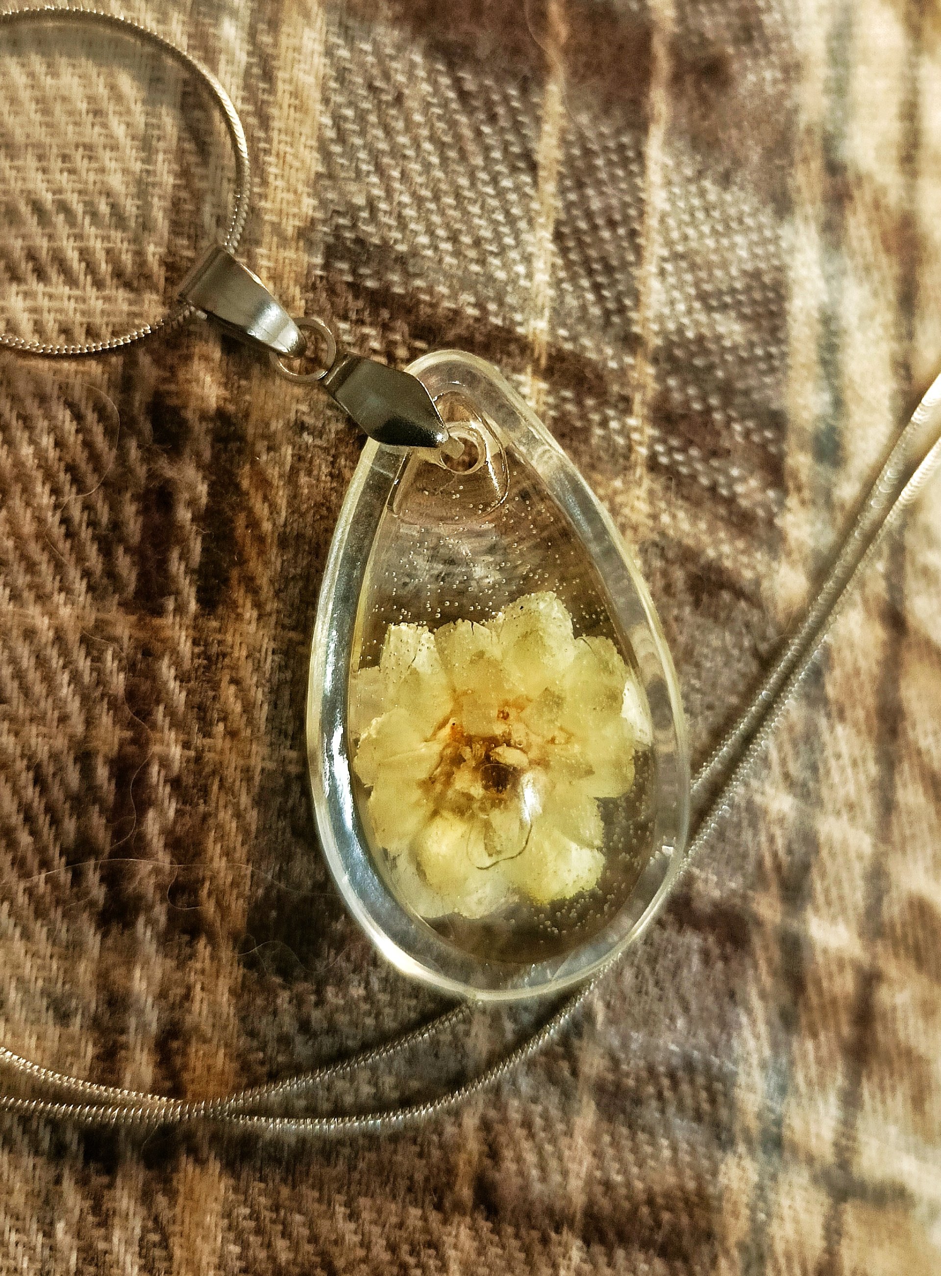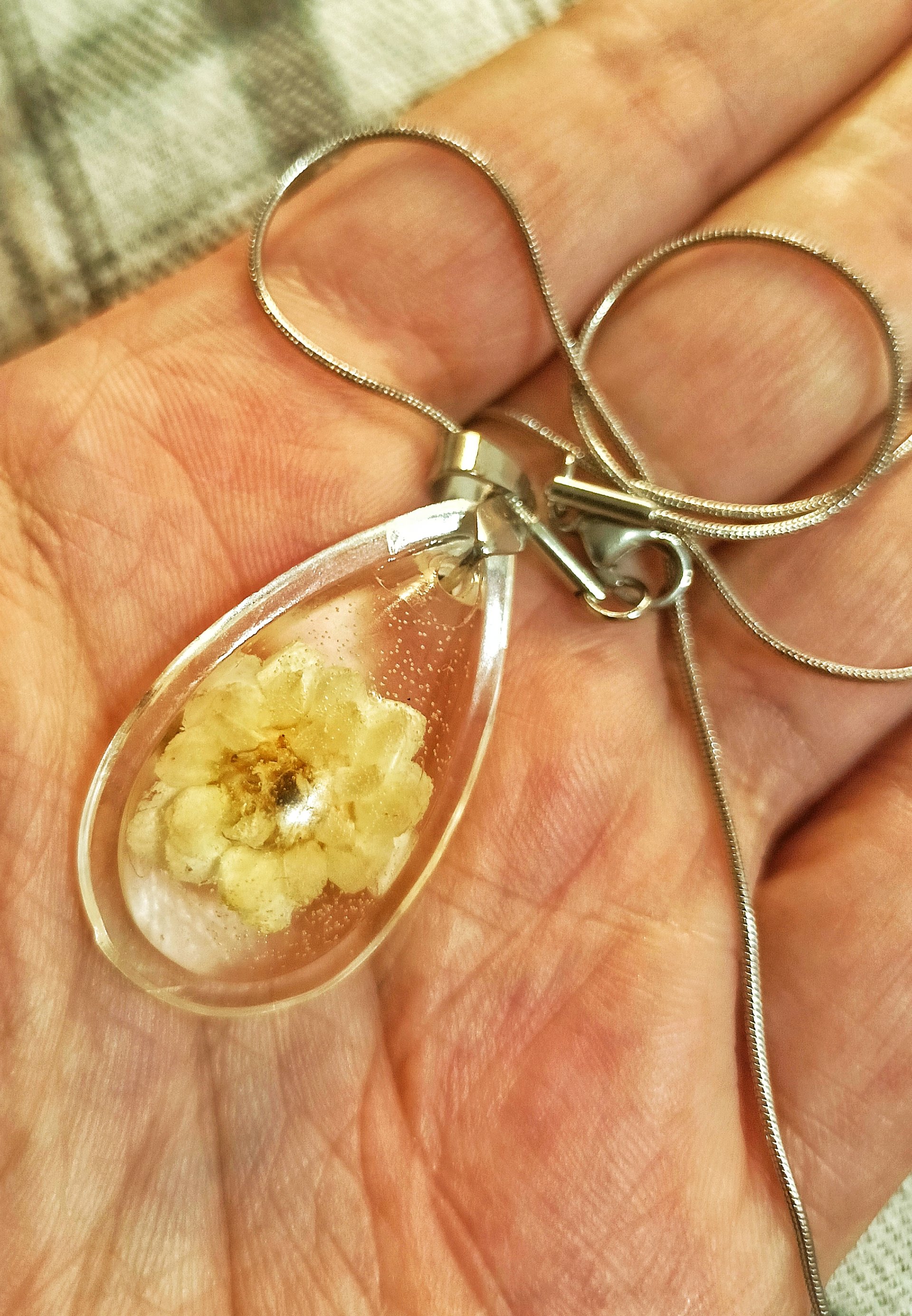 naszyjnik z żywicy handmade, naszyjnik z prawdziwym kwiatem, kocanka w żywicy, biżuteria z suszonymi kwiatami, naszyjnik stal nierdzewna, prezent dla kobiety, naturalna biżuteria, wisiorek kropla, biżuteria boho, ręcznie robiona biżuteria, kwiat w żywicy