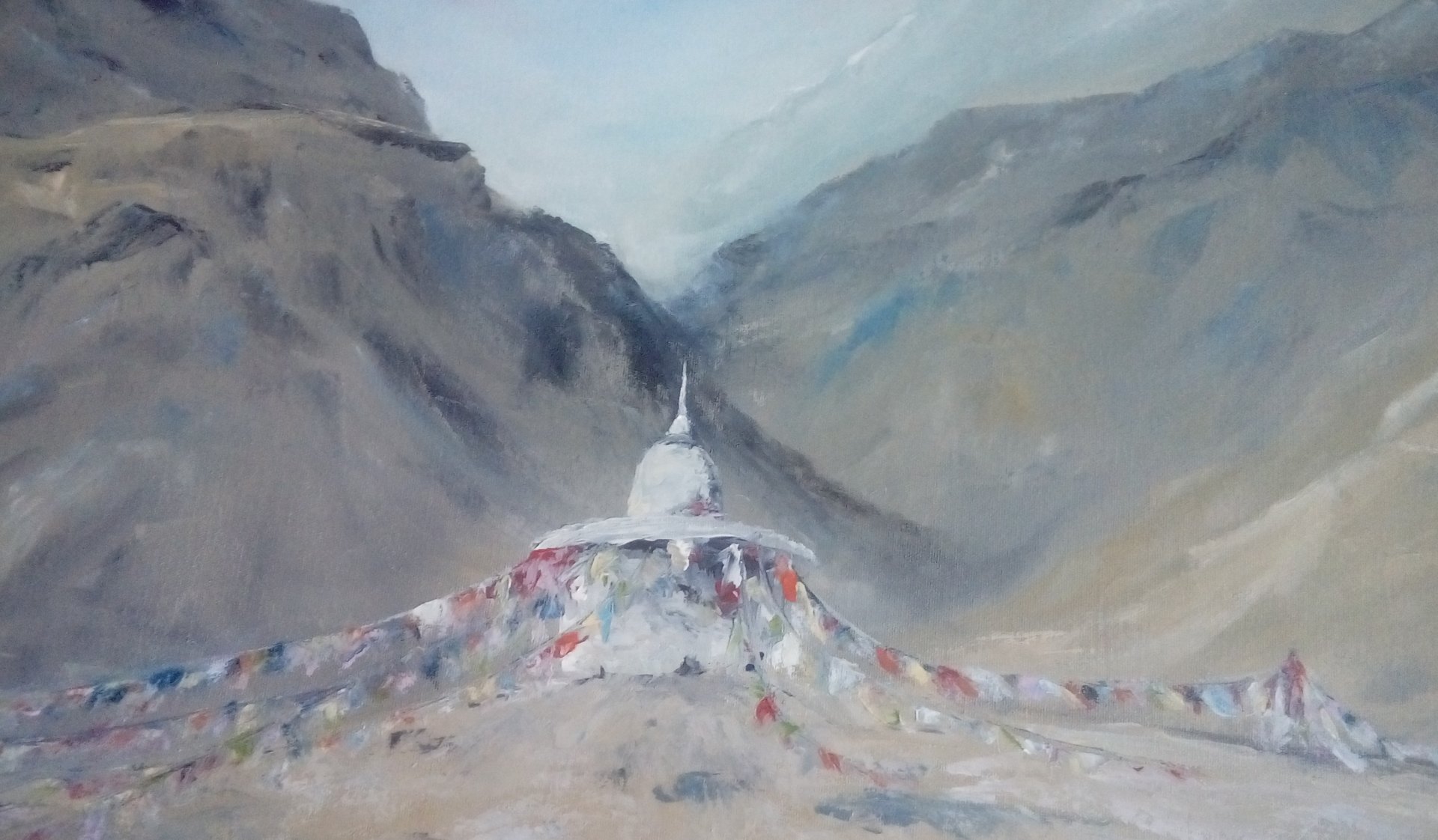 Autorski obraz olejny Nepal. Wymiary 50 cm x 70 cm. Płótno na sosnowym blejtramie wzmocnionym poprzeczką. Sygnowany. Obraz nie wymaga oprawy i jest gotowy do zawieszenia. Posiada zamalowane boki (w formie kontynuacji obrazu, co sprawia wrażenie jego przestrzenności) Do obrazu dołączony certyfikat oryginalności.