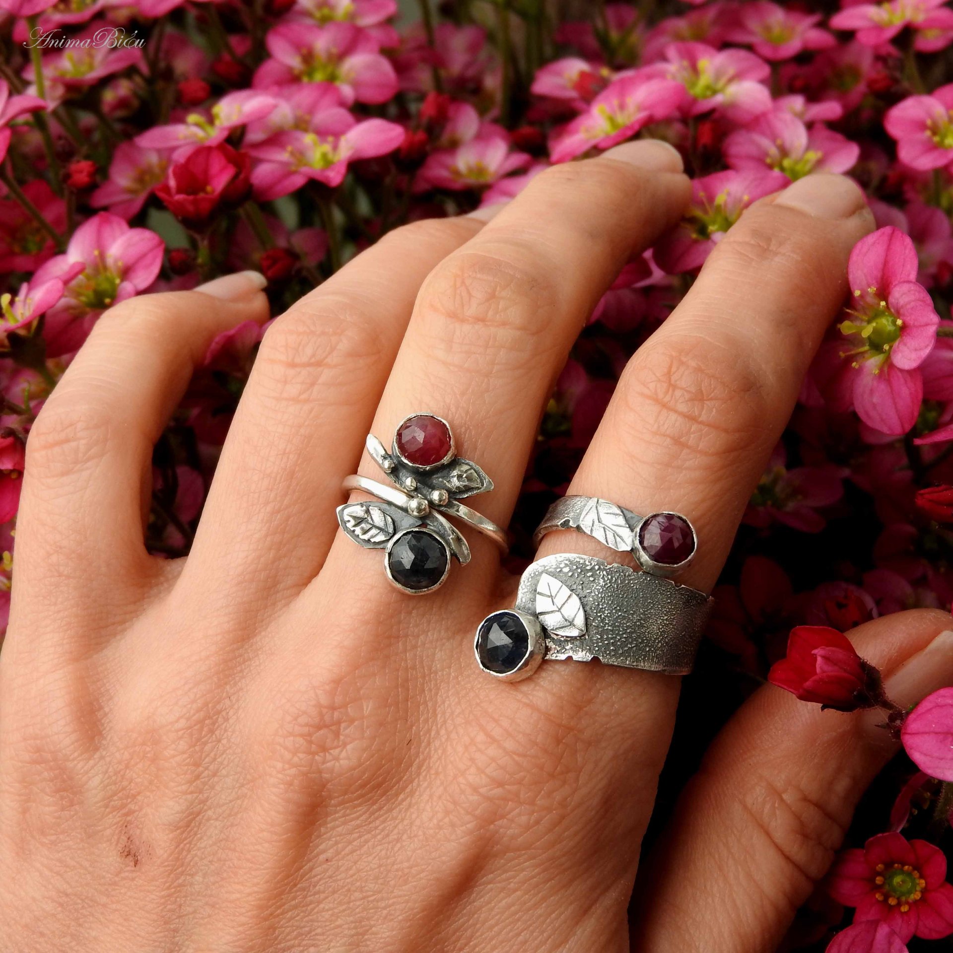 Obrączka srebrna z rubinem i szafirem. Obrączka powstała od podstaw ręcznie z fakturowanego srebra próby 925 i 999, które przyciemniłam i przetarłam. Oba kamienie mają fasetowaną powierzchnię, umieściłam je na przeciwległych biegunach obrączki, a przy każdej z koron mały, srebrny, rzeźbiony listek. Obrączka przy szafirze ma szerokość 12 mm, przy rubinie 4 mm. Rozmiar jest regulowany w zakresie od 16 do 23, przy zakupie proszę o podanie rozmiaru jaki mam ustawić. Waga: 6,2 g, w tym srebro 5,7g. Cechowana w Urzędzie probierczym.