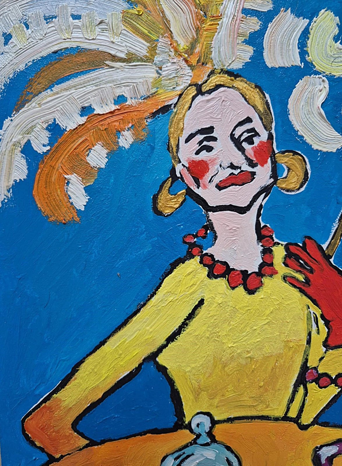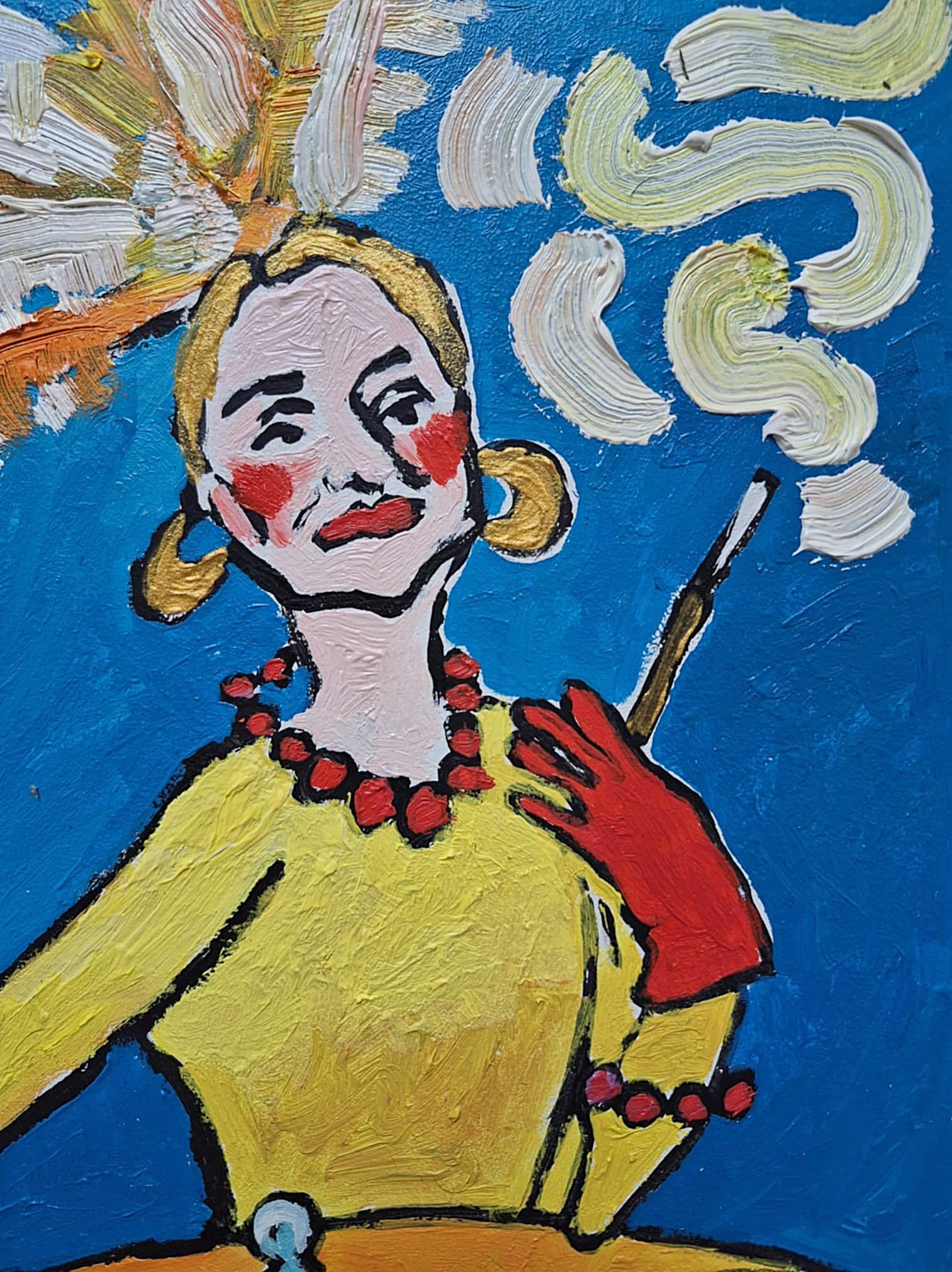 Kapelusz z piórami eksploduje nad głową kobiety jak myśl lub emocja — pióra nie są realistyczne, raczej symboliczne, falujące, jakby były zapisem ruchu lub nastroju. Czerwona rękawiczka, trzymająca papierosa, wprowadza motyw elegancji i dekadencji, przywodząc na myśl kawiarniany rytuał, chwilę zawieszoną między codziennością a pozą.