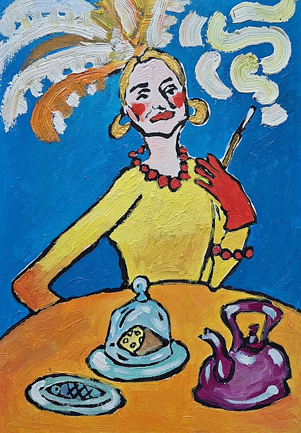 Na stole przedmioty — ryba na talerzu, kawałek sera pod kloszem, purpurowy dzbanek — nie tworzą klasycznej martwej natury. Są uproszczone, niemal dziecinne w formie, przez co zyskują charakter symboli: codzienność przedstawiona nie jako rzeczywistość, lecz jako znak. Całość balansuje między humorem a niepokojem, między lekkością a poczuciem sztuczności.
