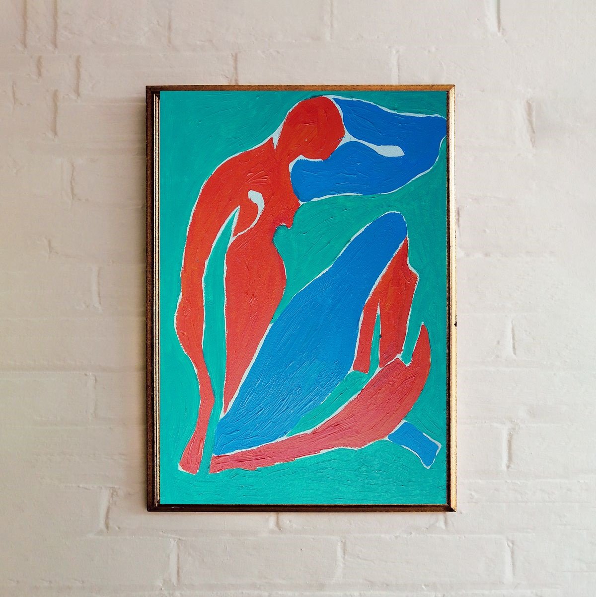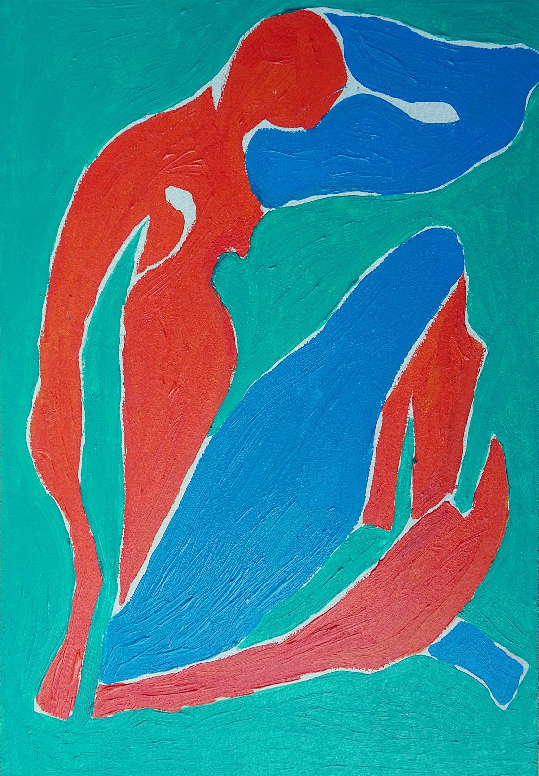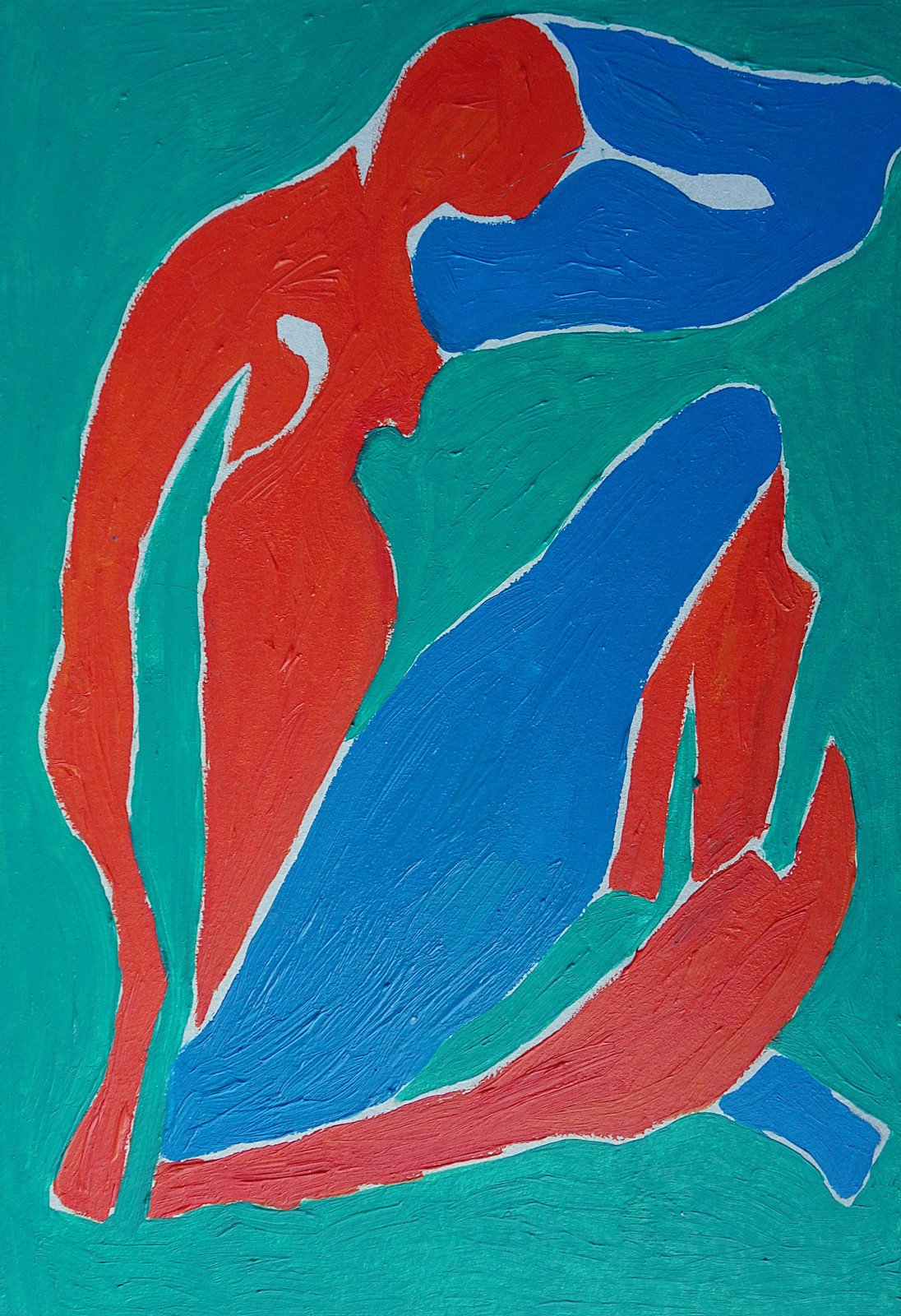 Na obrazie dominują jaskrawe kolory: głęboki czerwony w kontraście z niebieskim i zielonym tłem. Kształty są abstrakcyjne, ale coś tam sugeruje postać człowieka. Kompozycja jest dynamiczna. Linie są płynne, a krawędzie wyraźne. Atmosfera przypomina mi letnie słońce, pełna energii, ale też tajemnicy. Artysta użył techniki impasto, co widać w grubych warstwach farby i teksturze. Styl nawiązuje do ekspresjonizmu, gdzie forma ustępuje emocji. Obraz może wywoływać poczucie ruchu i siły. Może też powodować trochę zastanowienia. Czy to radość, czy może smutek? Patrząc na to, chciałoby się krzyknąć: Wow! Jakie to niesamowite! to wygląda jak wielka plama! Prace takie jak ta pozwalają nam na chwilę oderwać się od codzienności i zanurzyć się w świat koloru. To takie awesome, jakby powiedzieli Anglicy. Patrząc na to, czuję, jakby energia wprost z obrazu przepływała do mnie.