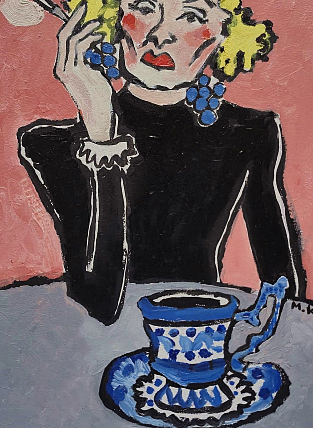 Całość jest surowa, ekspresyjna, z wyraźnym śladem ręki artysty. Obraz nie próbuje być piękny w klasycznym sensie — raczej szczery. To portret chwili: samotnej, eleganckiej, trochę znudzonej, trochę zamyślonej. Jakby świat na moment zamilkł, a ona została sama z dymem, kawą i własnymi myślami.