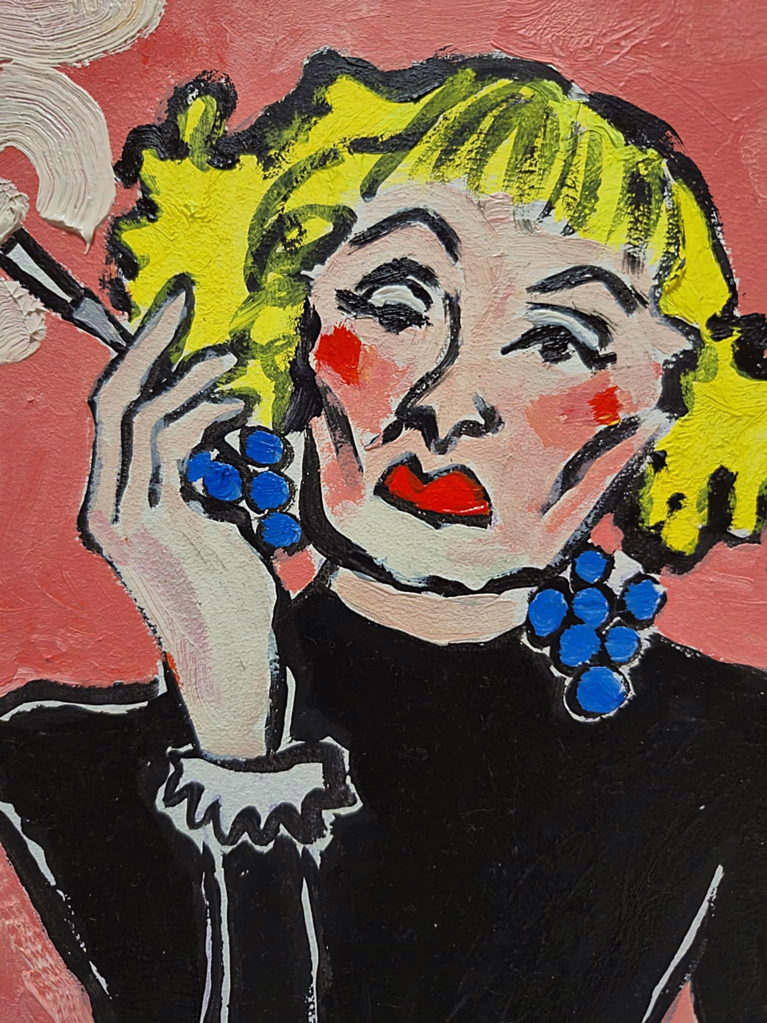 Na różowym, niemal cukierkowym tle siedzi kobieta o twarzy namalowanej grubą, pewną kreską. Jej blond włosy są jak plamy światła, niesforne, niemal rozedrgane, kontrastujące z czarną suknią, która pochłania wszystko wokół. Postać jest wyprostowana, dumna, a jednocześnie jakby zawieszona w bezruchu — między gestem a myślą.