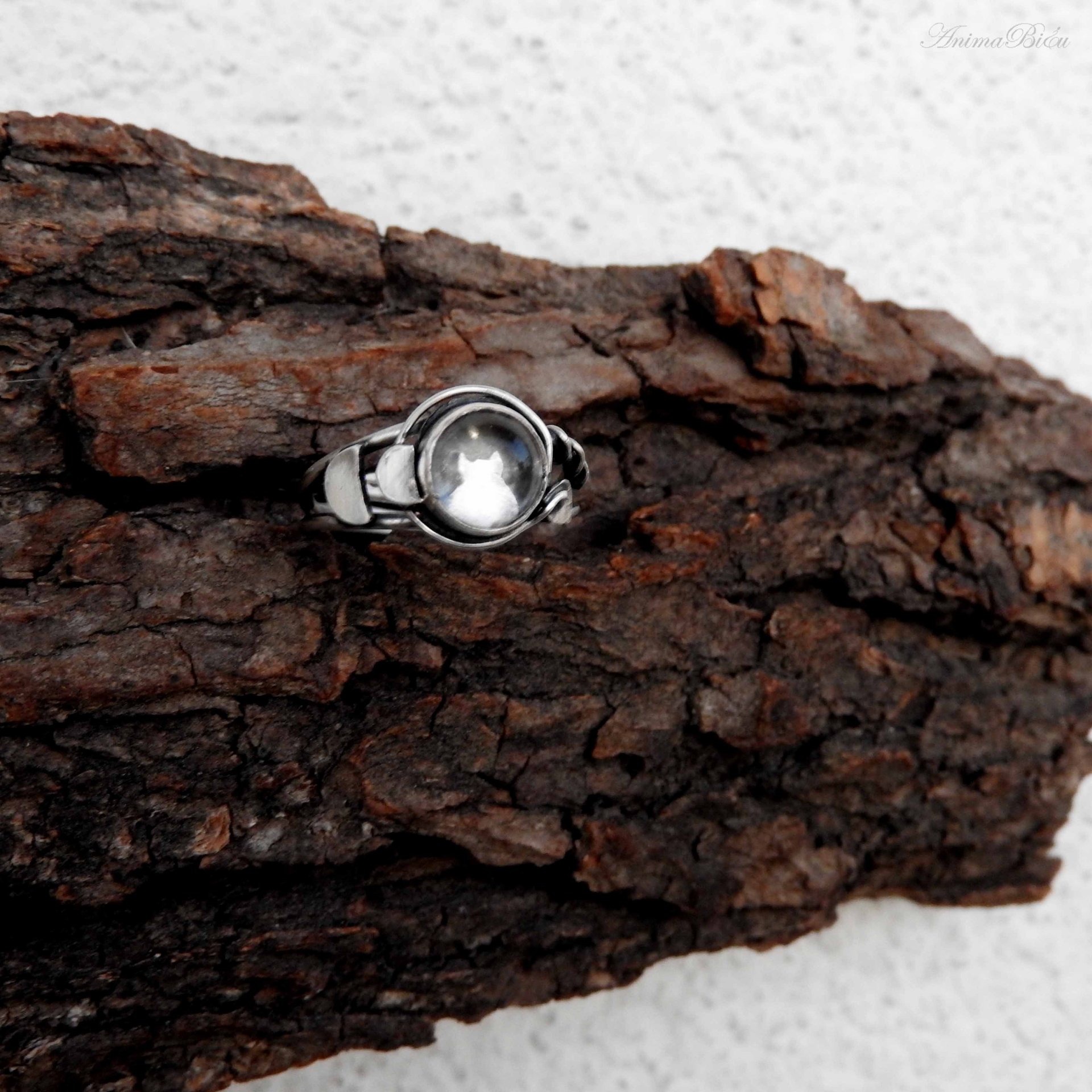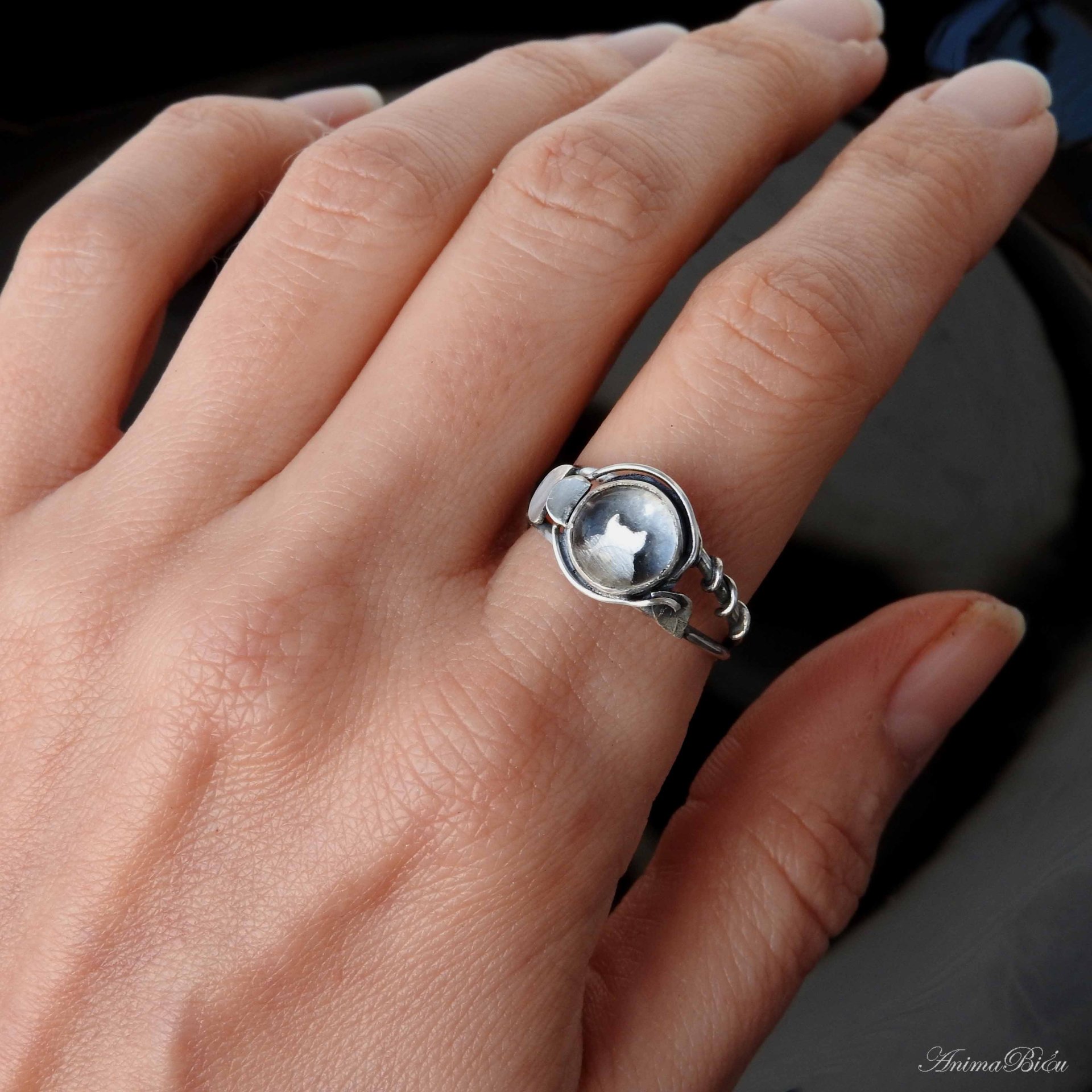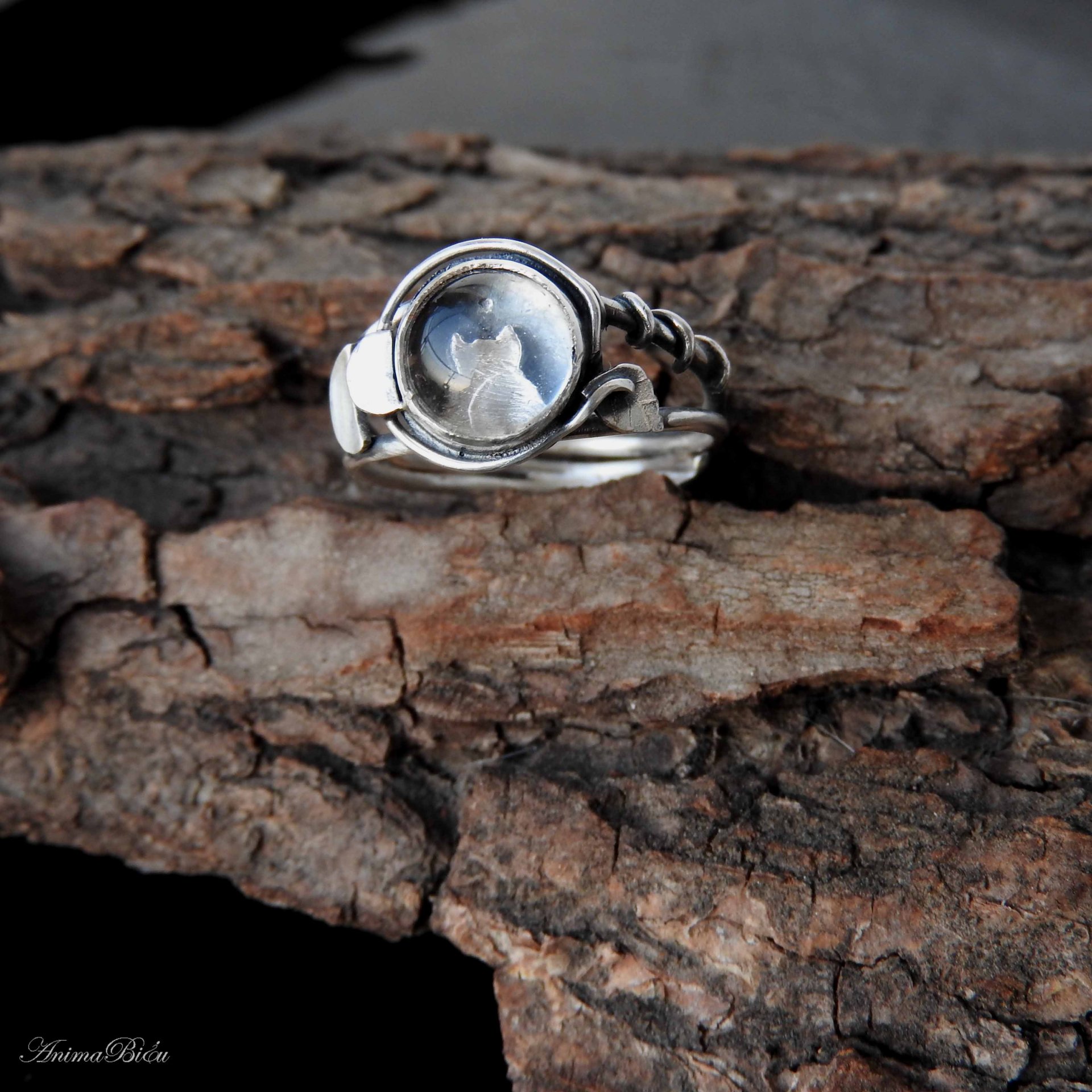 Pierścionek srebrny z kryształem górskim. Pierścionek wykonałam od podstaw ręcznie ze srebra próby 925 i 999. Koronę zdobi piękny, całkowicie przejrzysty kryształ górski, pod którym umieściłam kontury kotka na tle rozgwieżdżonego nieba. Po jednej stronie korony pierścionek zdobią srebrne oploty i listek, a po drugiej dwa półksiężyce. Srebro przyciemniłam, a następnie wypolerowałam. Korona ma średnicę 10 mm. Osadzona jest na podwójnej, regulowanej obrączce. Przy zakupie proszę o informację jaki rozmiar mam ustawić. Technika wykonania: lutowanie, młotkowanie. Waga pierścionka to 3,14 gramów.