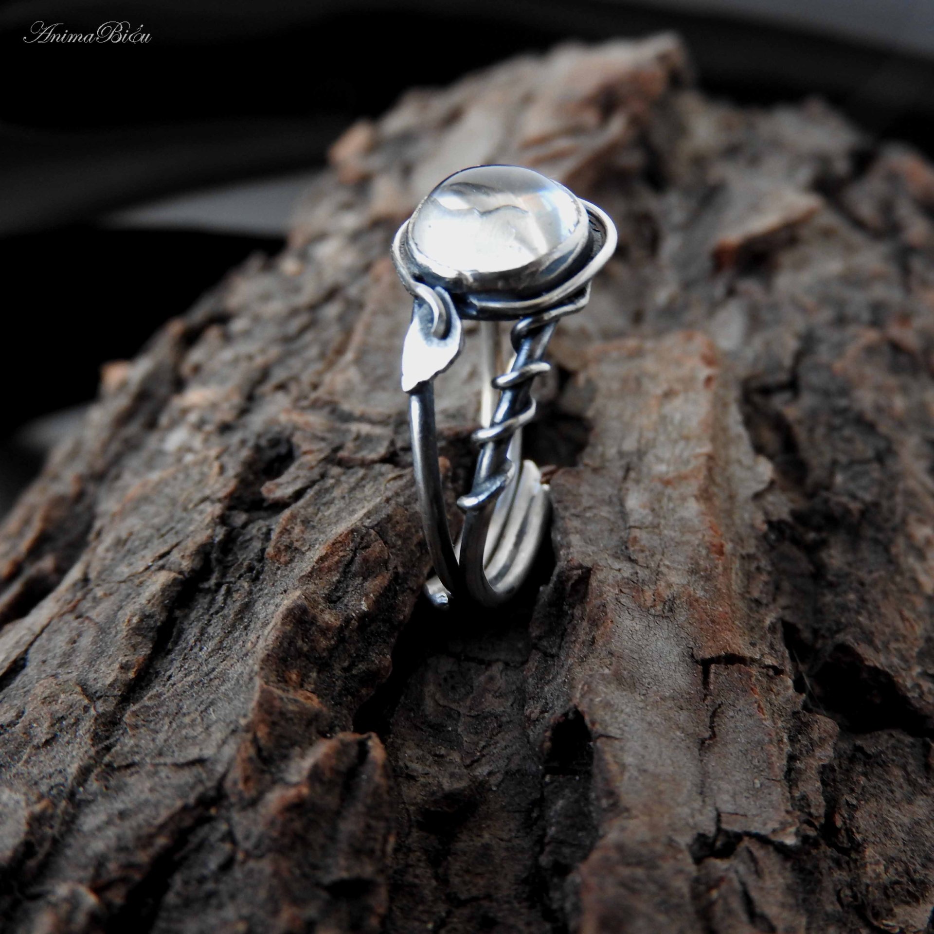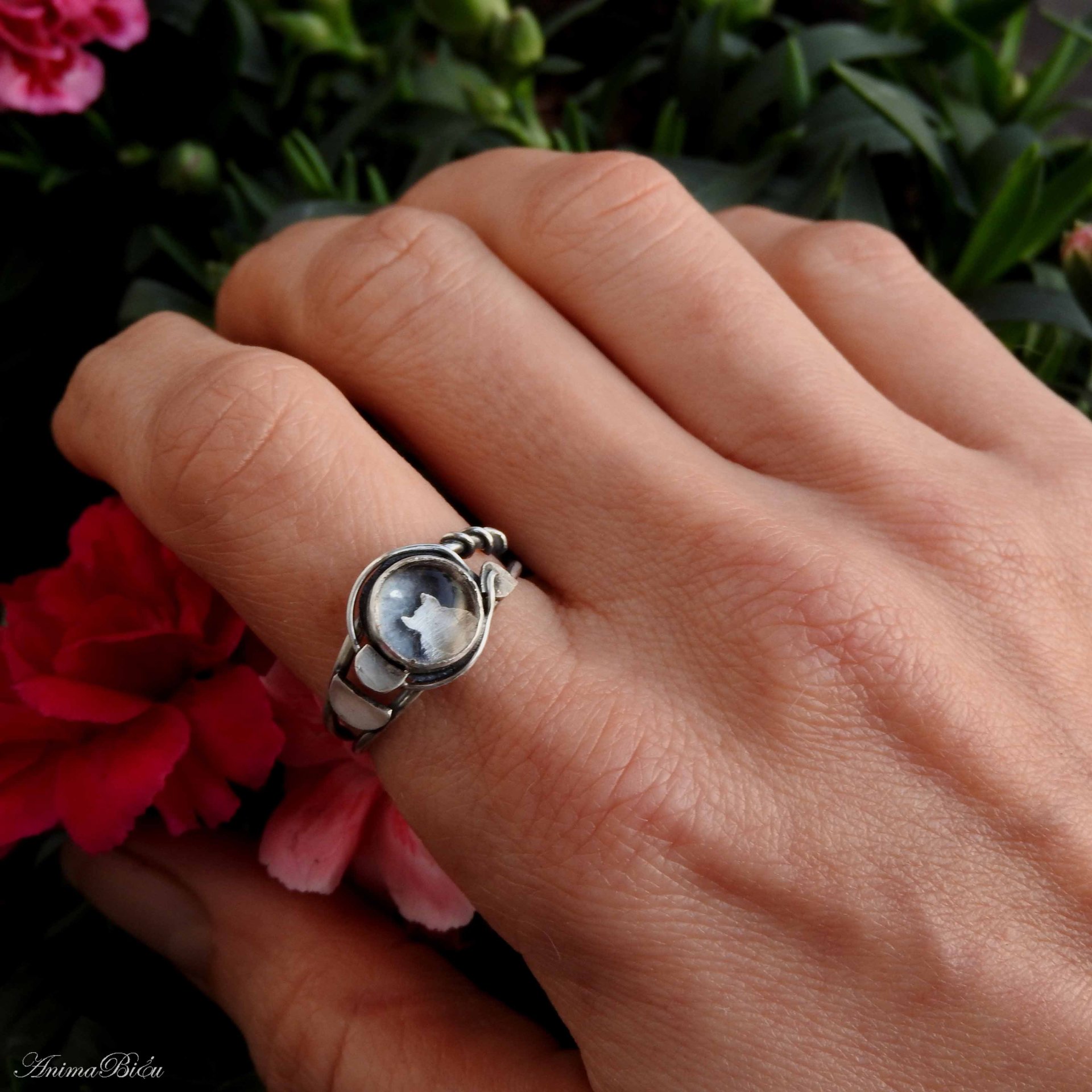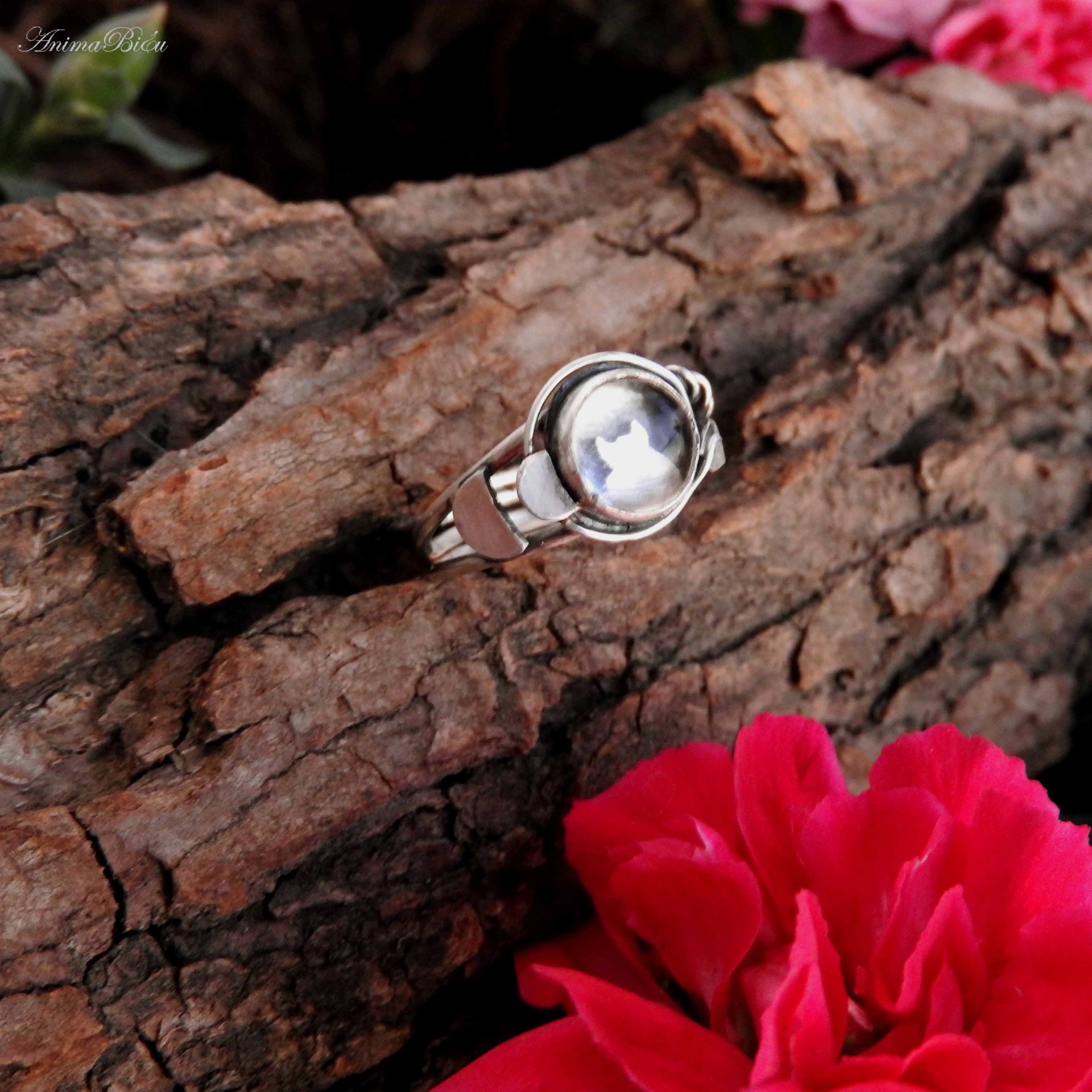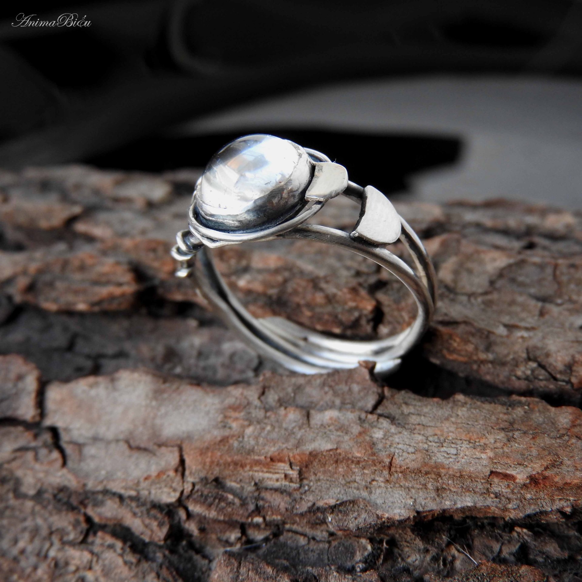 Pierścionek srebrny z kryształem górskim. Pierścionek wykonałam od podstaw ręcznie ze srebra próby 925 i 999. Koronę zdobi piękny, całkowicie przejrzysty kryształ górski, pod którym umieściłam kontury kotka na tle rozgwieżdżonego nieba. Po jednej stronie korony pierścionek zdobią srebrne oploty i listek, a po drugiej dwa półksiężyce. Srebro przyciemniłam, a następnie wypolerowałam. Korona ma średnicę 10 mm. Osadzona jest na podwójnej, regulowanej obrączce. Przy zakupie proszę o informację jaki rozmiar mam ustawić. Technika wykonania: lutowanie, młotkowanie. Waga pierścionka to 3,14 gramów.