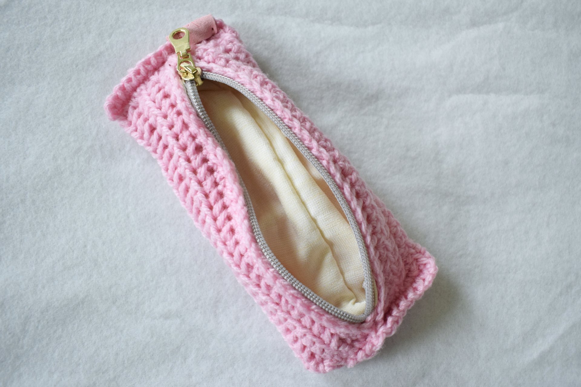Piórnik wykonany szydełkiem z włóczki akrylowej.