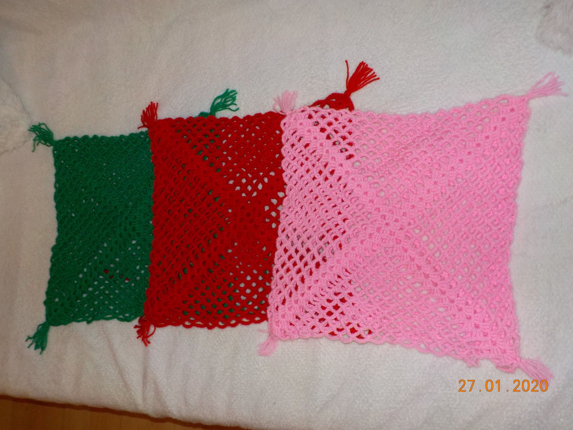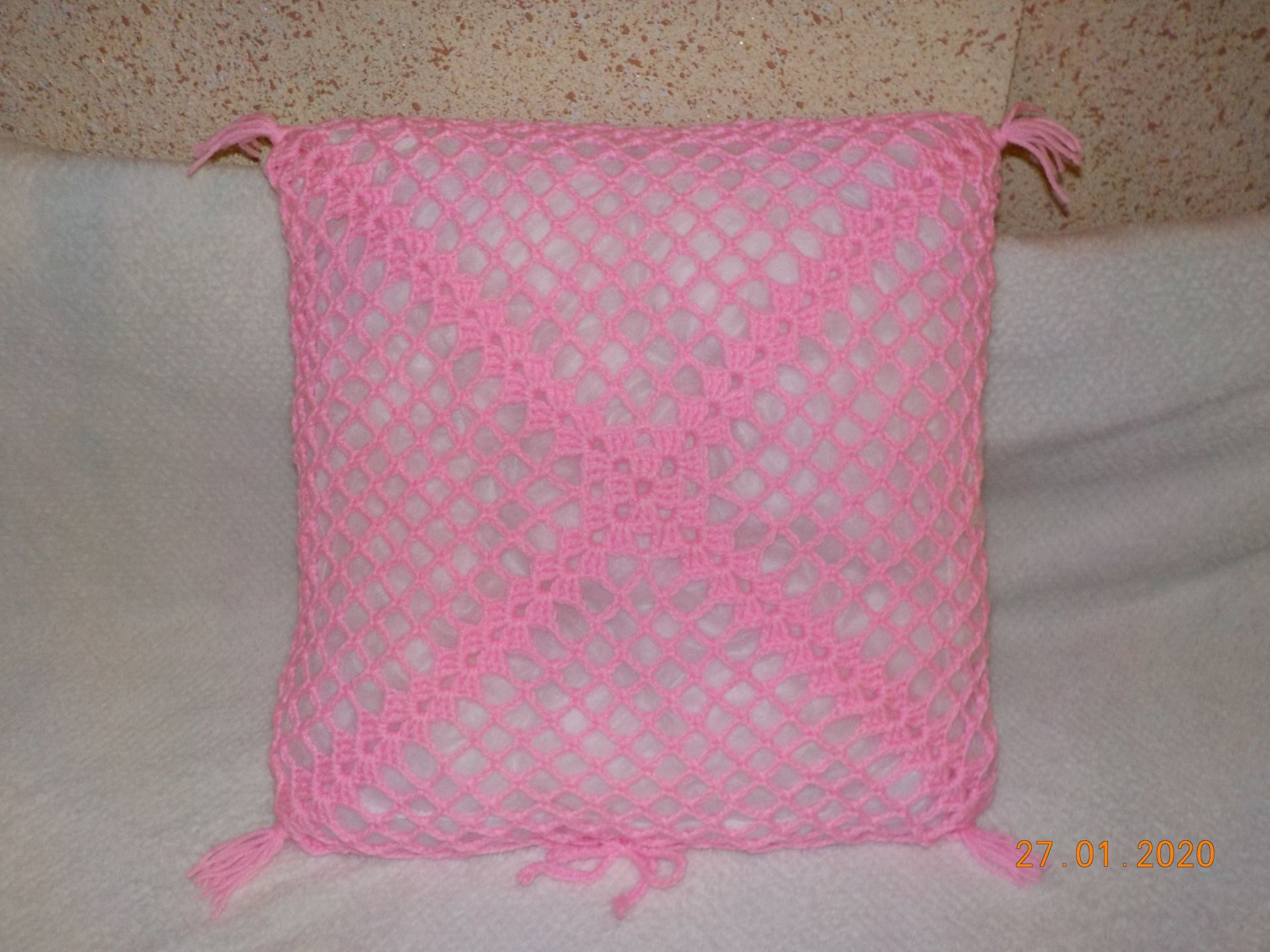 Szydełkowa poszewka na poduszkę w trzech kolorach. Pasuje na poduszki o rozmiarach 32x32 cm do 40x40 cm.