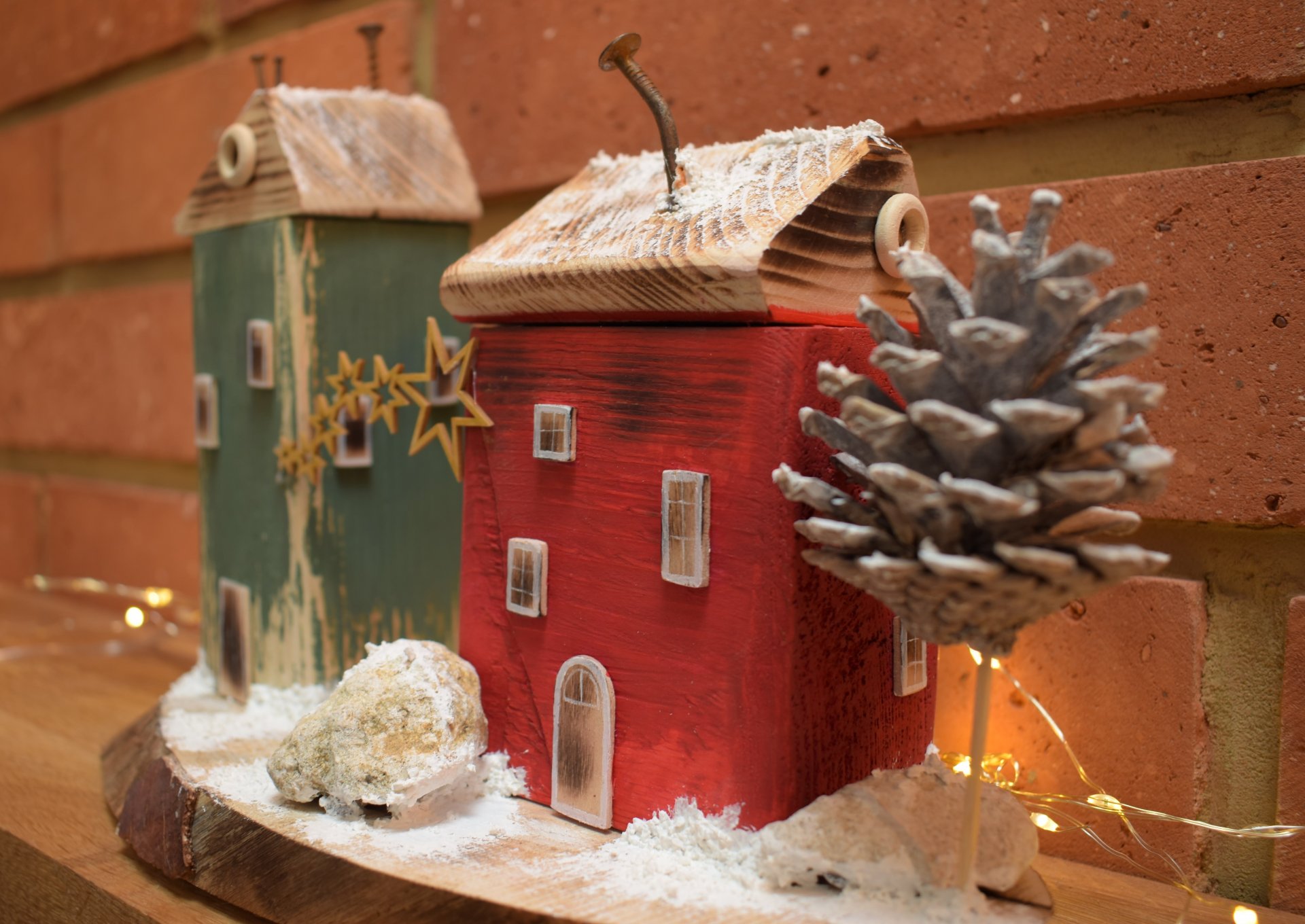 Ręcznie wykonywane domki i mini miasteczka z naturalnych materiałów. Drewno , metal , kamień. Zdobione farbami akrylowymi.