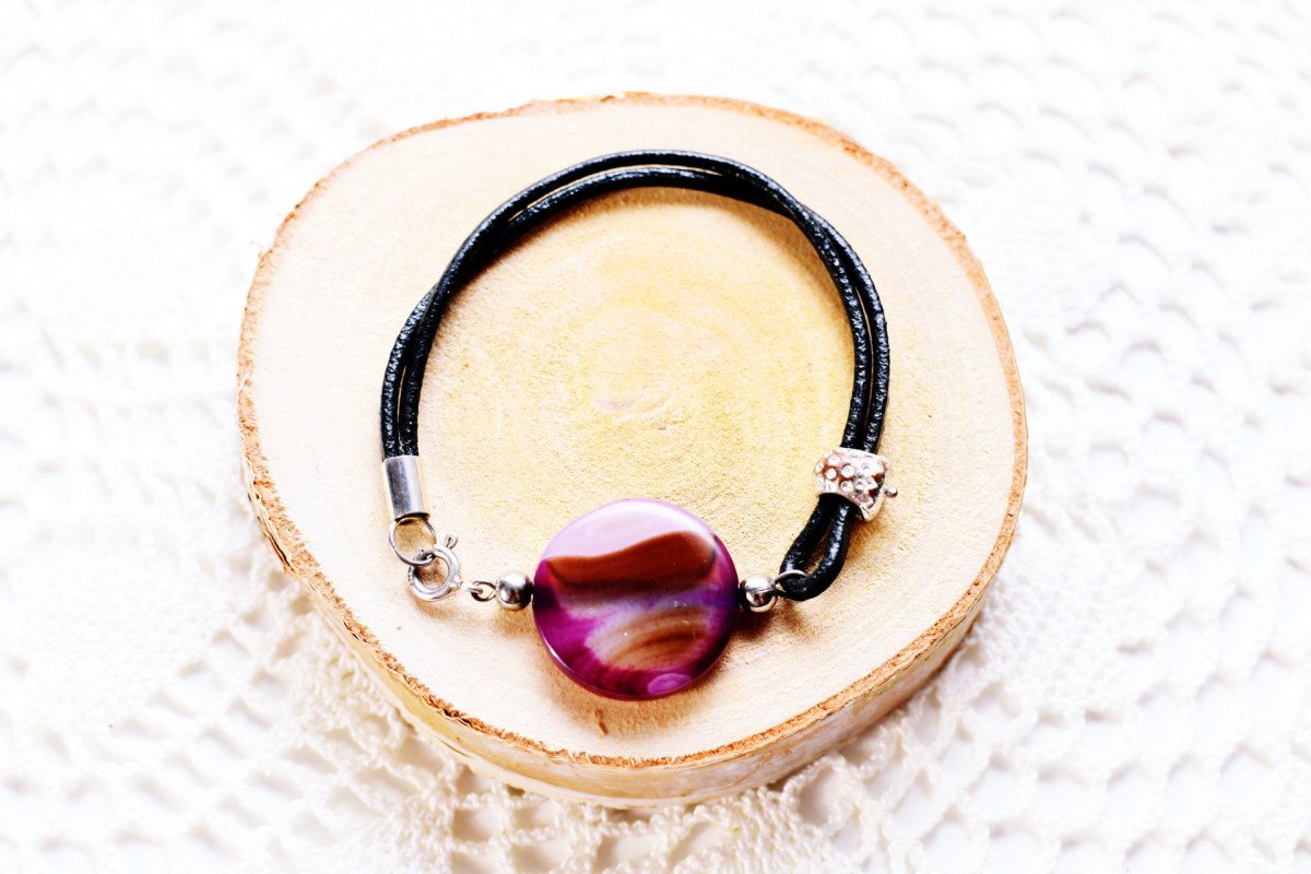 Bransoletka wykonana z czarnego rzemienia jubilerskiego, ozdobiona dużym, płaskim ametystem o średnicy 3cm.