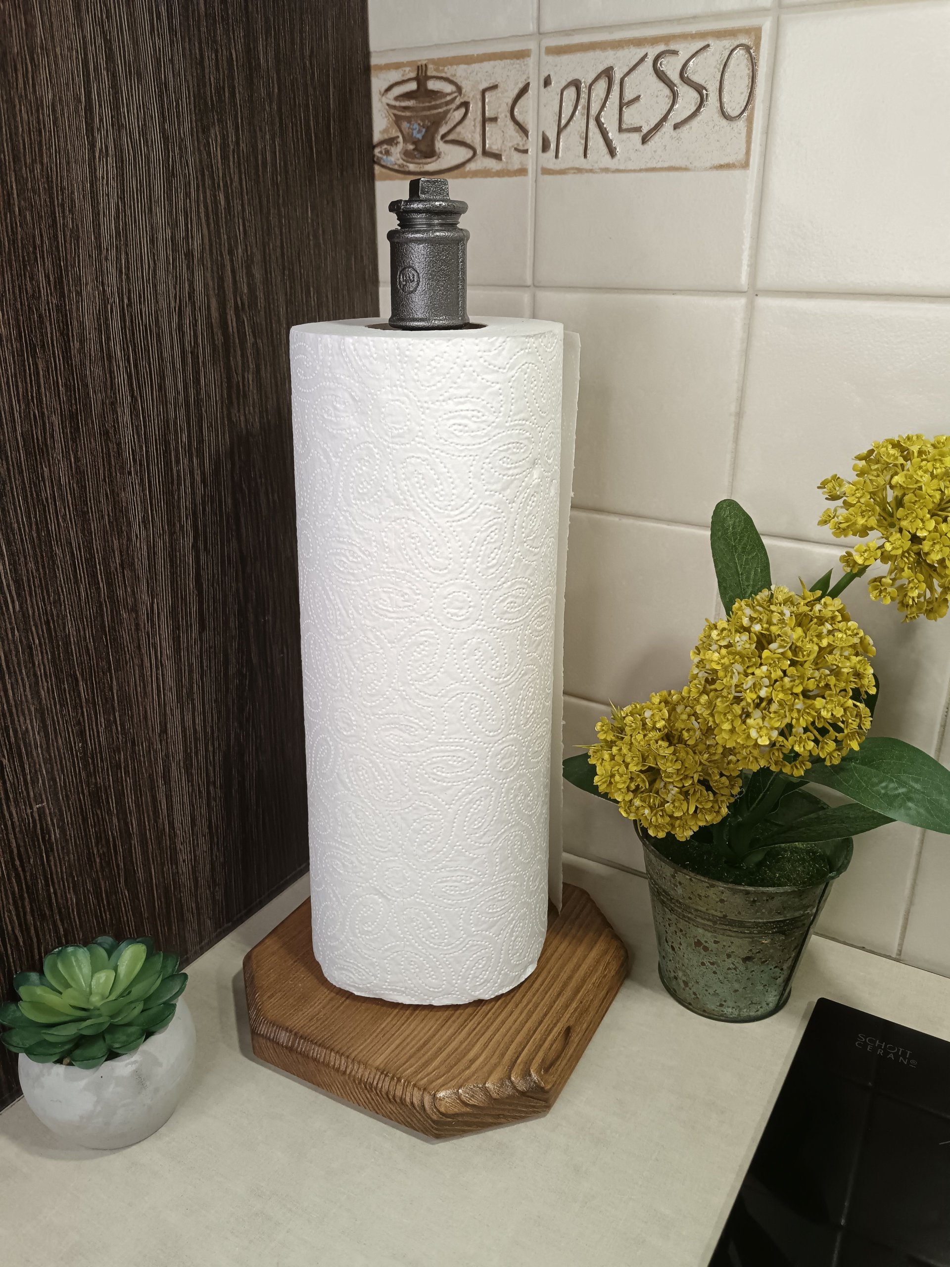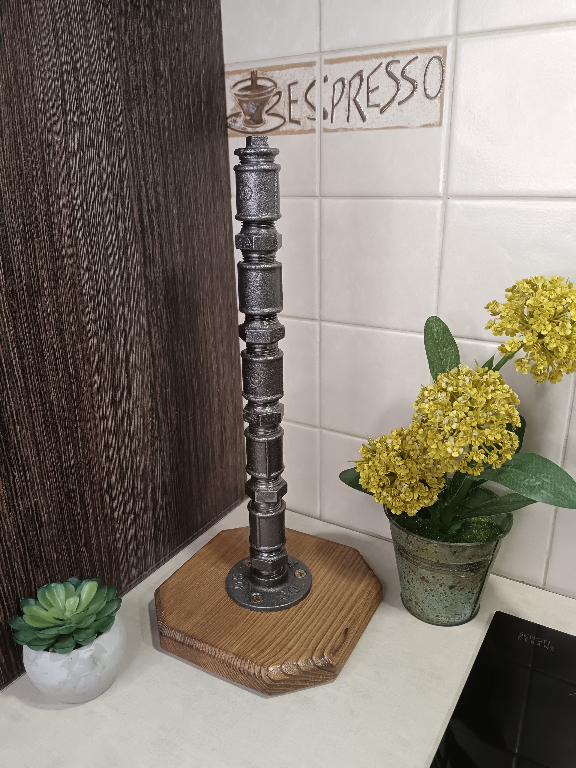 - Przedstawiamy ręcznie wykonany stojak na papier kuchenny w stylu loftowym – połączenie postarzanego, szczotkowanego drewna oraz metalowej armatury, która nadaje mu industrialny charakter.