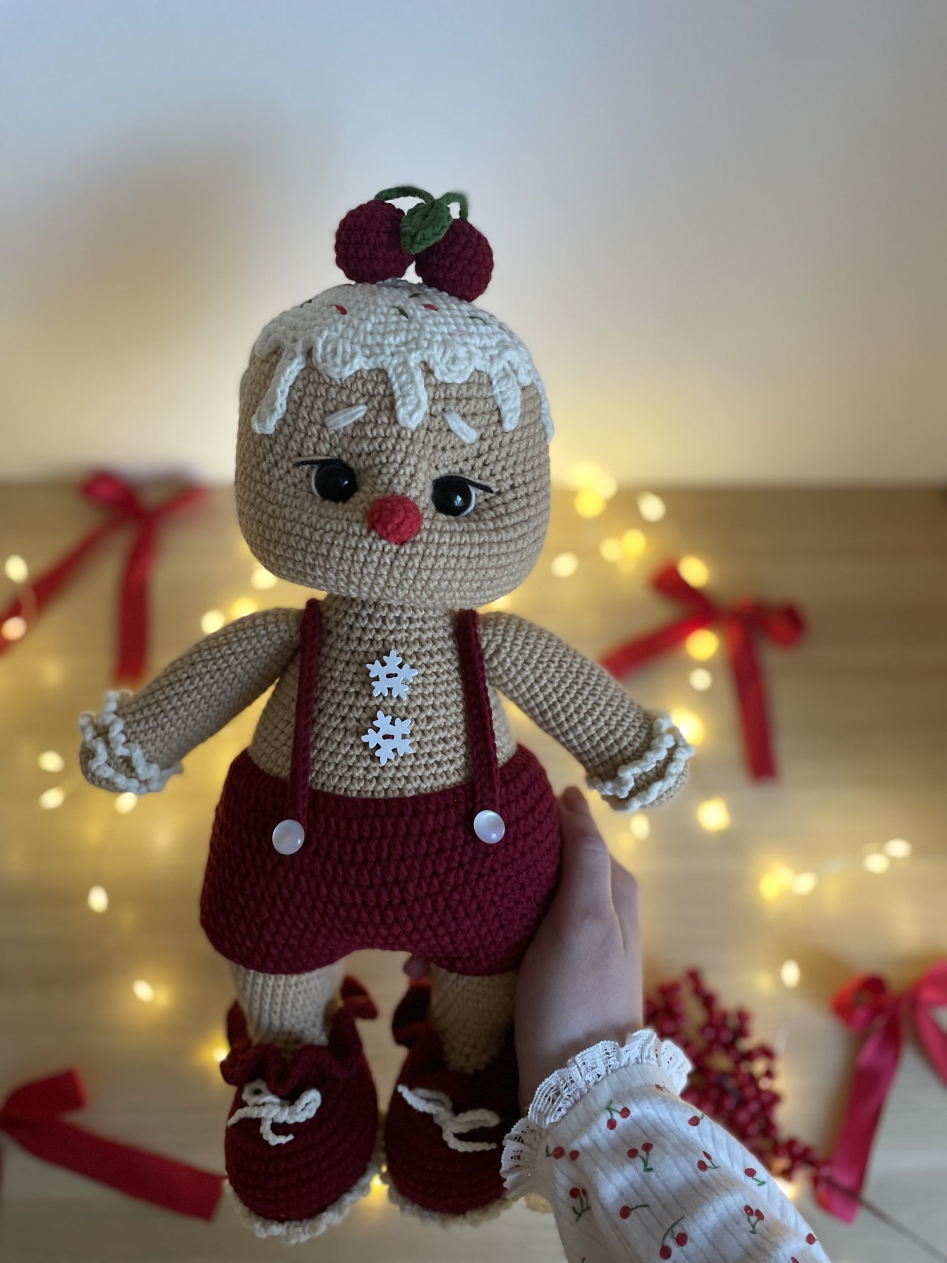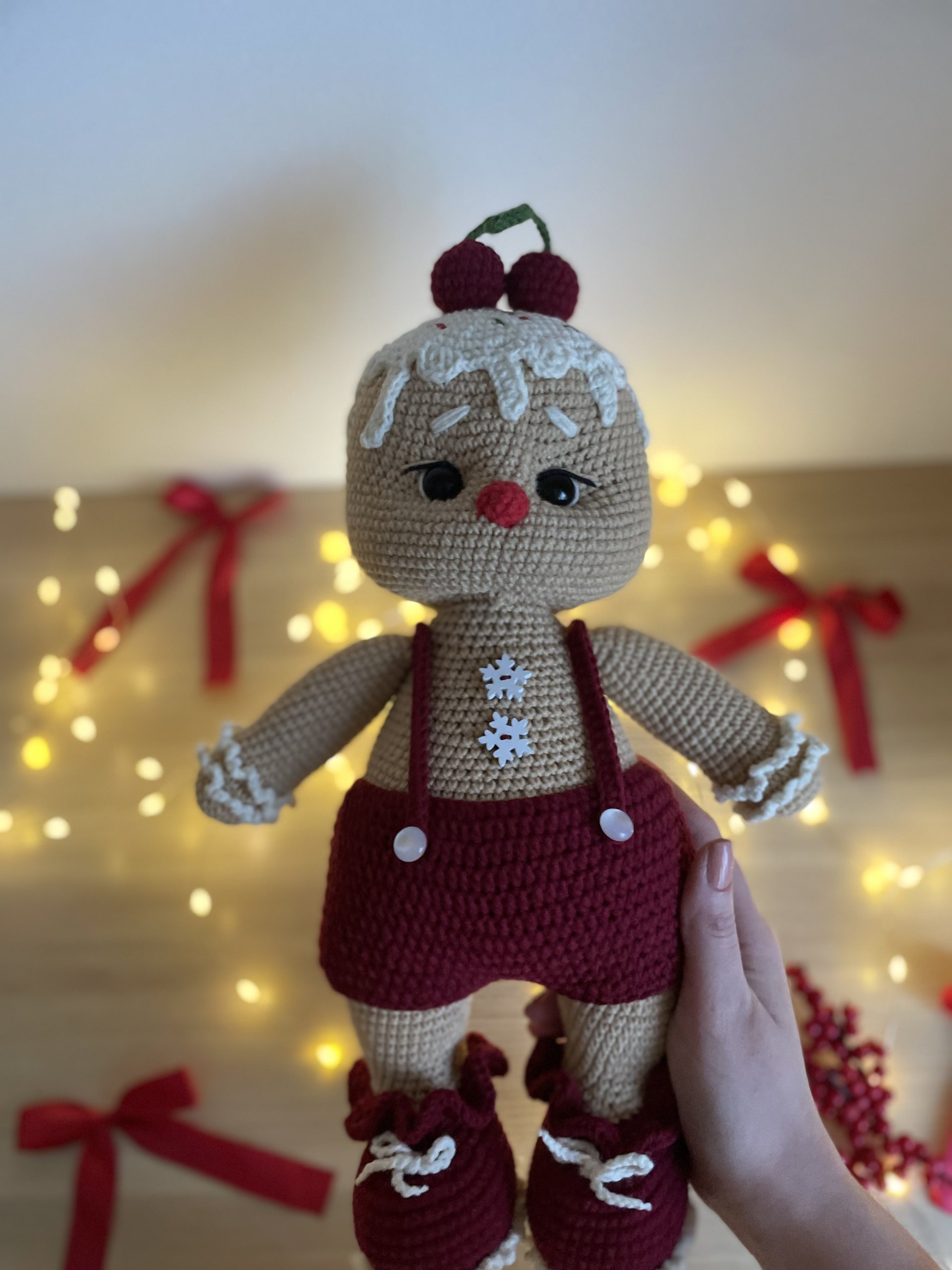 Mały, ręcznie szydełkowany pierniczek z uroczym uśmiechem i starannymi świątecznymi detalami.