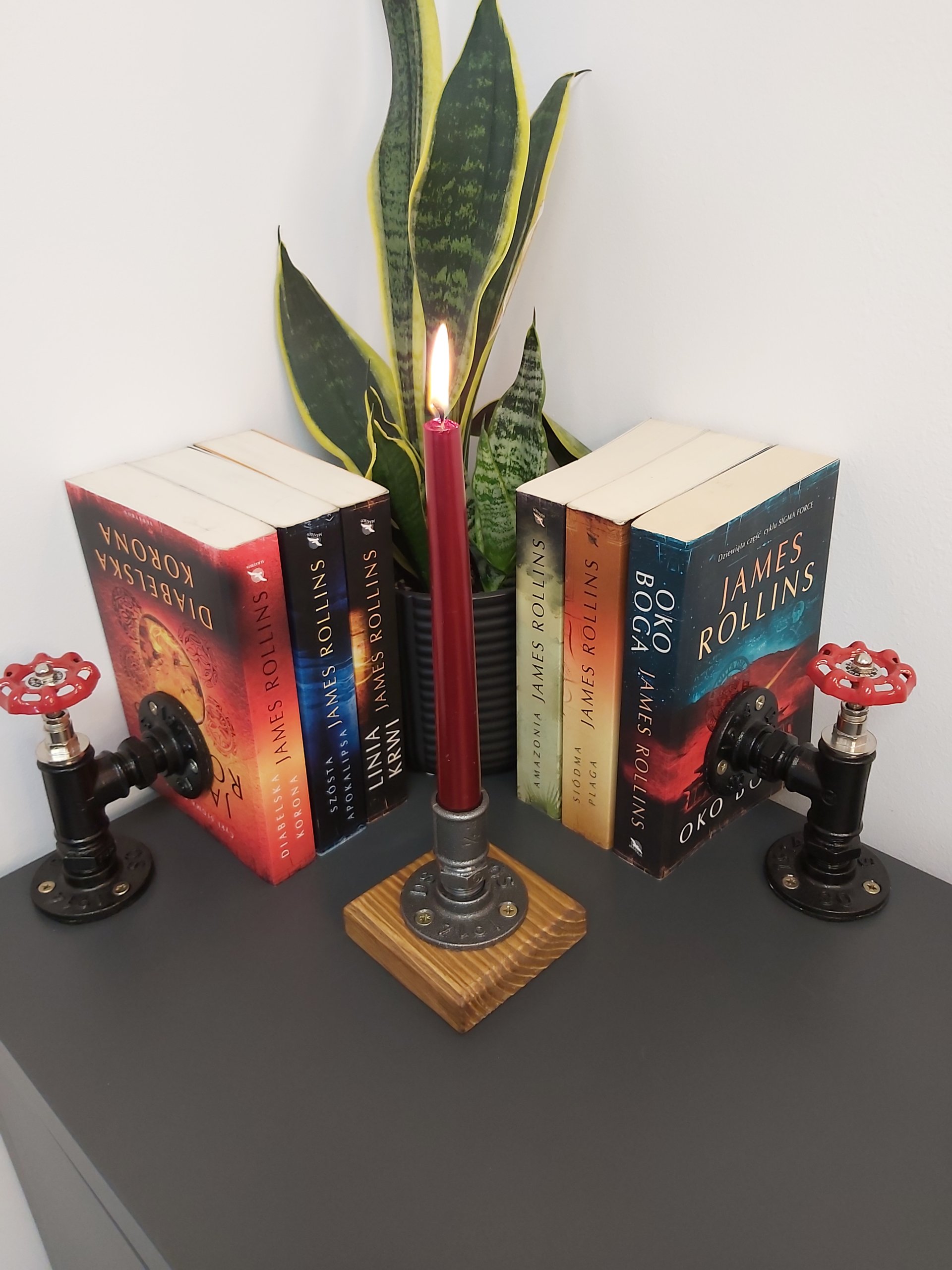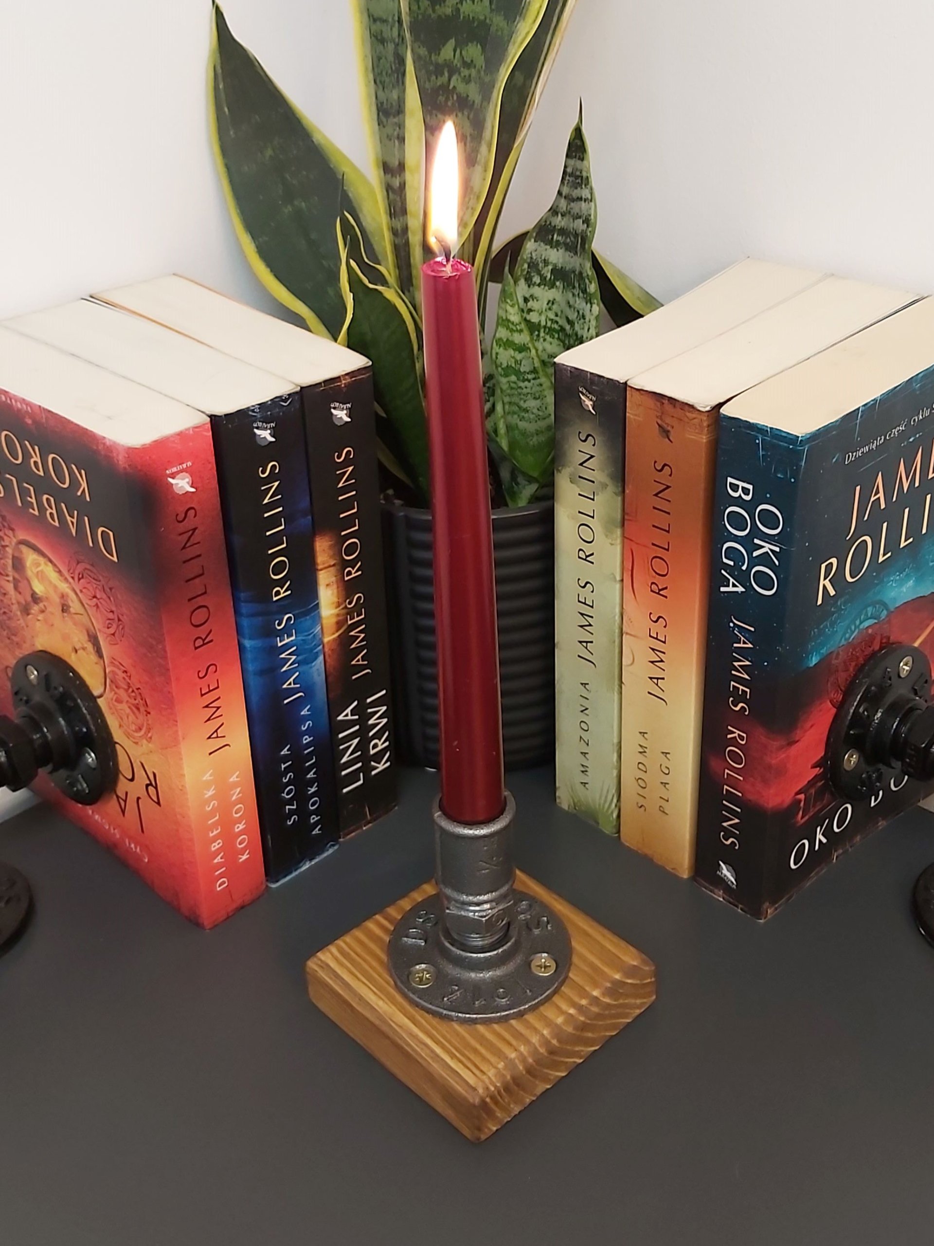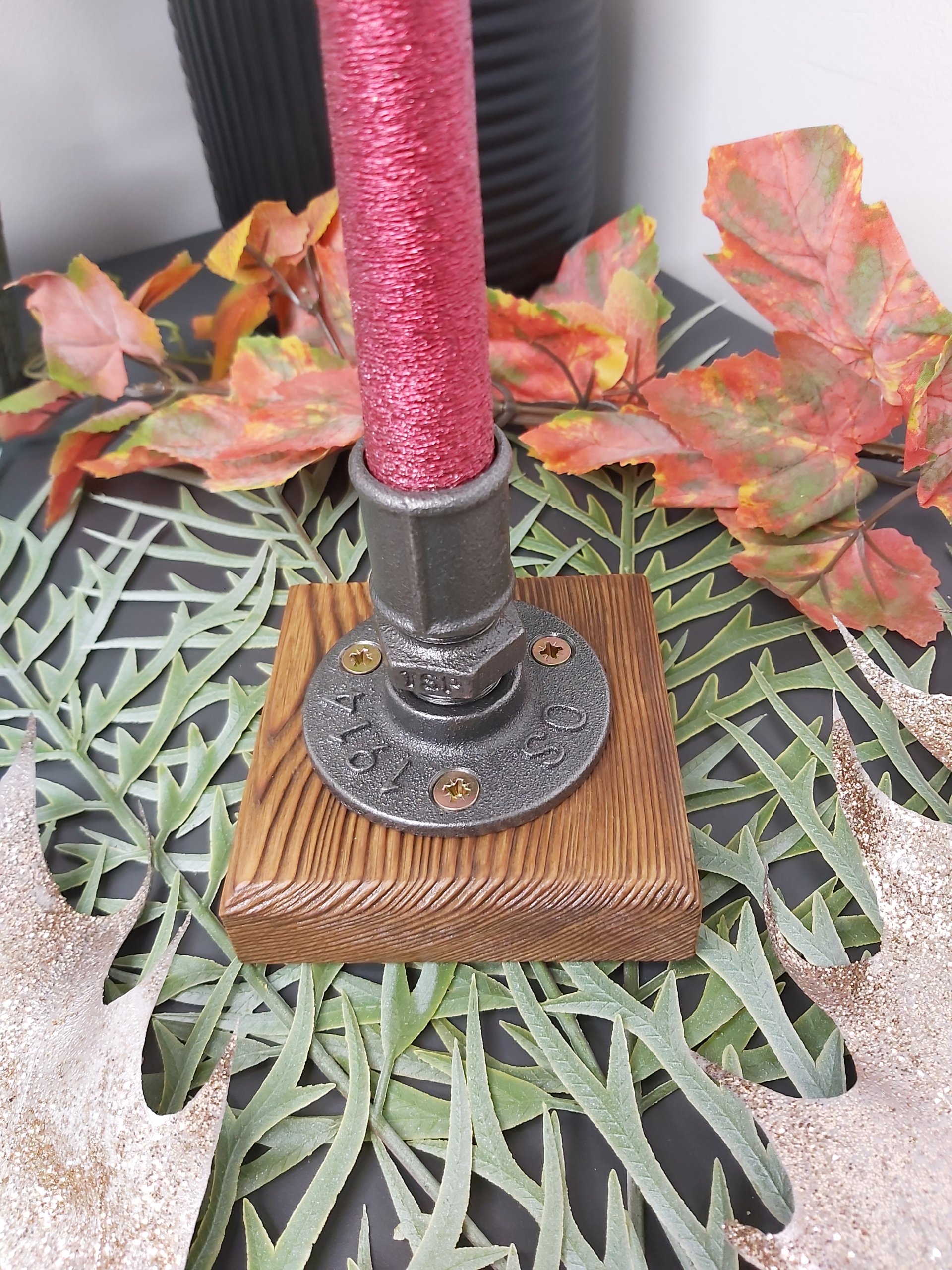 - Stylowy, ręcznie wykonany świecznik loftowy w Pracowni 3MP-CAD, łączący surowy charakter industrialnej armatury stalowej z ciepłem postarzanego, lakierowanego drewna.