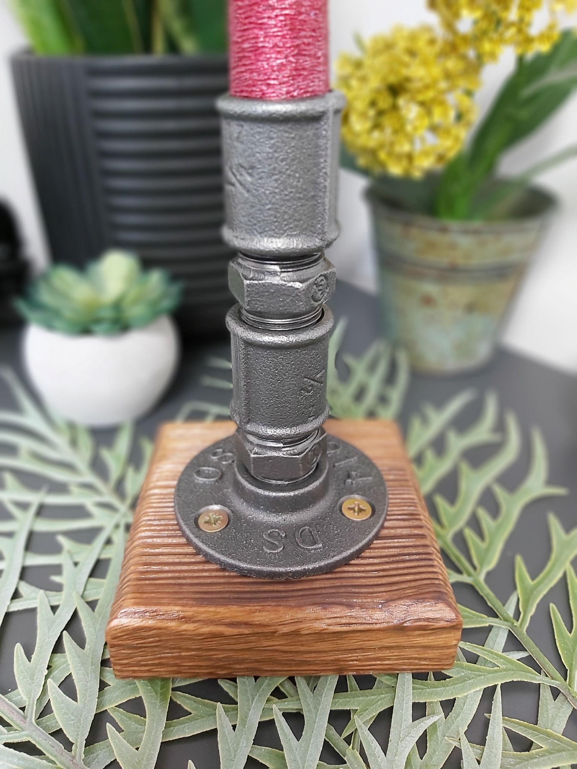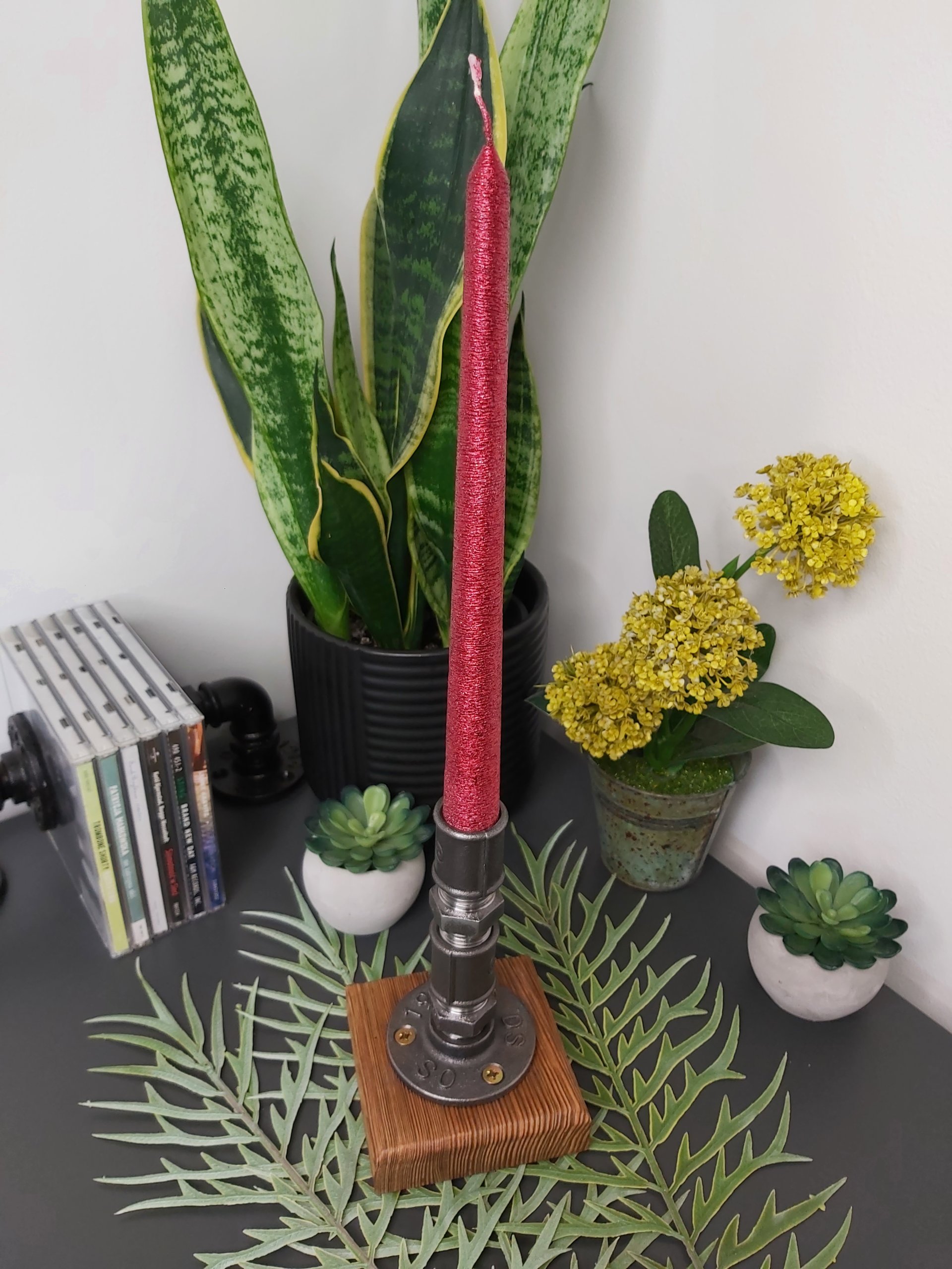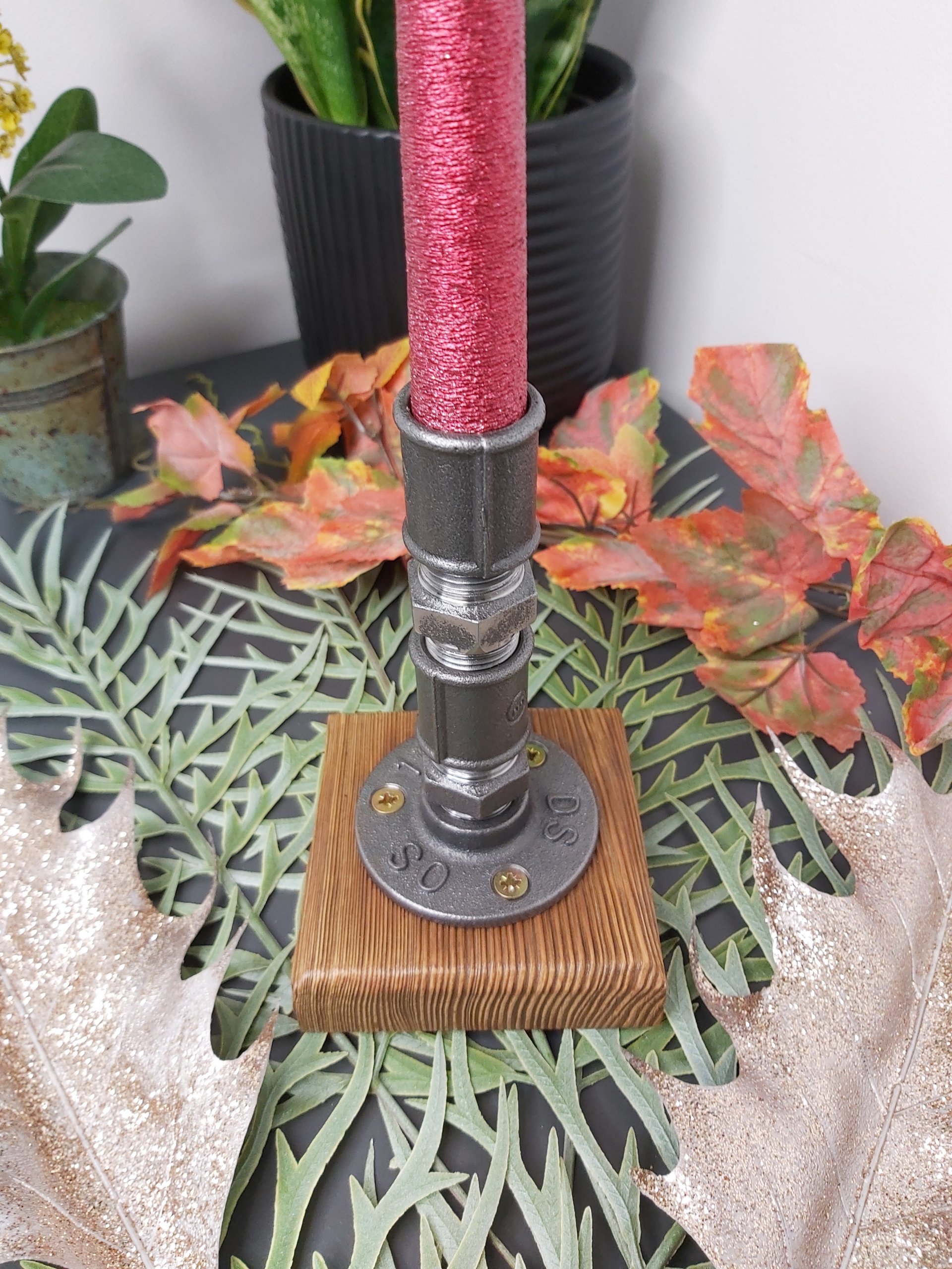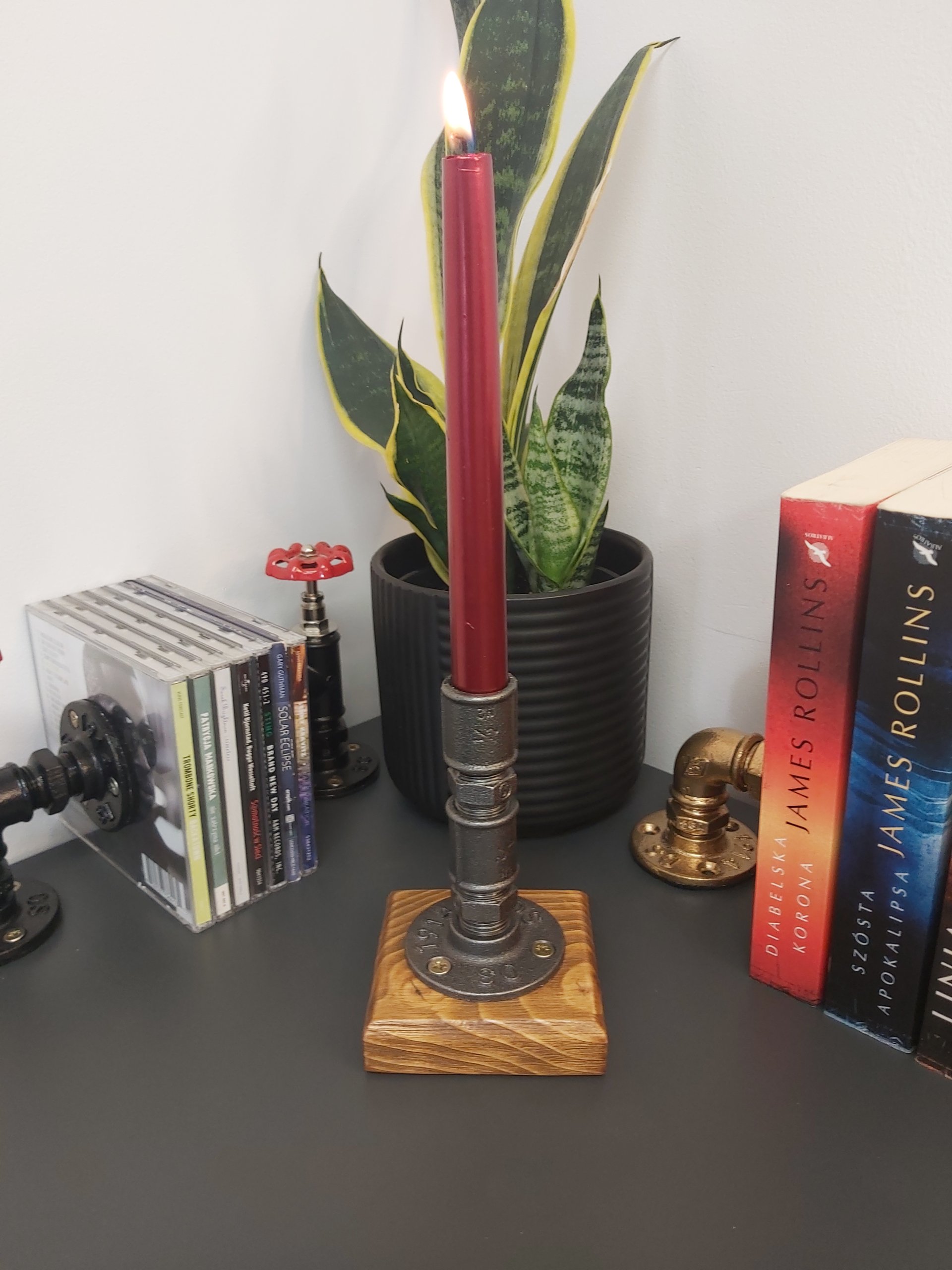 - Stylowy, ręcznie wykonany świecznik loftowy w Pracowni 3MP-CAD, łączący surowy charakter industrialnej armatury stalowej z ciepłem postarzanego, lakierowanego drewna.