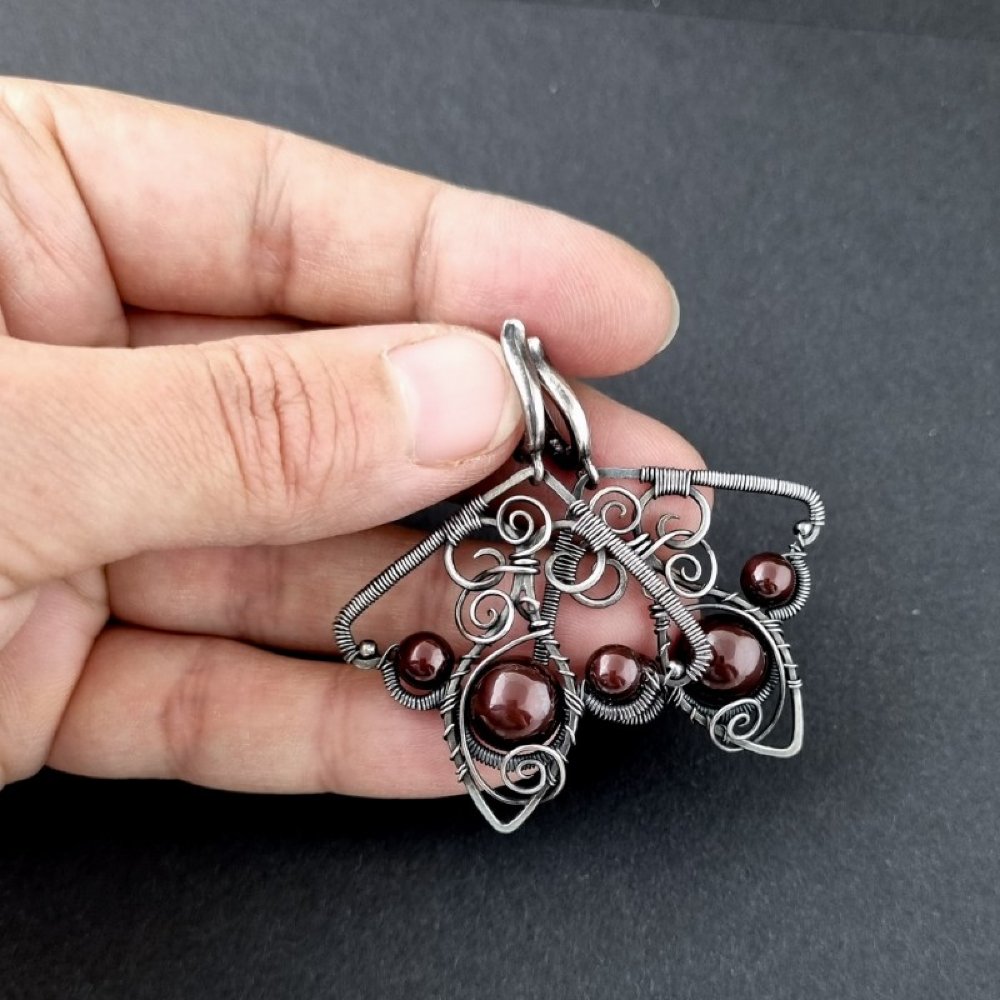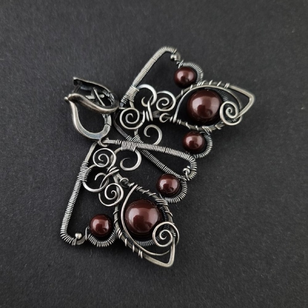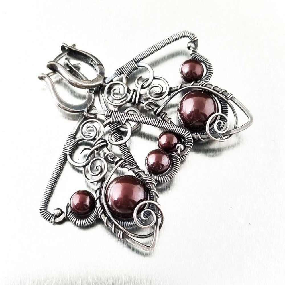 Niebanalne, zakręcone, duże kolczyki wykonane ze srebra 999, 930 i 925. Drut ręcznie formowany, lutowany, młotkowany - utkany w spójną całość z dodatkiem pereł Swarovski 10mm i 5mm w kolorze maroon [kasztan]. Kolczyki zoksydowane [utlenione / przyciemnione] do koloru stalowego i wypolerowane na wysoki połysk. Ekskluzywny dodatek, którego nie ma nikt. Na życzenie mogę wykonać podobne [różniące się kilkoma detalami] z perłami w innym kolorze, bądź też z wybranym kamieniem. Możliwość wymiany zapięć na srebrne: sztyfty lub klipsy [proszę o kontakt przed zakupem]. Długość kolczyków: 4,5cm. W najszerszym miejscu: 4cm. Biżuterię pakuję w eleganckie pudełeczko.