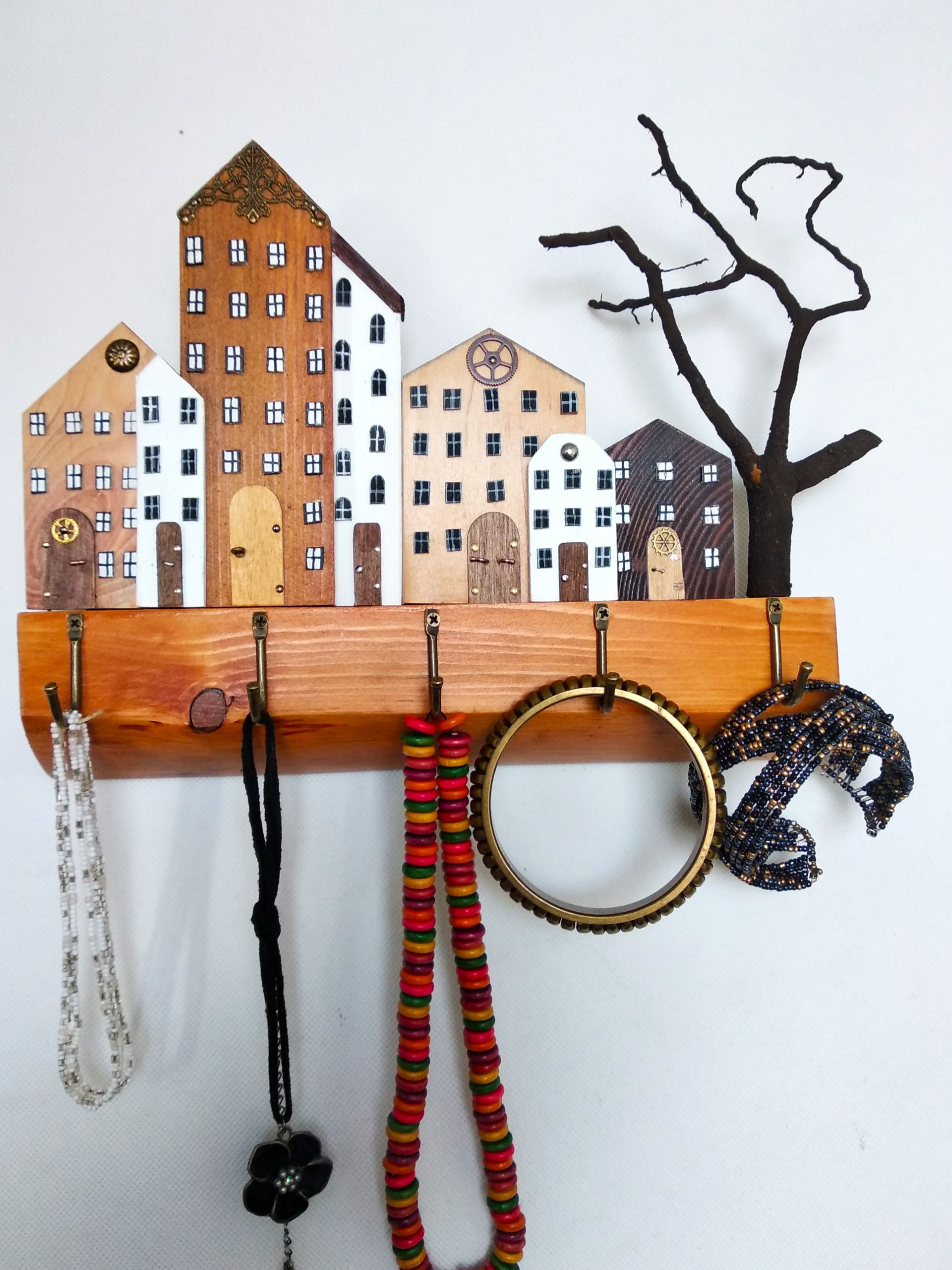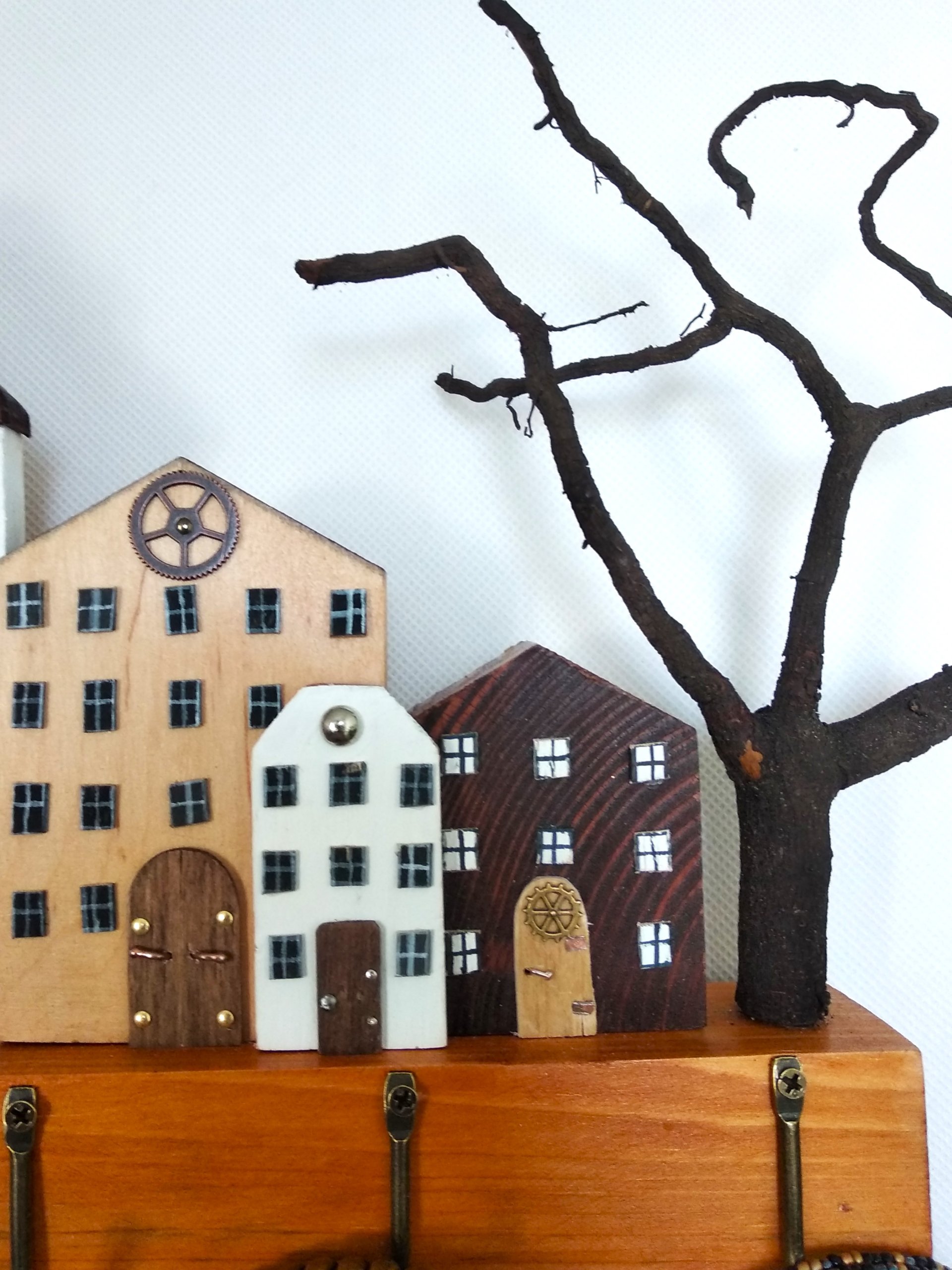 Praktyczny i estetyczny sposób na przechowywanie kluczy w jednym miejscu. Pięć haczyków pozwala wygodnie odwiesić klucze domowe, samochodowe czy zapasowe, dzięki czemu koniec z porannym poszukiwaniem. Wieszak wykonany z drewna jest trwały, a jednocześnie pełni funkcję dekoracyjną – jego forma przypomina urokliwą uliczkę kamieniczek, które wprowadzają ciepło i wyjątkowy charakter do przedpokoju. To połączenie codziennej wygody z pięknem rękodzieła, które wyróżnia się na tle zwykłych organizerów.