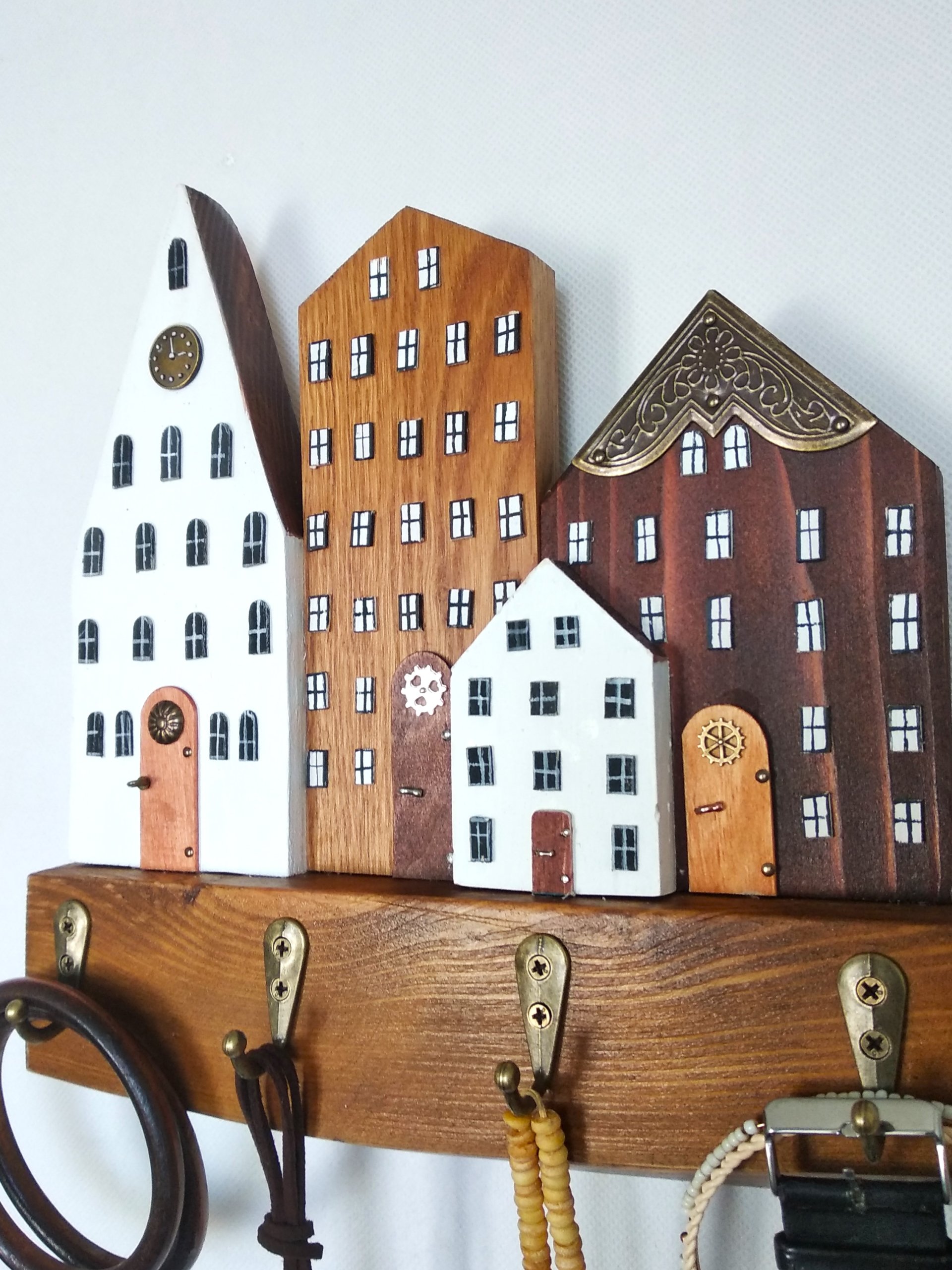 Subtelny i praktyczny element wyposażenia, który pomaga utrzymać porządek w domu. Wyposażony w cztery haczyki, sprawdzi się do przechowywania kluczy, biżuterii czy drobnych akcesoriów. Dzięki temu codzienne przedmioty zawsze będą pod ręką, a Ty zyskasz spokój i porządek w przestrzeni. Drewniana forma, stylizowana na rząd domków, wnosi do wnętrza przytulny klimat, a jednocześnie pozostaje trwała i funkcjonalna. To rozwiązanie, które łączy praktyczność z charakterem rękodzieła, nadając wnętrzu niepowtarzalny akcent.