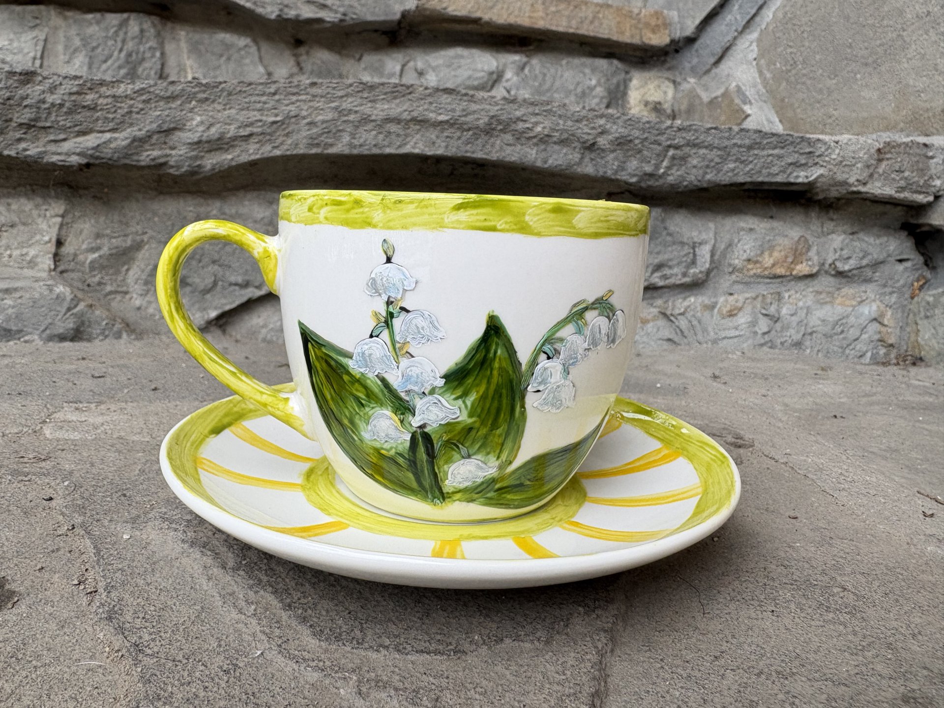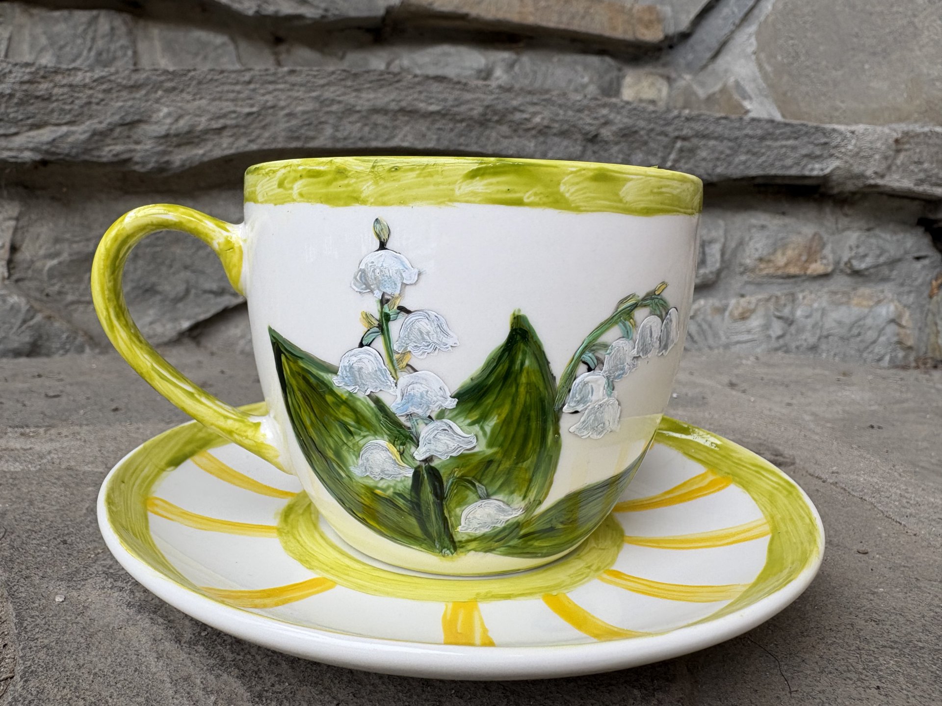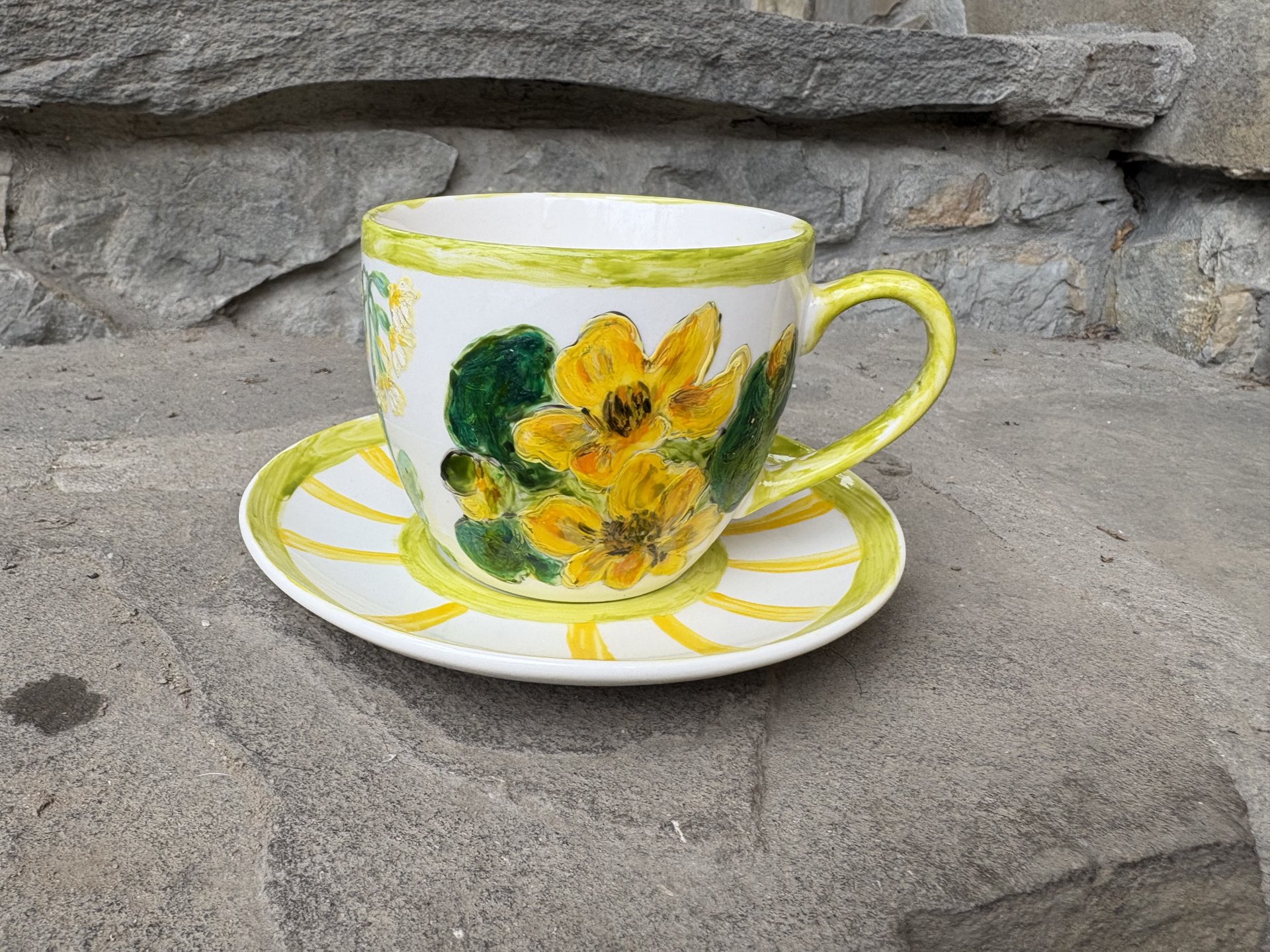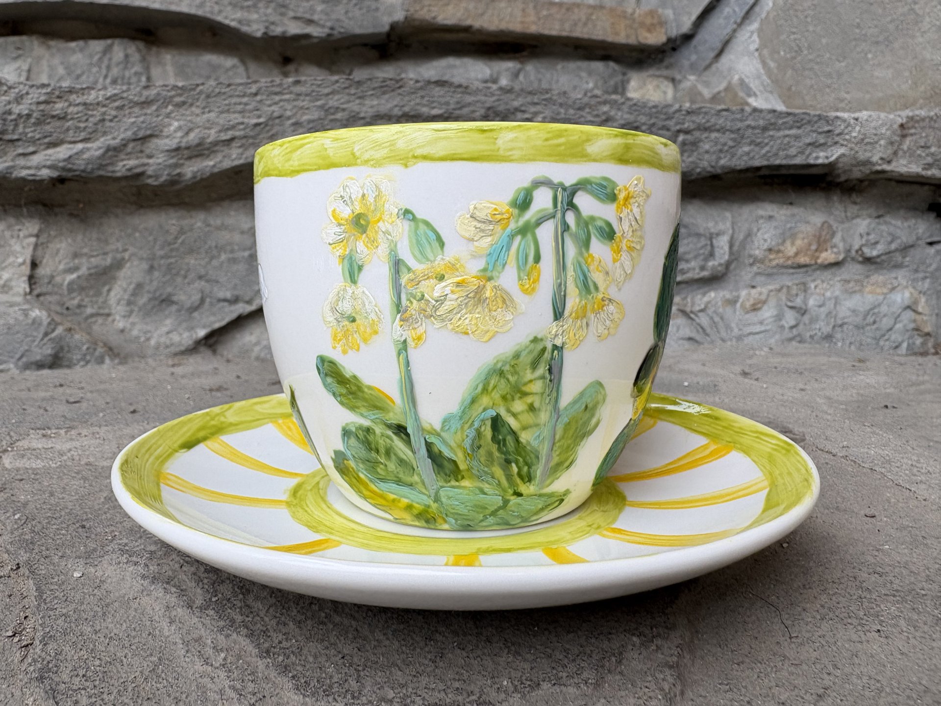 Porcelanowa filiżanka ze spodkiem o pojemności 250 ml ręcznie malowana farbami do porcelany i utrwalona termicznie.