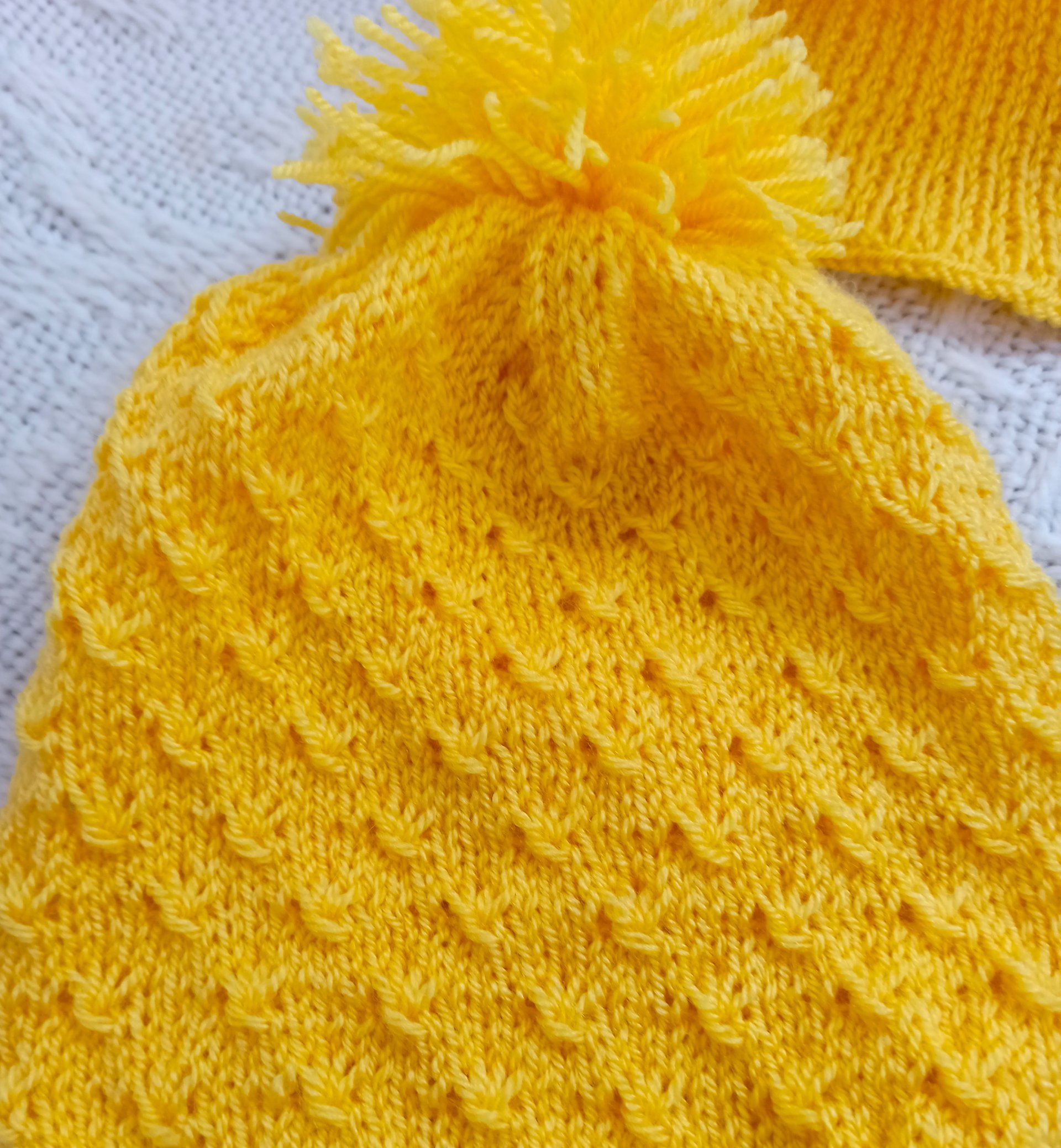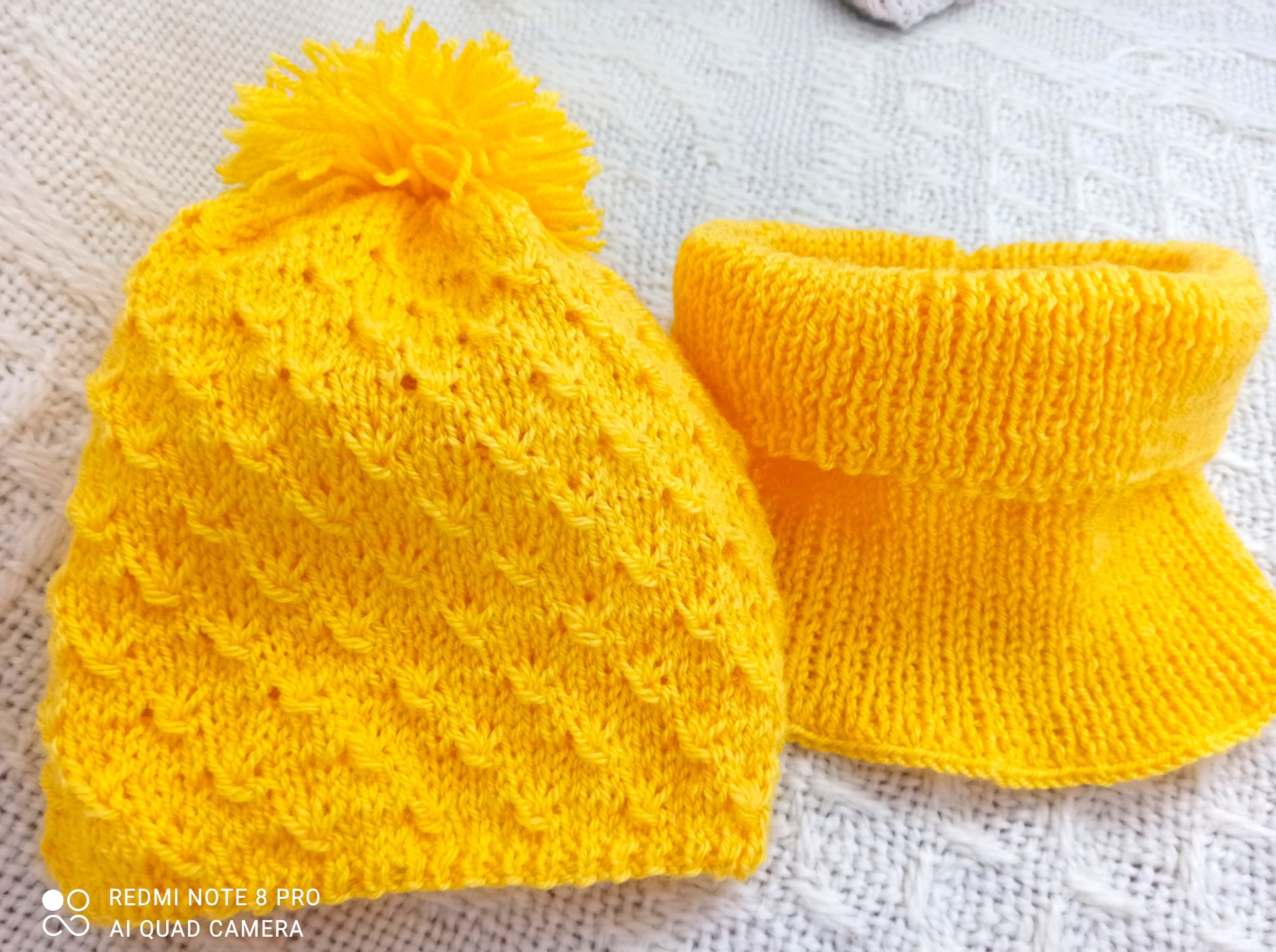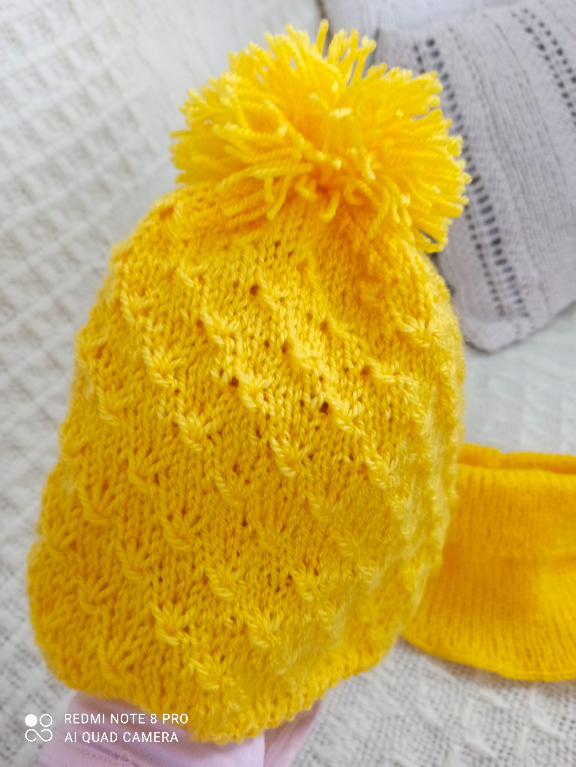 Komplet czapka i komi w kolorze żółtym wykonany z wełny akrylowej. Miła w dotyku, czapka z pomponem wykonana wzorem w kurze łapki, komin wzorem ściągaczowym. Wymiary: wysokość czapki 42 cm, obwód do 60 cm, komin obwód bez rozciągania 40 cm. Ładnie się układa dzięki zastosowanym splotom, można komin nosić na wierzch jak i pod spód ubrania. Średniej grubości, estetycznie wykonany. Zalecam pranie ręczne.
