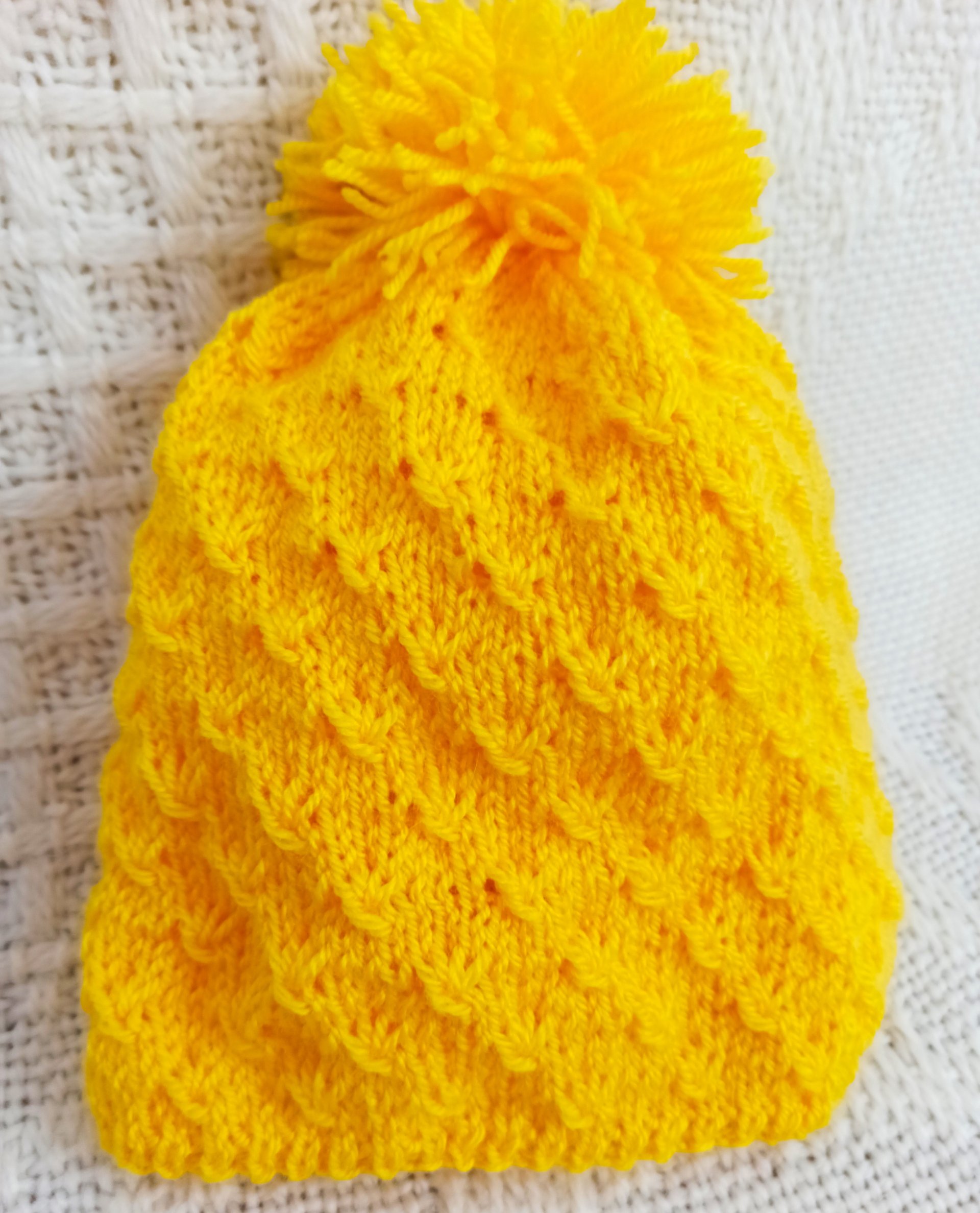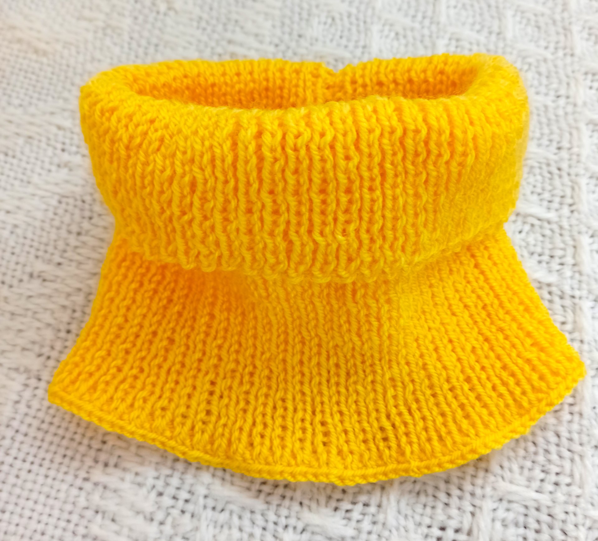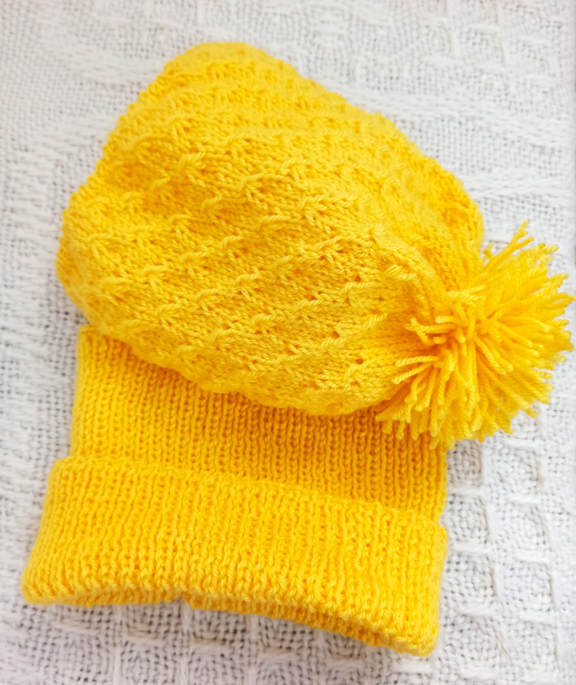 Komplet czapka i komi w kolorze żółtym wykonany z wełny akrylowej. Miła w dotyku, czapka z pomponem wykonana wzorem w kurze łapki, komin wzorem ściągaczowym. Wymiary: wysokość czapki 42 cm, obwód do 60 cm, komin obwód bez rozciągania 40 cm. Ładnie się układa dzięki zastosowanym splotom, można komin nosić na wierzch jak i pod spód ubrania. Średniej grubości, estetycznie wykonany. Zalecam pranie ręczne.